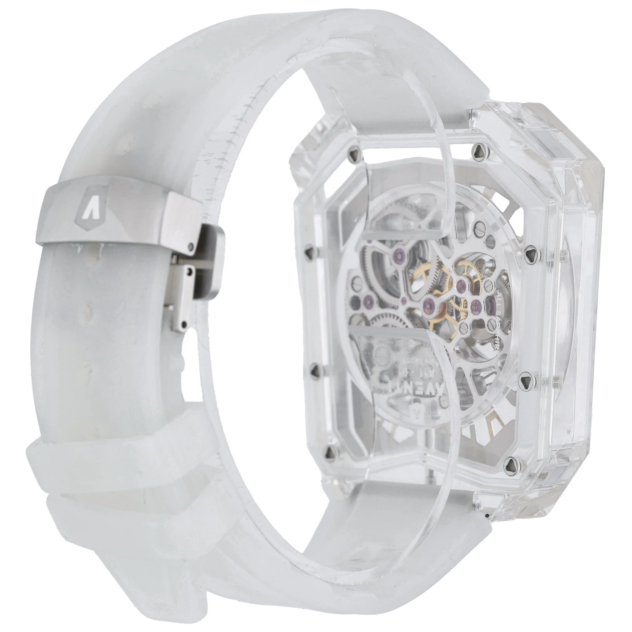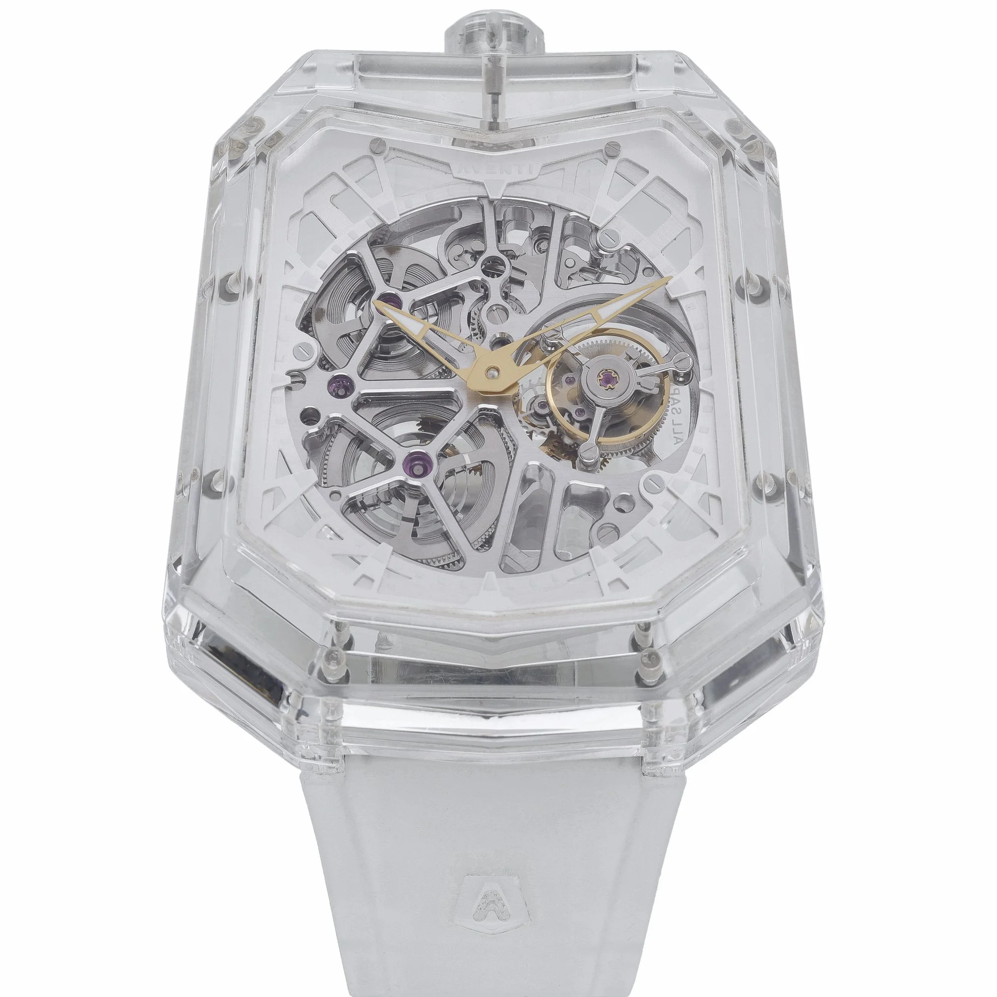 The Aventi A11 Tourbillon (A11-01) pairs cutting-edge design with haute horology, featuring a full sapphire crystal case and sapphire crystal glass that reveal a clear skeleton dial and its manual-wind tourbillon at work. At 48mm, this bold gents watch is fitted with a durable rubber strap and secure folding clasp, and offers 50M water resistance. Manufactured in 2022 and in excellent condition, it is supplied with its box and original papers, and is backed by a 2-year warranty. Enjoy next day delivery and shop with confidence with our 14-day return policy. BQ Ref: 53338.