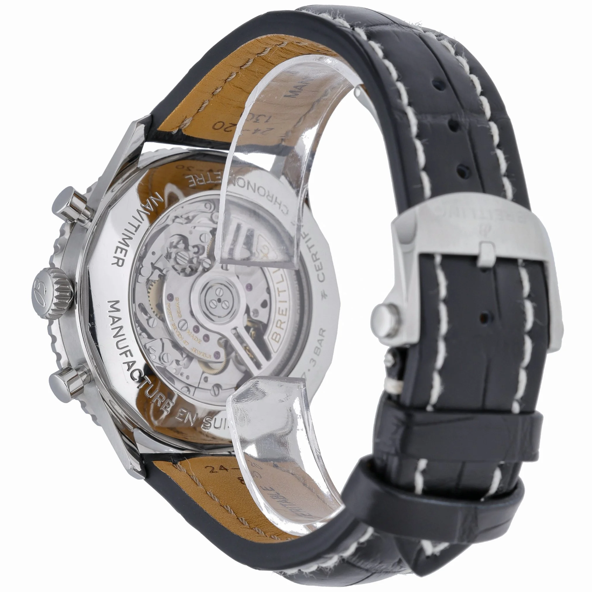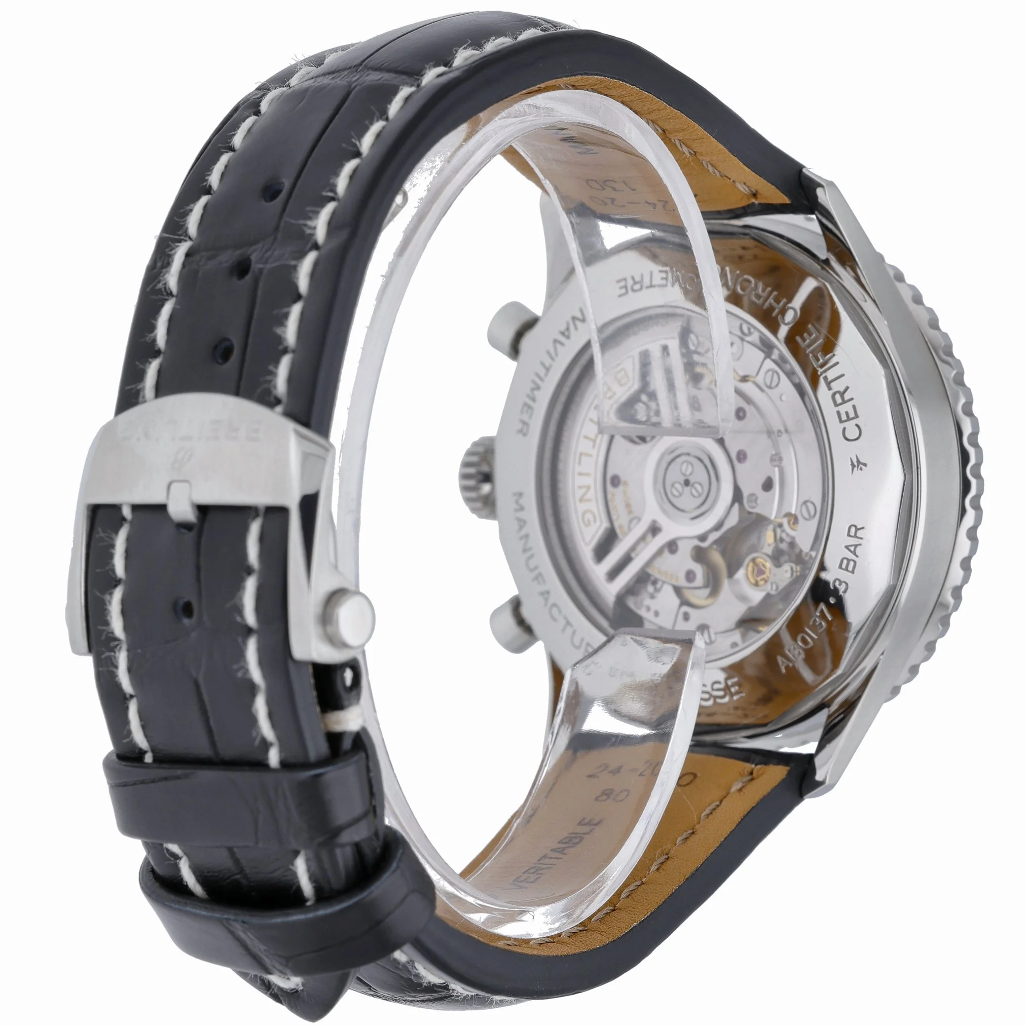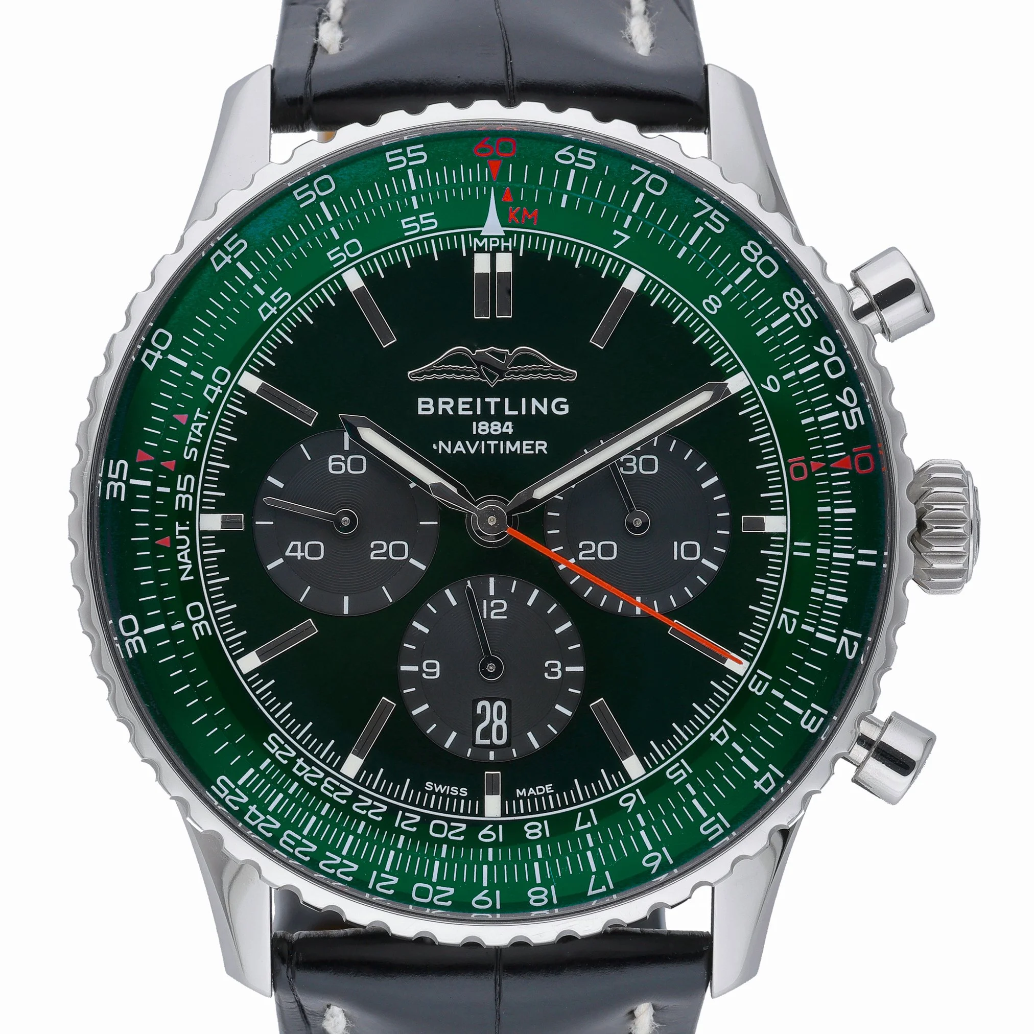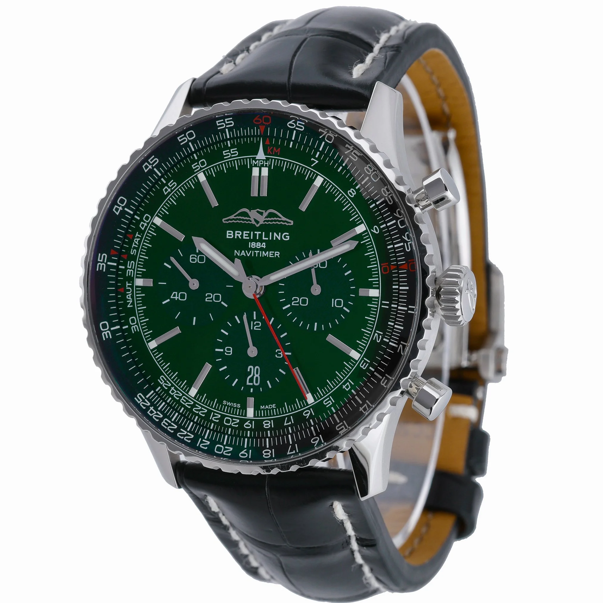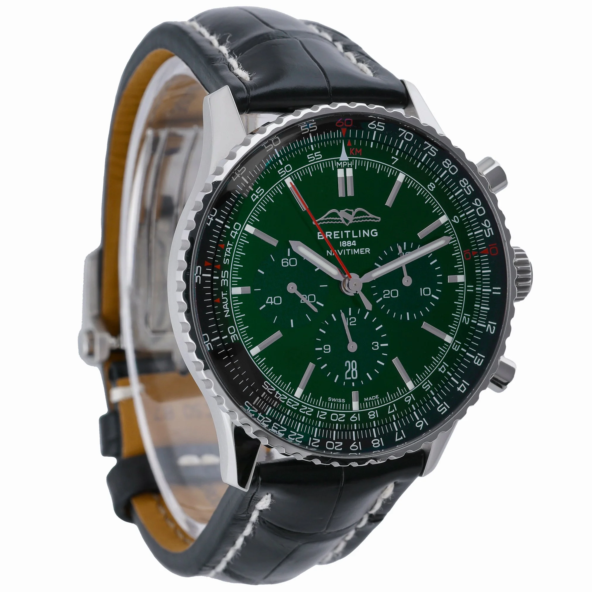 Experience an icon of aviation timekeeping with this Breitling Navitimer 1 B01 Chronograph 46 (Model AB0137), presented in excellent condition. The 46mm steel case frames a striking green chronograph dial beneath a sapphire crystal, complemented by a bidirectional rotatable bezel for classic Navitimer functionality. Powered by an automatic movement, it’s paired with a leather strap and secure folding clasp for refined comfort. This gents’ 2022 example is water resistant to 30M and comes complete with its box and original papers. Supplied with a 2 Year Warranty, plus our 14 Day Return Policy and Prompt Delivery for added peace of mind. BQ Ref: 52847.