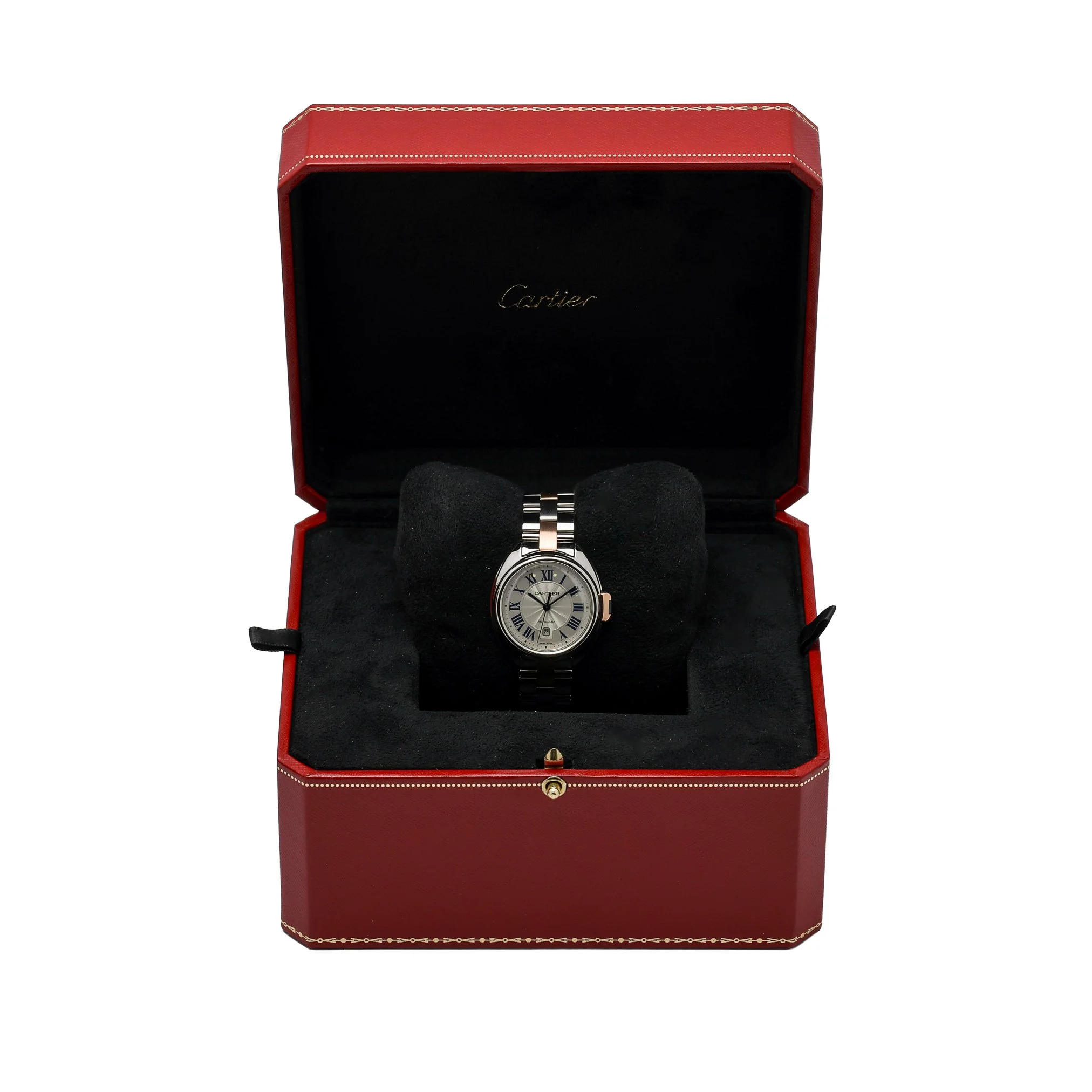 Refined and elegant, this ladies’ Clé de Cartier (Model 3867, BQ Ref 53088) showcases the collection’s signature key-shaped crown within a timeless 31mm case crafted in steel and rose gold. Its silver Roman dial sits beneath scratch-resistant sapphire crystal and is powered by a reliable automatic movement. A smooth bezel and integrated steel-and-rose-gold bracelet with folding clasp complete the sophisticated silhouette. Dated 2016 and presented in excellent condition, this watch is supplied with its Cartier box. Water resistant to 30m, it delivers everyday luxury with effortless versatility. Enjoy added confidence with our 2 Year Warranty, 14 Day Return Policy, and Prompt Delivery.