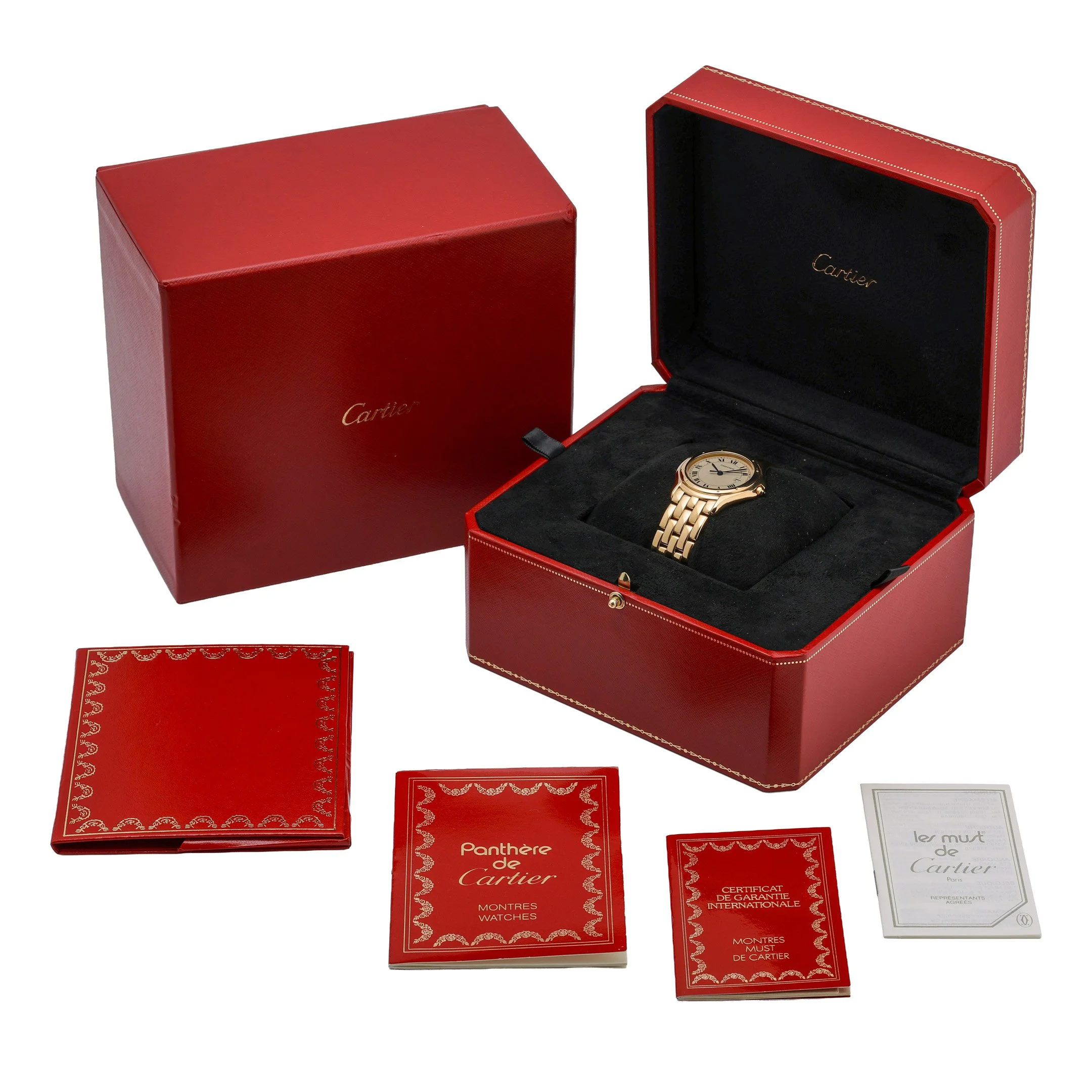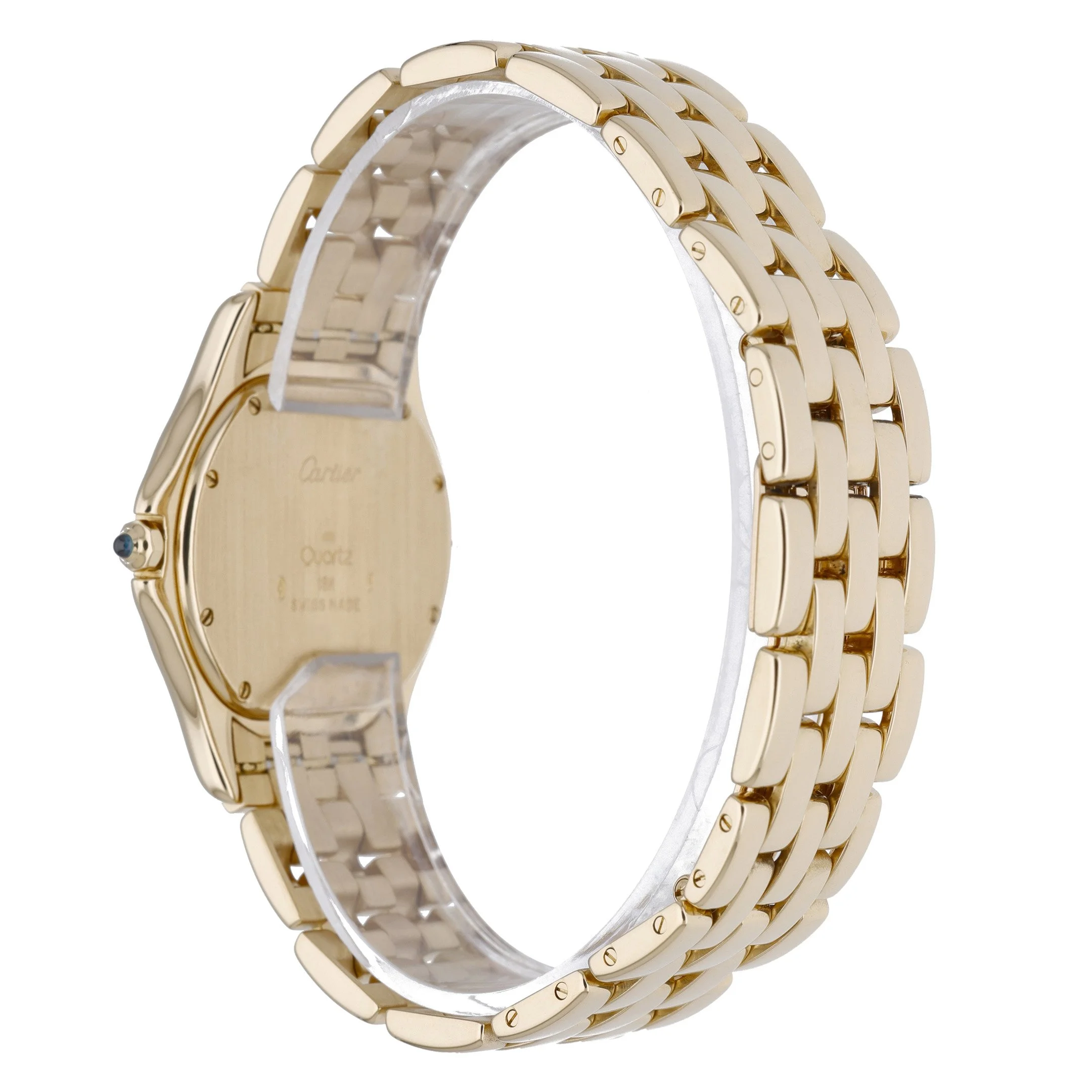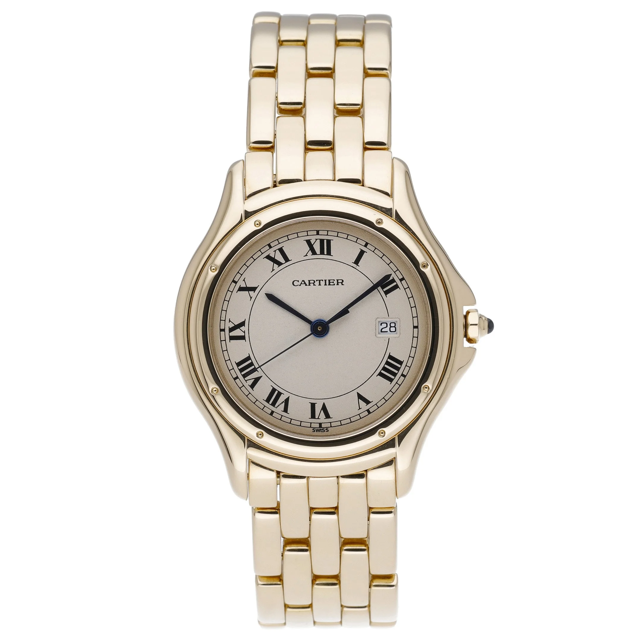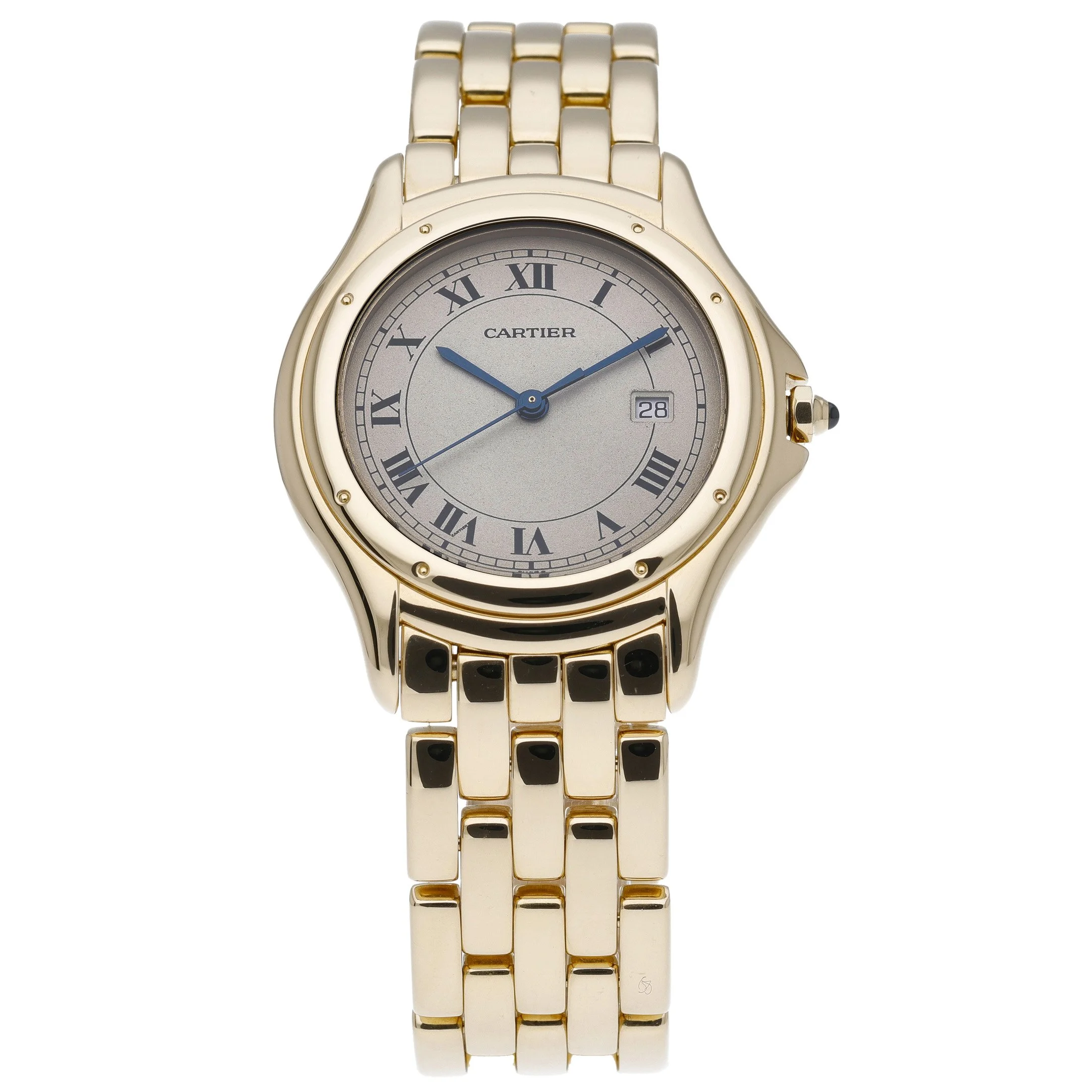 Crafted in 18ct yellow gold, this 33mm Cartier Cougar (Model 887904, BQ Ref 52830) embodies refined elegance with everyday versatility. The white Roman dial is framed by a plain bezel and protected by scratch‑resistant sapphire crystal, while an integrated 18ct yellow gold bracelet with folding clasp completes the classic Cartier aesthetic. Powered by a reliable quartz movement and water resistant to 30M, it offers effortless accuracy and confidence. Dated to 1994 and presented in excellent condition, this gents’ timepiece is supplied with its Cartier box and original papers. Your purchase includes a 2 Year Warranty, Prompt Delivery, and a 14 Day Return Policy for complete peace of mind. A timeless Cartier icon with enduring style, ready to wear and enjoy.