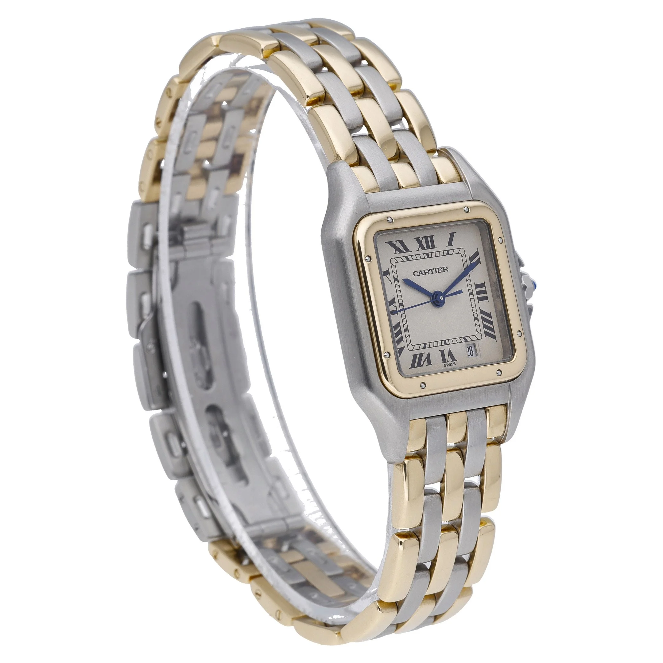 The Cartier Panthère (BQ Ref 49720, Model 83949) is a timeless midsize classic from 1990, crafted in elegant steel and yellow gold with a matching bracelet and secure folding clasp. Its 27mm case frames a refined white Roman dial protected by durable sapphire crystal, while a plain bezel underscores the watch’s clean, iconic lines. Powered by a reliable quartz movement and water resistant to 30M, it’s designed for effortless, everyday elegance. This example is in good condition and is supplied with its box. Enjoy confidence with a 2 Year Warranty, plus the convenience of Prompt Delivery and a 14 Day Return Policy.