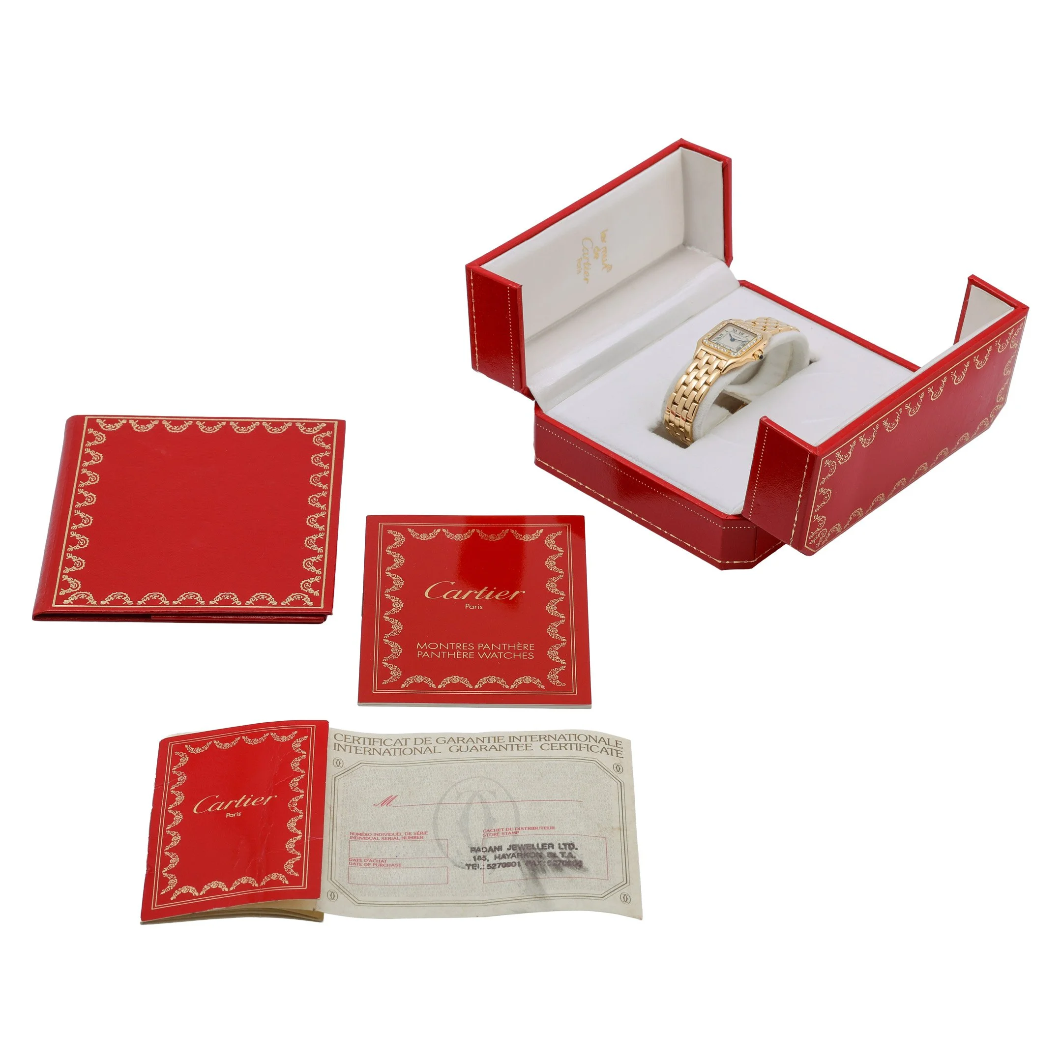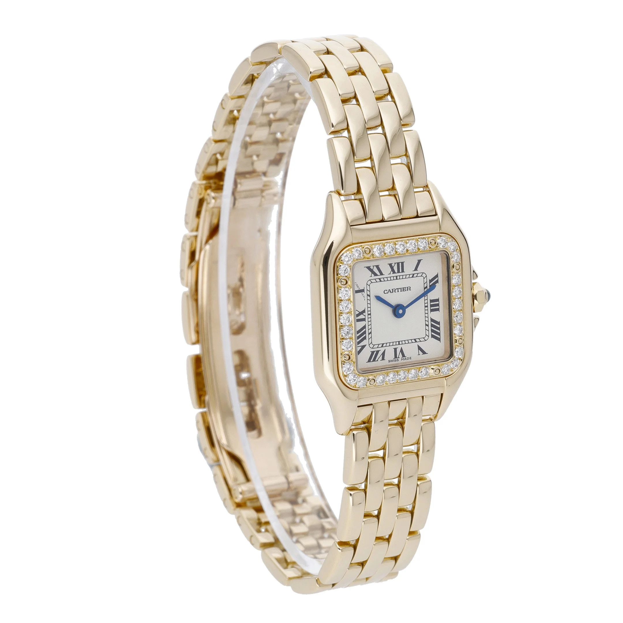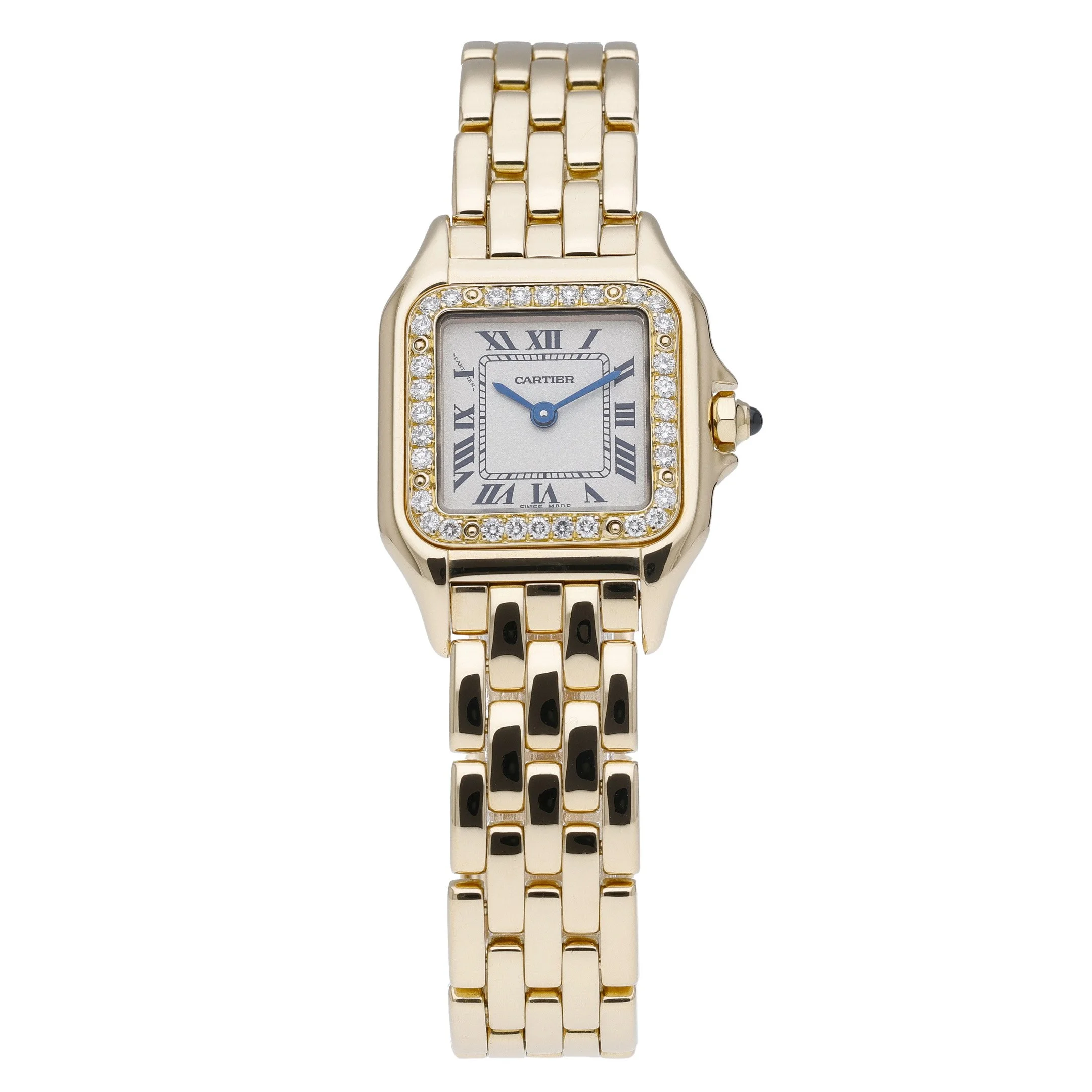 Iconic and irresistibly elegant, this Cartier Panthère (Model 1070) pairs timeless design with luxurious detail. Crafted in 18ct yellow gold, its 22mm x 30mm case and fluid bracelet are complemented by a diamond-set bezel that frames a white Roman dial with blued-steel hands. A sapphire crystal protects the face, while a precise quartz movement ensures effortless reliability. Presented in good condition and dating to 1998, this ladies’ timepiece features a secure folding clasp and 3 ATM water resistance for everyday confidence. Supplied with Cartier box and original papers, plus a 2 Year Warranty for peace of mind. BQ Ref: 52299. Prompt Delivery available and a 14 Day Return Policy.