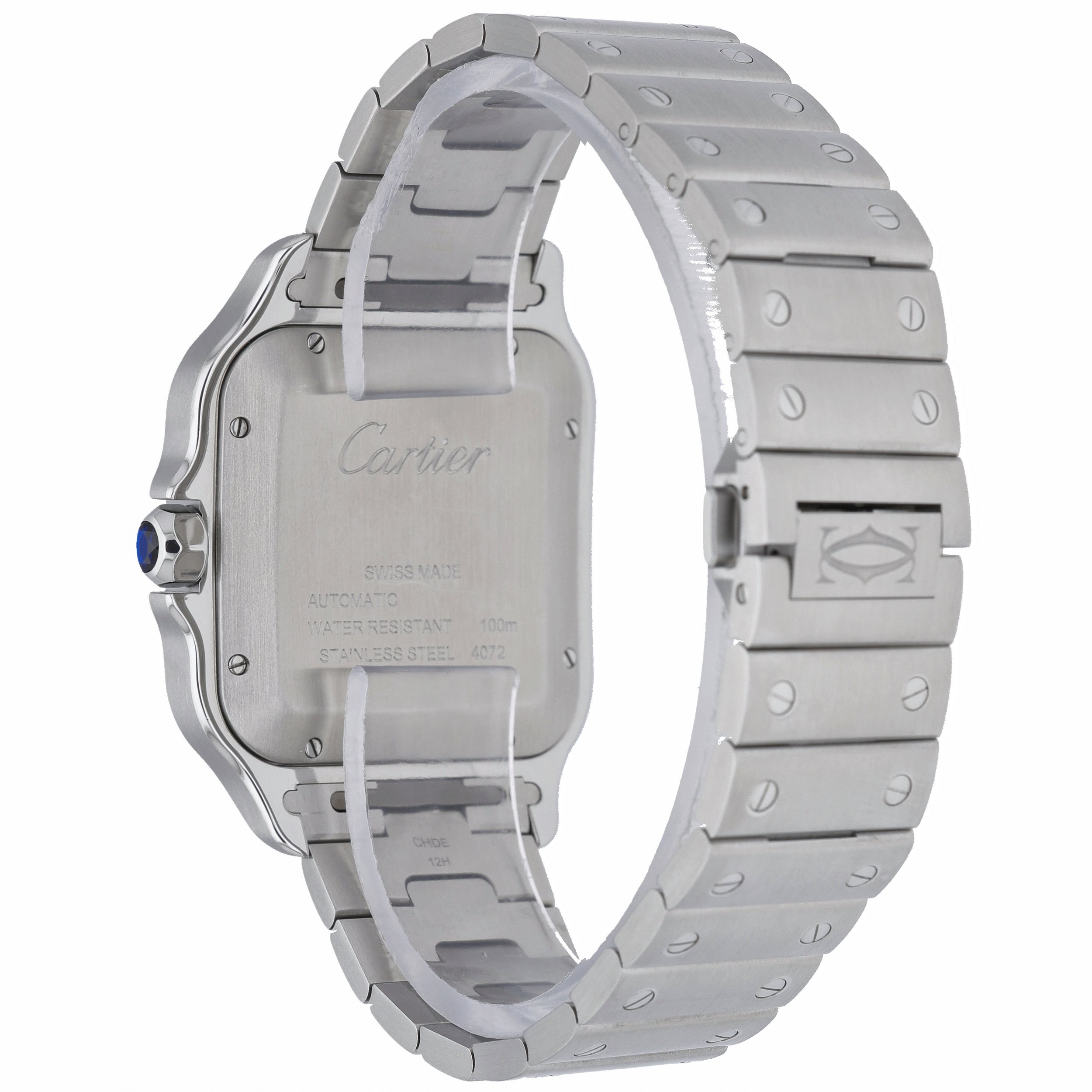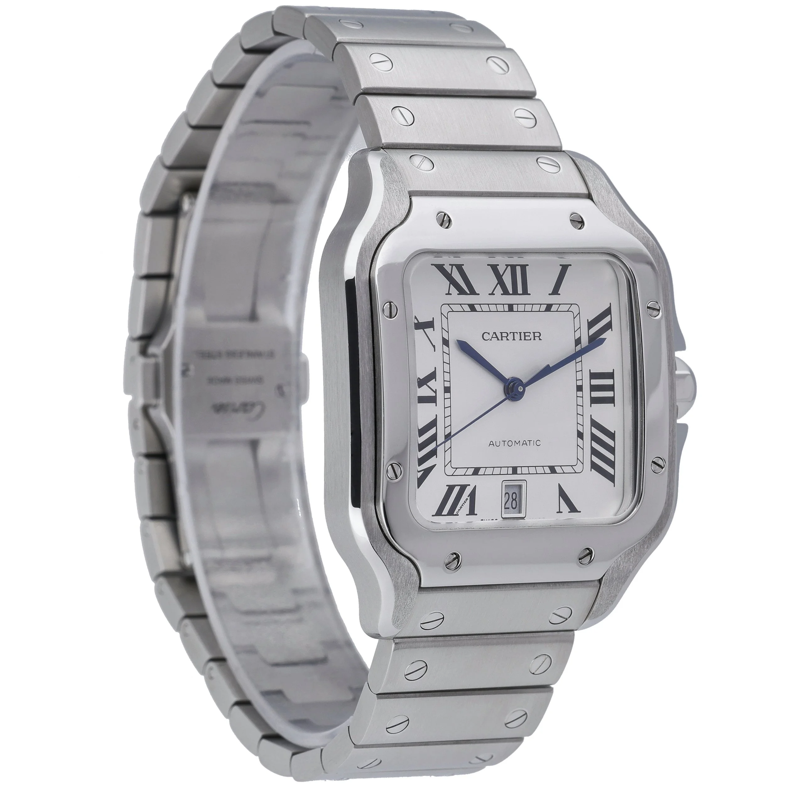 Elevate your collection with this 2024 Santos de Cartier, reference WSSA0018, presented in excellent condition. The 40mm stainless steel case showcases the iconic, plain Santos bezel and a refined silver dial with Roman numerals beneath scratch‑resistant sapphire crystal. Powered by an automatic movement and water resistant to 100M, it’s paired with a robust steel bracelet and secure folding clasp for everyday elegance. Supplied with original box and papers, this gents model is backed by our 2 Year Warranty and protected by a 14 Day Return Policy. Enjoy fast, Prompt Delivery. BQ Ref: 52794.