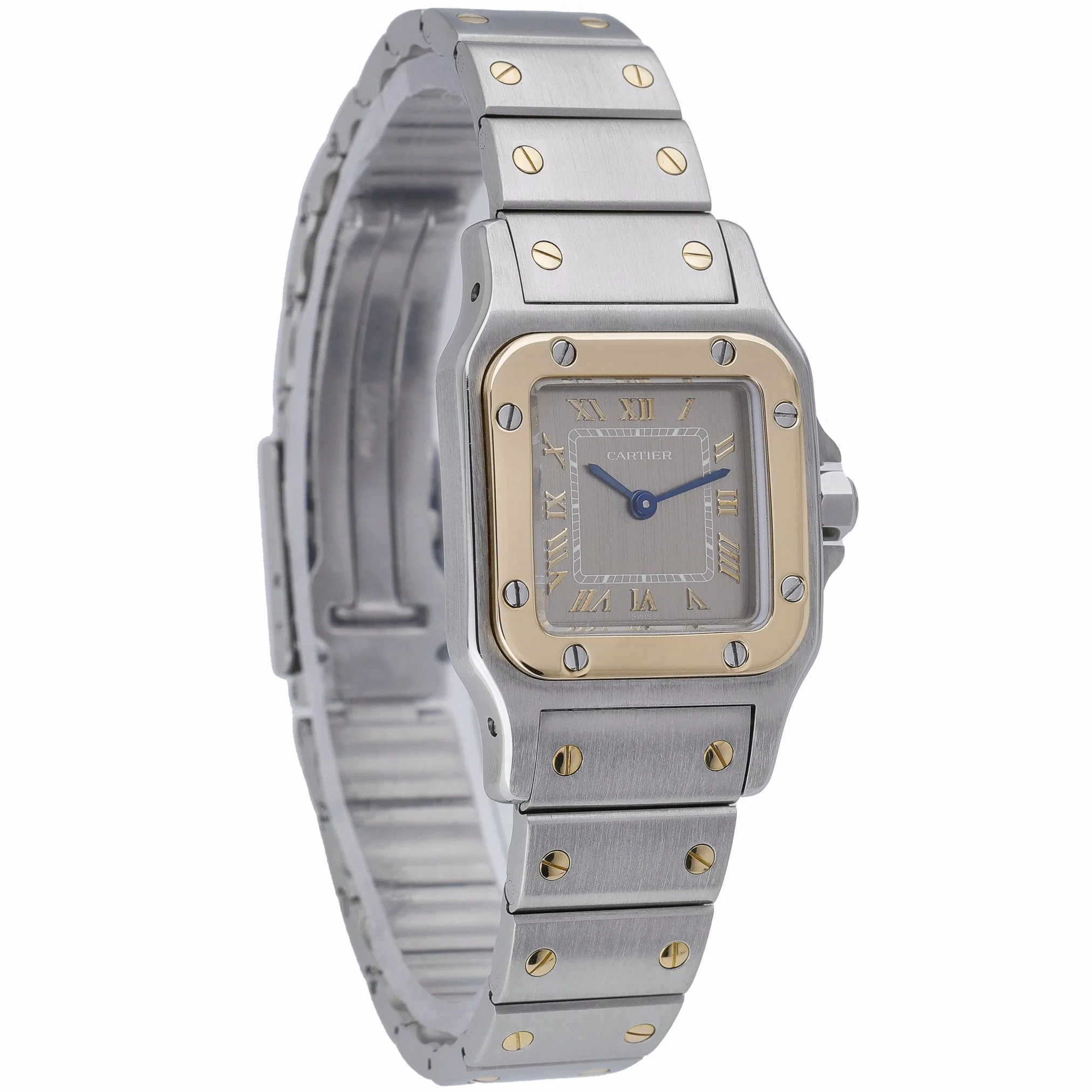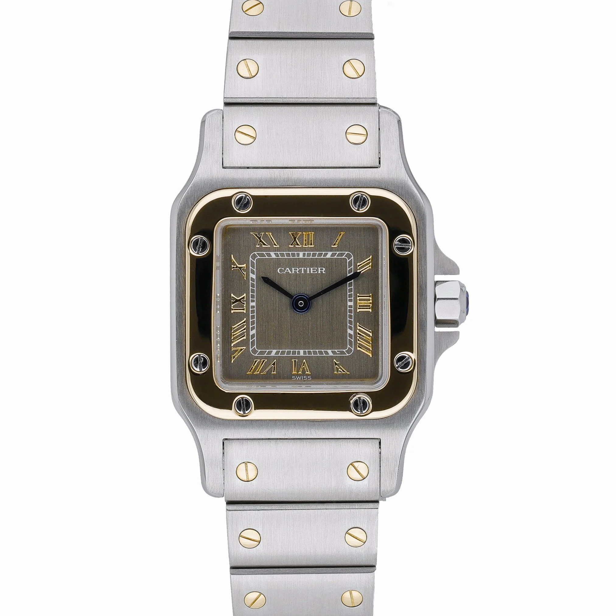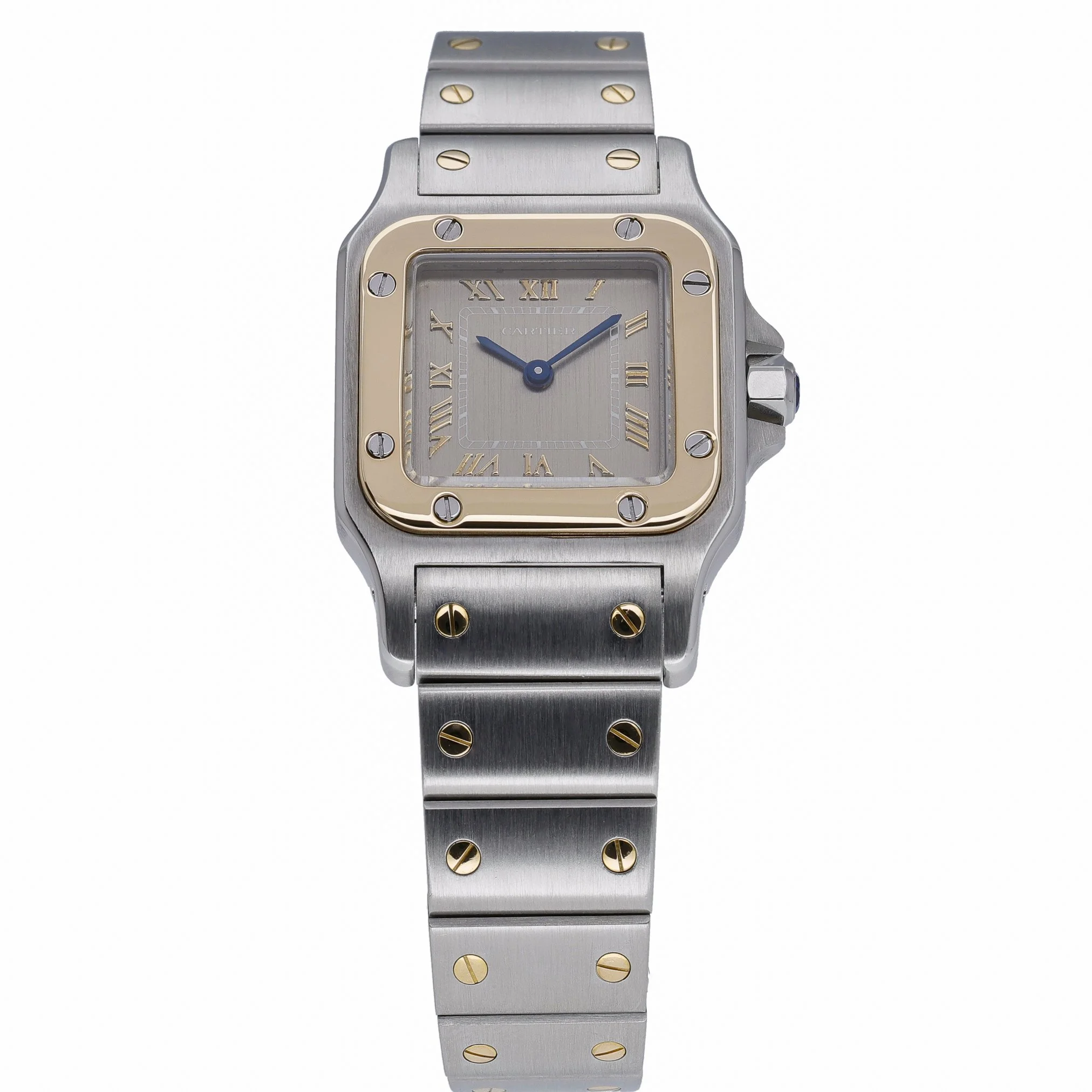 Timeless and elegant, this ladies’ Cartier Santos (Model 1567, BQ Ref 53014) pairs iconic design with everyday versatility. Crafted in steel and yellow gold, the 24mm case features a plain bezel and a refined grey Roman dial protected by sapphire crystal. The reliable quartz movement ensures precise timekeeping, while the integrated two-tone bracelet with folding clasp offers a comfortable, secure fit. Produced in 1995 and presented in excellent condition, this piece comes complete with its original box and papers, underscoring its authenticity and provenance. Water resistance to 3ATM adds practical assurance for daily wear. Supplied with a 2 Year Warranty, 14 Day Return Policy, and Prompt Delivery, this Cartier Santos is a distinguished classic ready to wear.