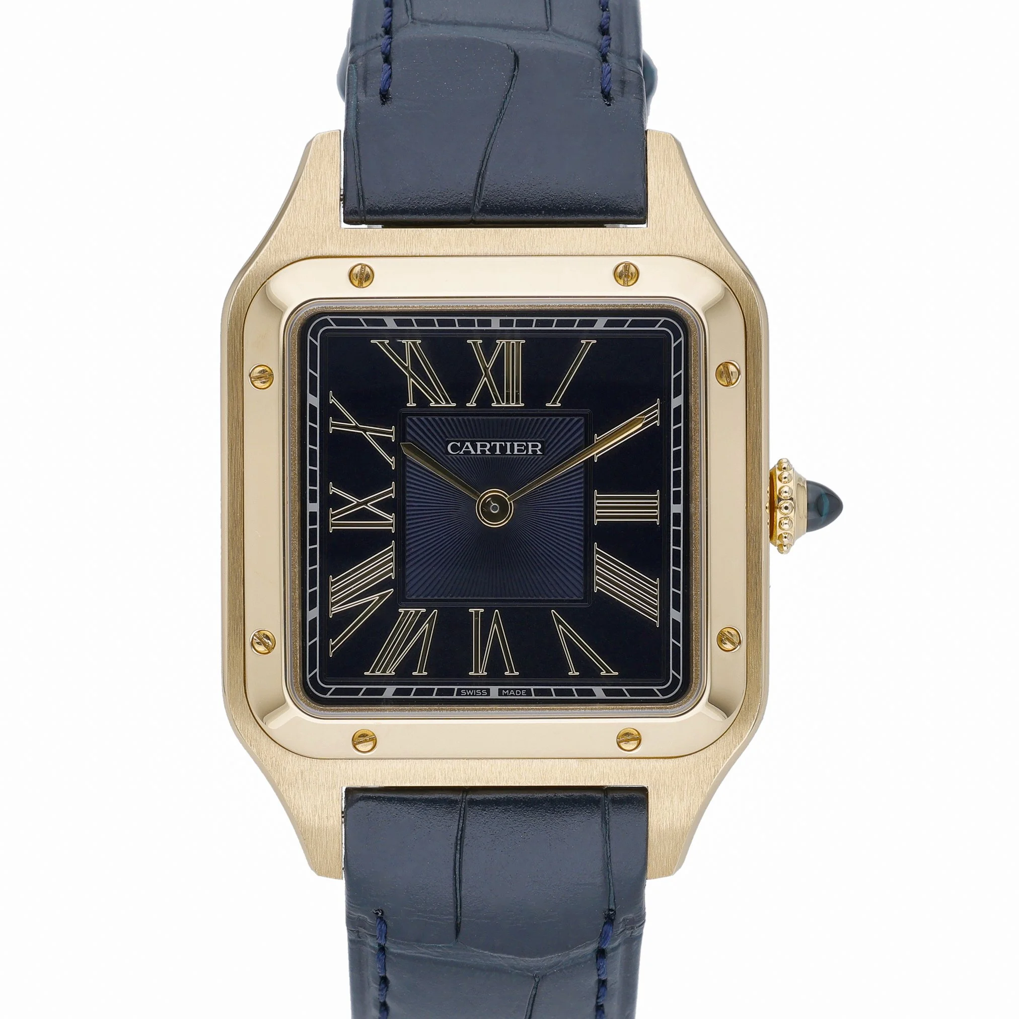 Timeless and elegantly proportioned, this Cartier Santos Dumont (WGSA0077) features a 43.5mm 18ct yellow gold case with a plain bezel and a striking blue dial with classic Roman numerals. Powered by a precise quartz movement and protected by sapphire crystal, it offers effortless reliability, while 30M water resistance adds everyday practicality. The leather strap and pin buckle ensure refined comfort on the wrist. Manufactured in 2024 and in excellent condition, it is supplied with Cartier box and original papers. Includes our 2 Year Warranty and 14 Day Return Policy, with Prompt Delivery available. BQ Ref: 52543.