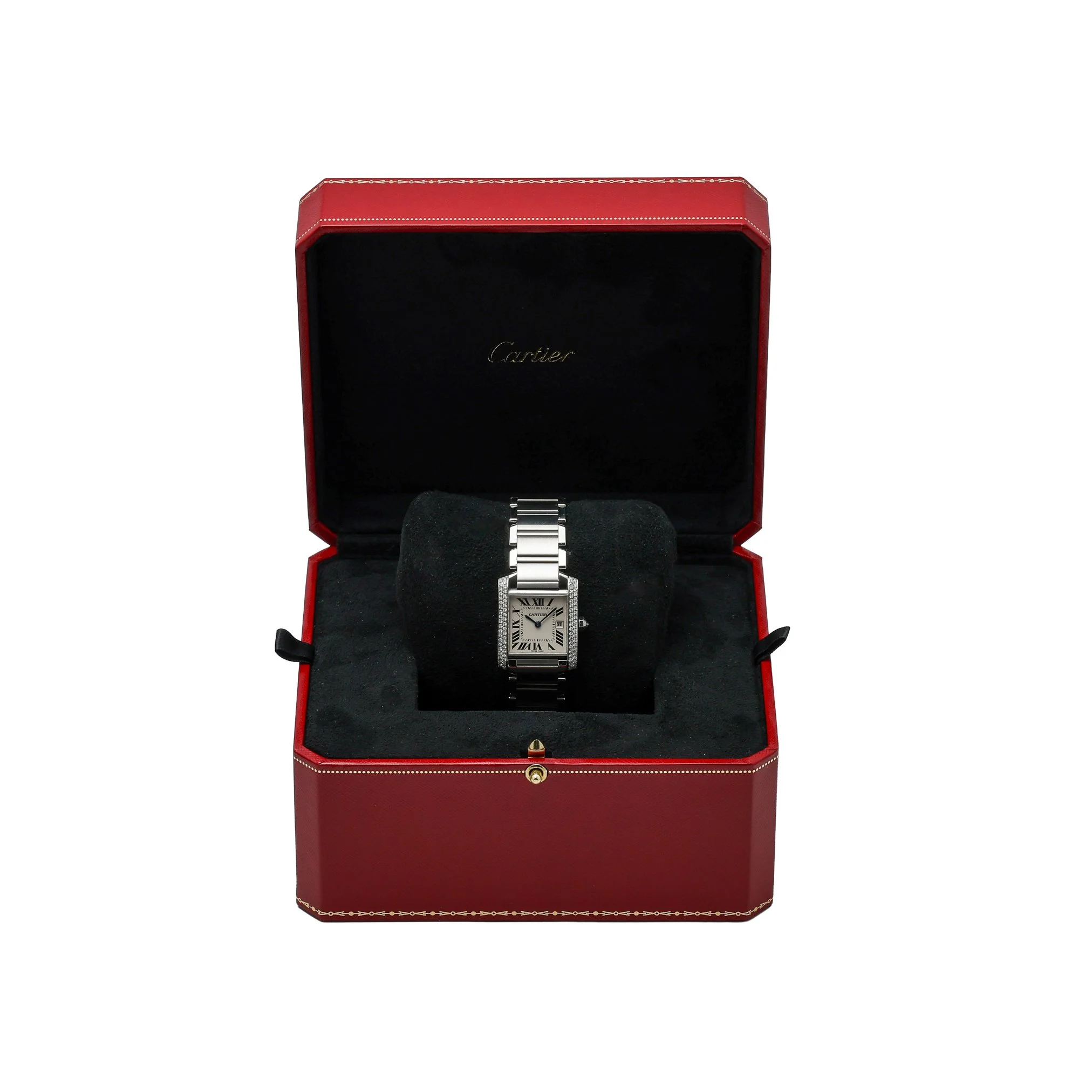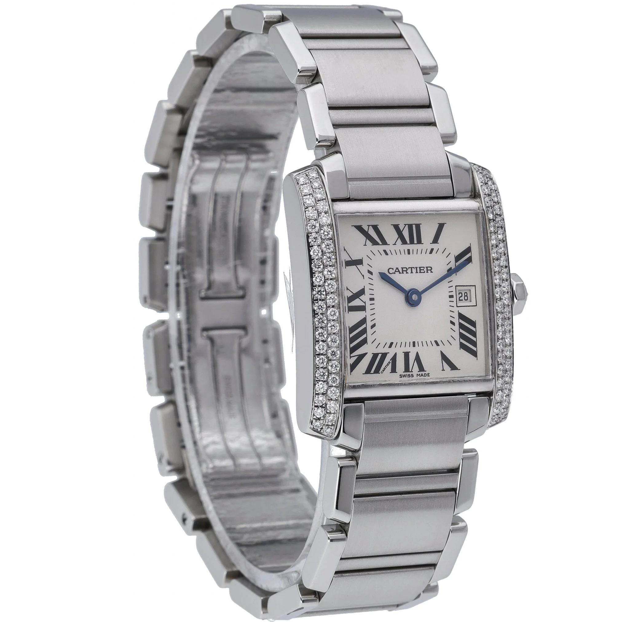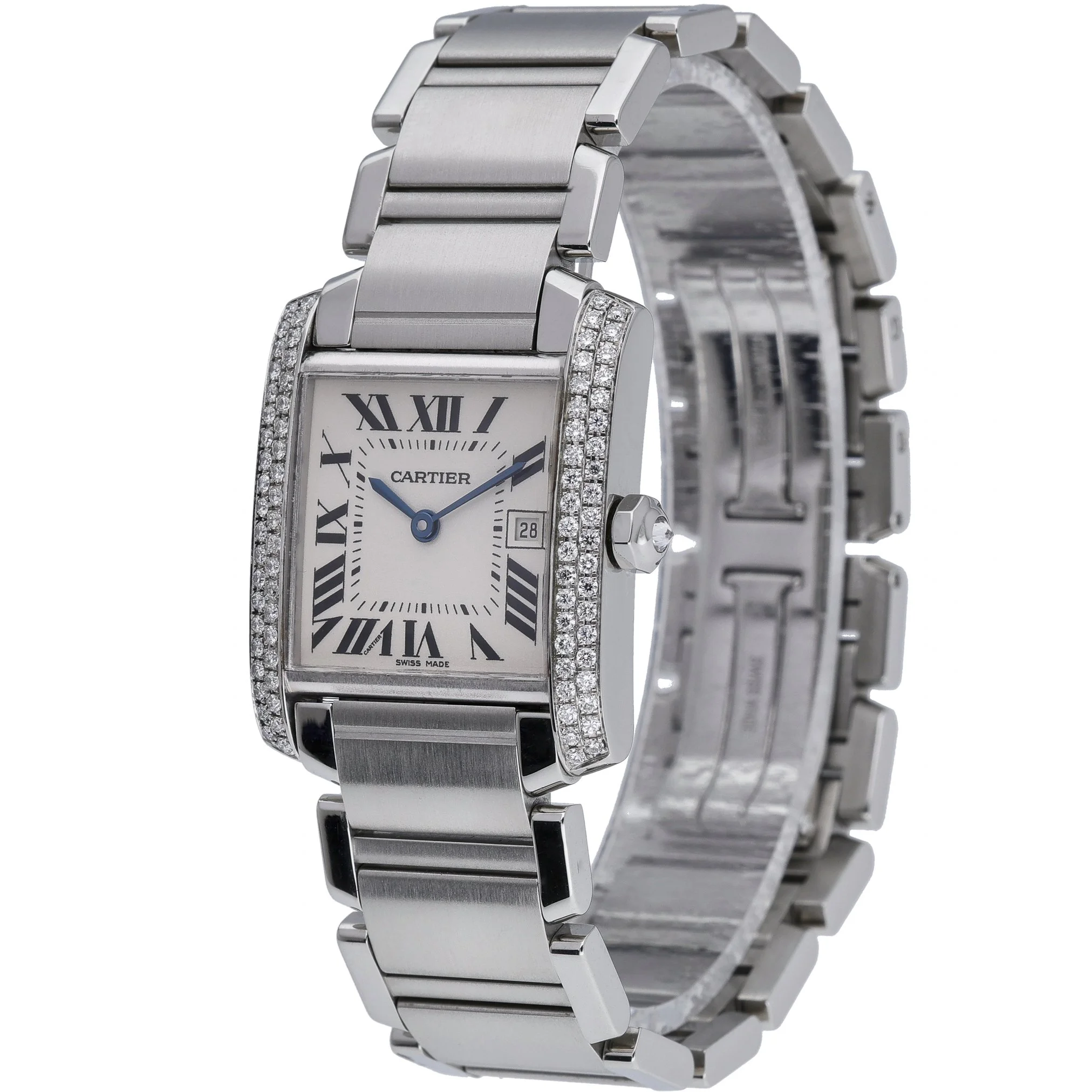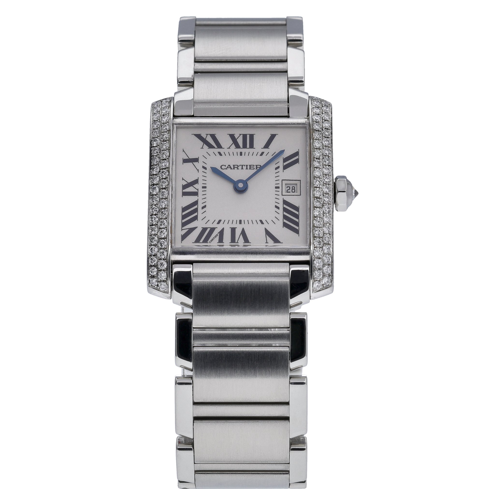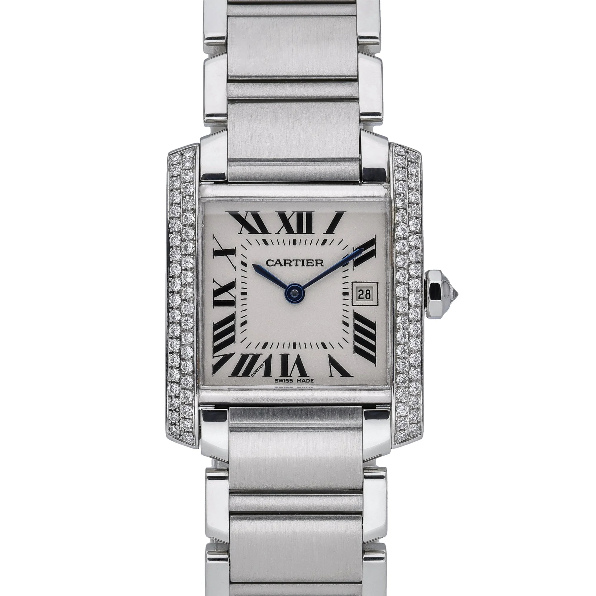 Elevate your collection with this Cartier Tank Francaise, model 2465, a timeless blend of Parisian elegance and everyday practicality. Presented in excellent condition, it features a 25mm midsize stainless steel case and bracelet with a secure folding clasp, framed by a diamond-set bezel that adds refined brilliance. The crisp white dial with classic Roman numerals sits beneath scratch-resistant sapphire crystal, while a reliable quartz movement ensures effortless precision. Manufactured in 2005, this piece is water resistant to 30M and offered with its Cartier box. BQ Ref: 52926. Enjoy peace of mind with our 2 Year Warranty, plus the convenience of Prompt Delivery and a 14 Day Return Policy. A definitive icon, perfectly sized for versatile, sophisticated wear.
