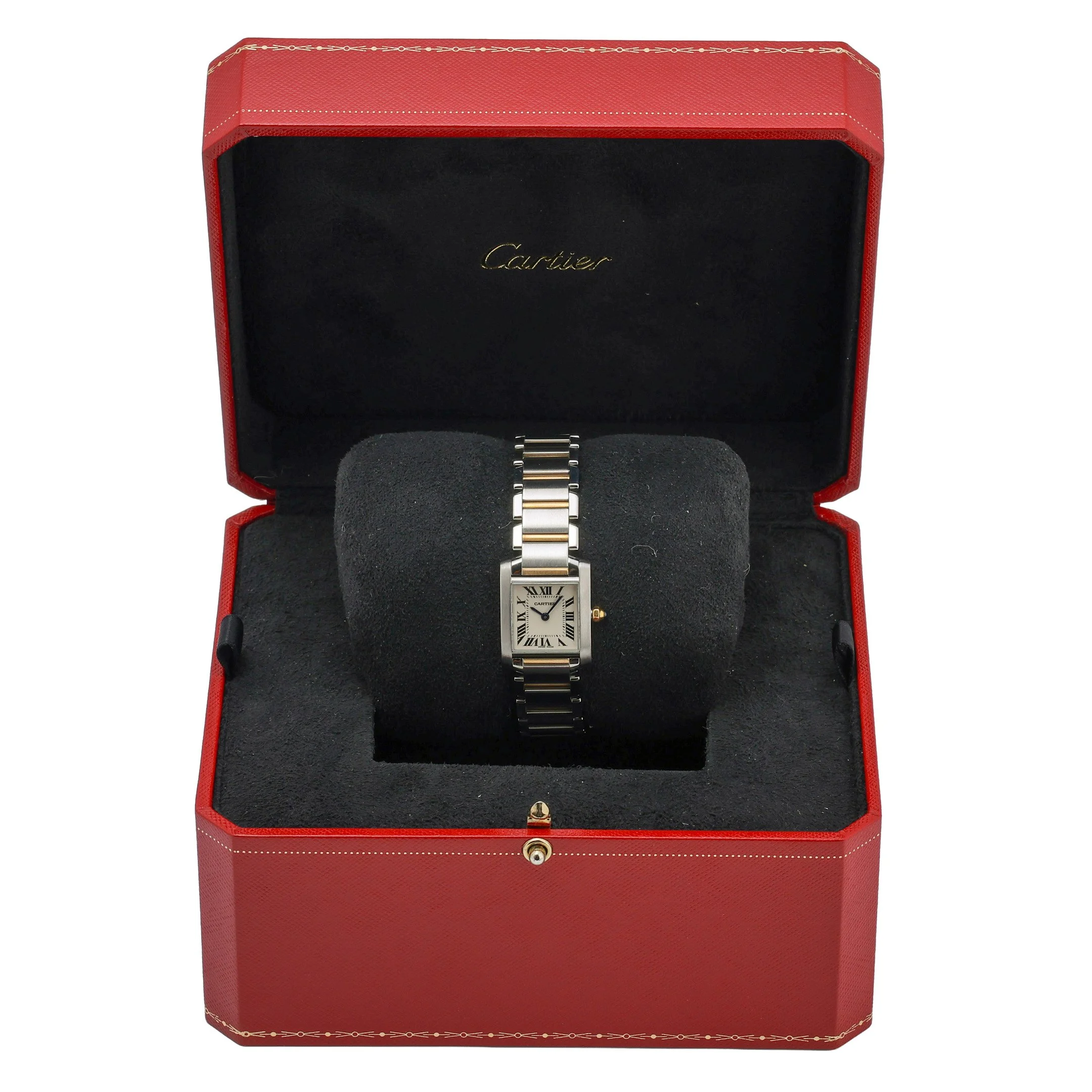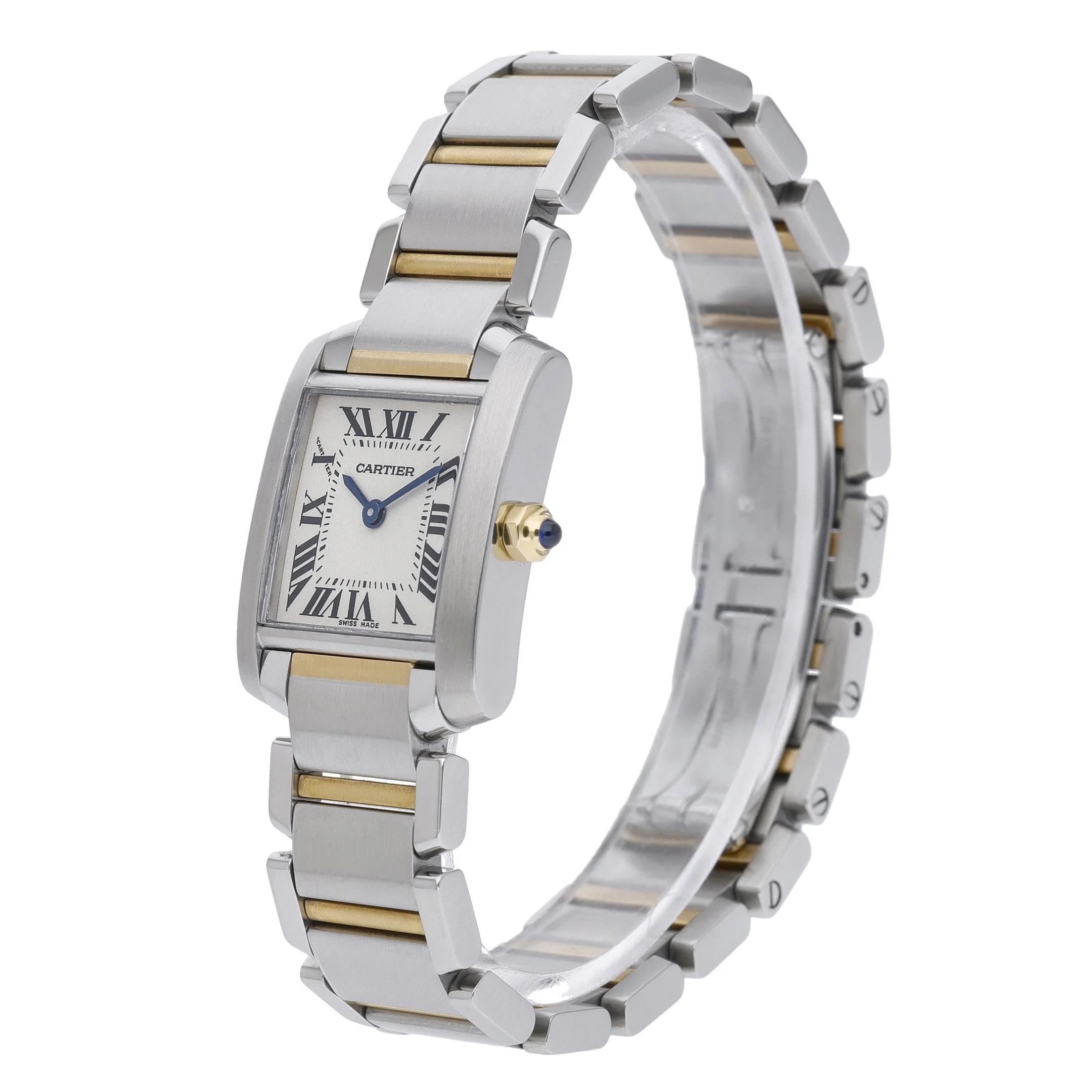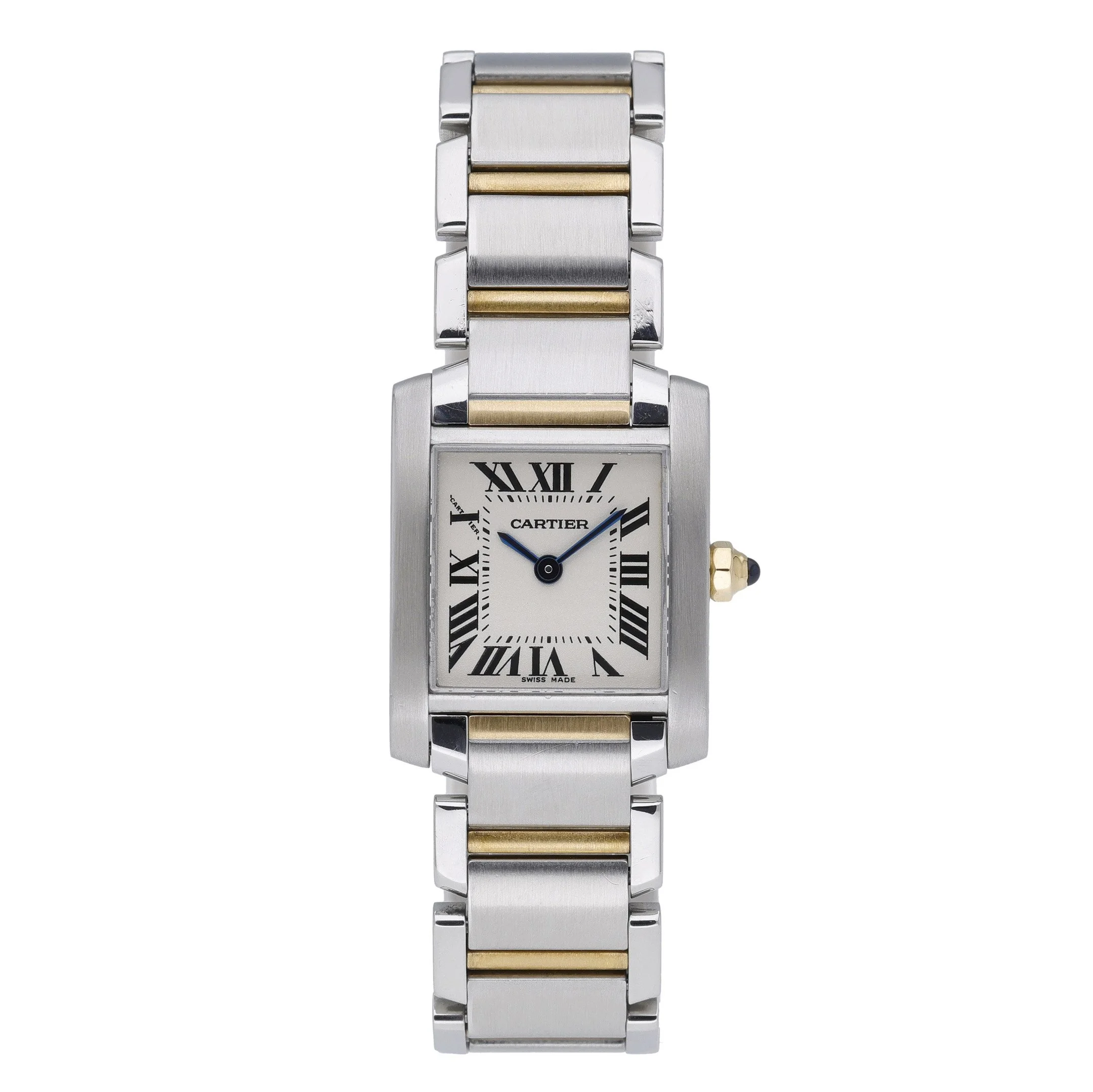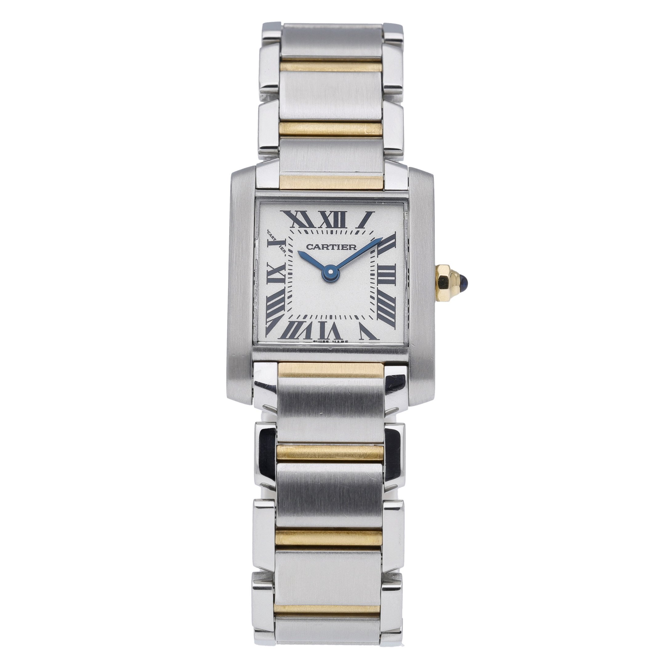 Cartier Tank Francaise, Model 2384 (BQ Ref 53061). This elegant ladies’ 20mm timepiece pairs steel and yellow gold across the case and bracelet for a refined two‑tone look, complemented by a crisp white Roman dial under scratch‑resistant sapphire crystal and a plain bezel. Powered by a reliable quartz movement, it features a comfortable folding clasp and 30M water resistance for everyday confidence. Manufactured in 2000 and presented in excellent condition, this Tank Francaise comes with its box and is backed by a 2 Year Warranty. Enjoy Prompt Delivery and peace of mind with our 14 Day Return Policy. Timeless Cartier design, effortless precision, and versatile sophistication—perfect for any occasion.