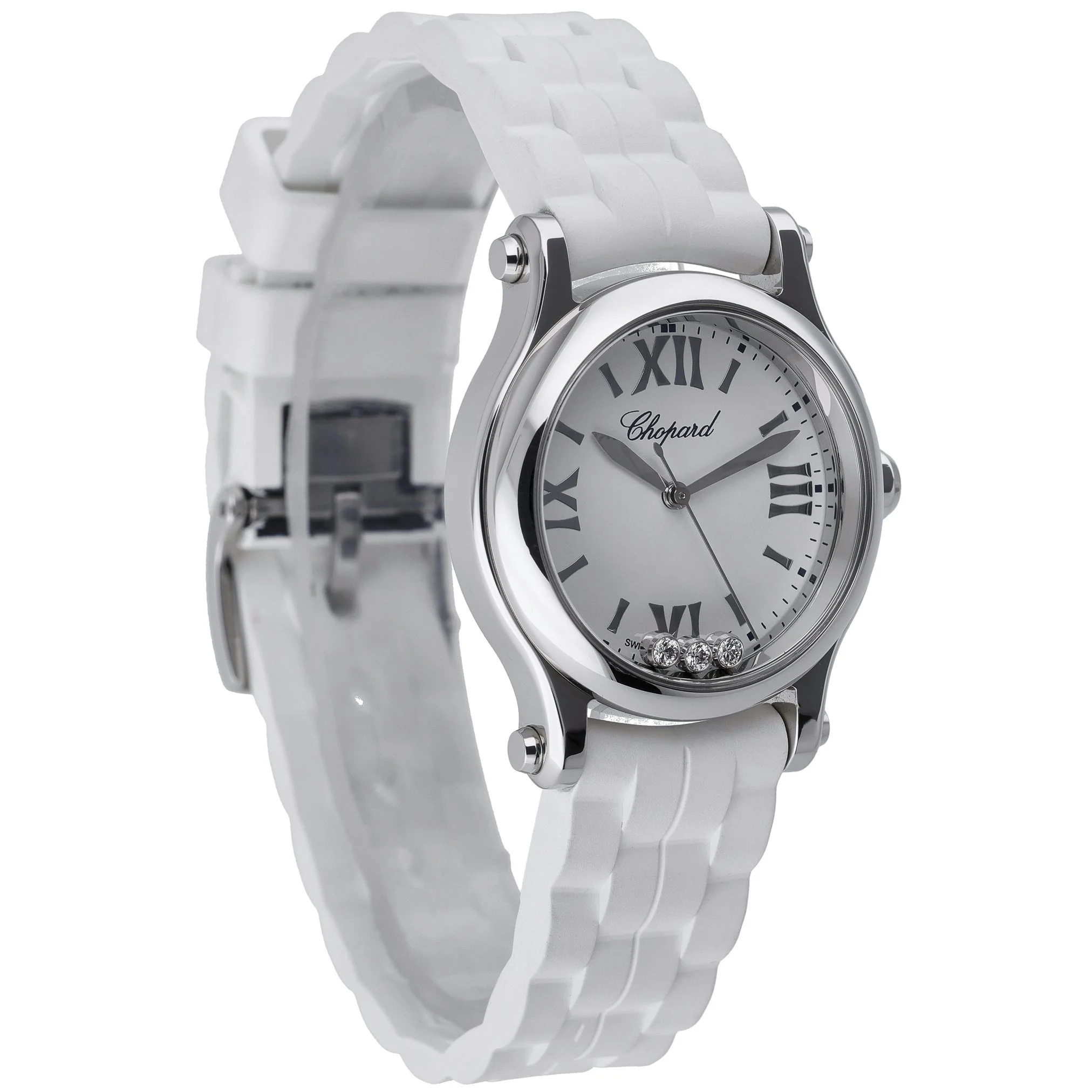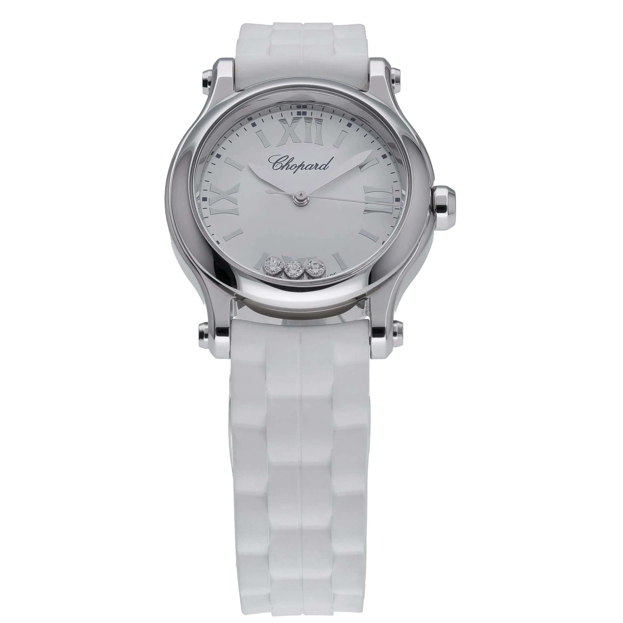 Presenting the Chopard Happy Sport (BQ Ref 53122), a refined 30mm ladies’ timepiece crafted in stainless steel and powered by a precise quartz movement. Produced in 2023 and offered in excellent condition, it features a clean, plain dial beneath durable sapphire crystal and a smooth, plain bezel that highlights its elegant, diamond-set detailing. The watch is fitted with a comfortable rubber strap secured by a pin buckle and offers practical 3 ATM water resistance for everyday wear. Supplied with its original box and papers, this Happy Sport is covered by a 2-year warranty for added peace of mind. Enjoy next day delivery and a 14-day return policy. A timeless blend of sportiness and sophistication from Chopard.