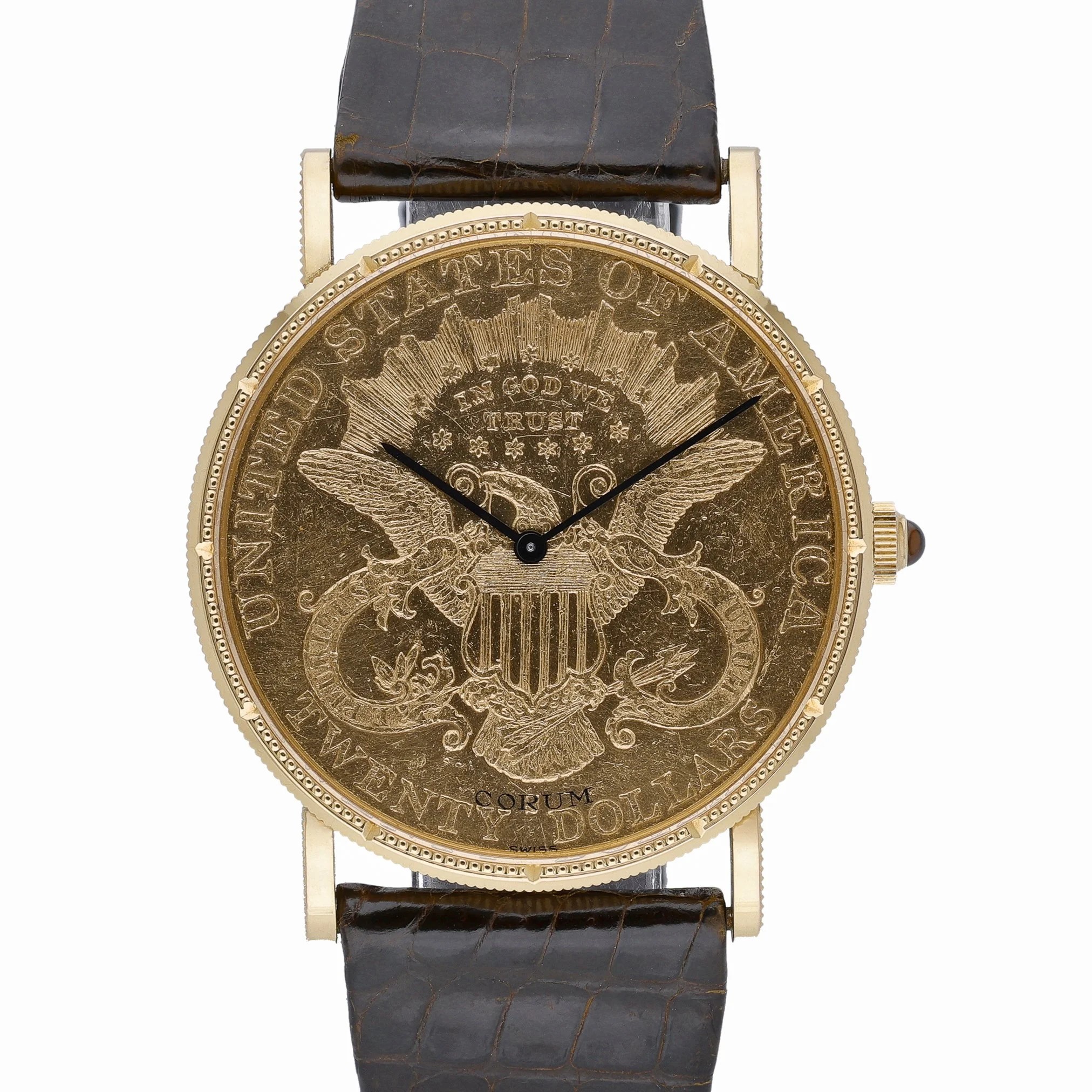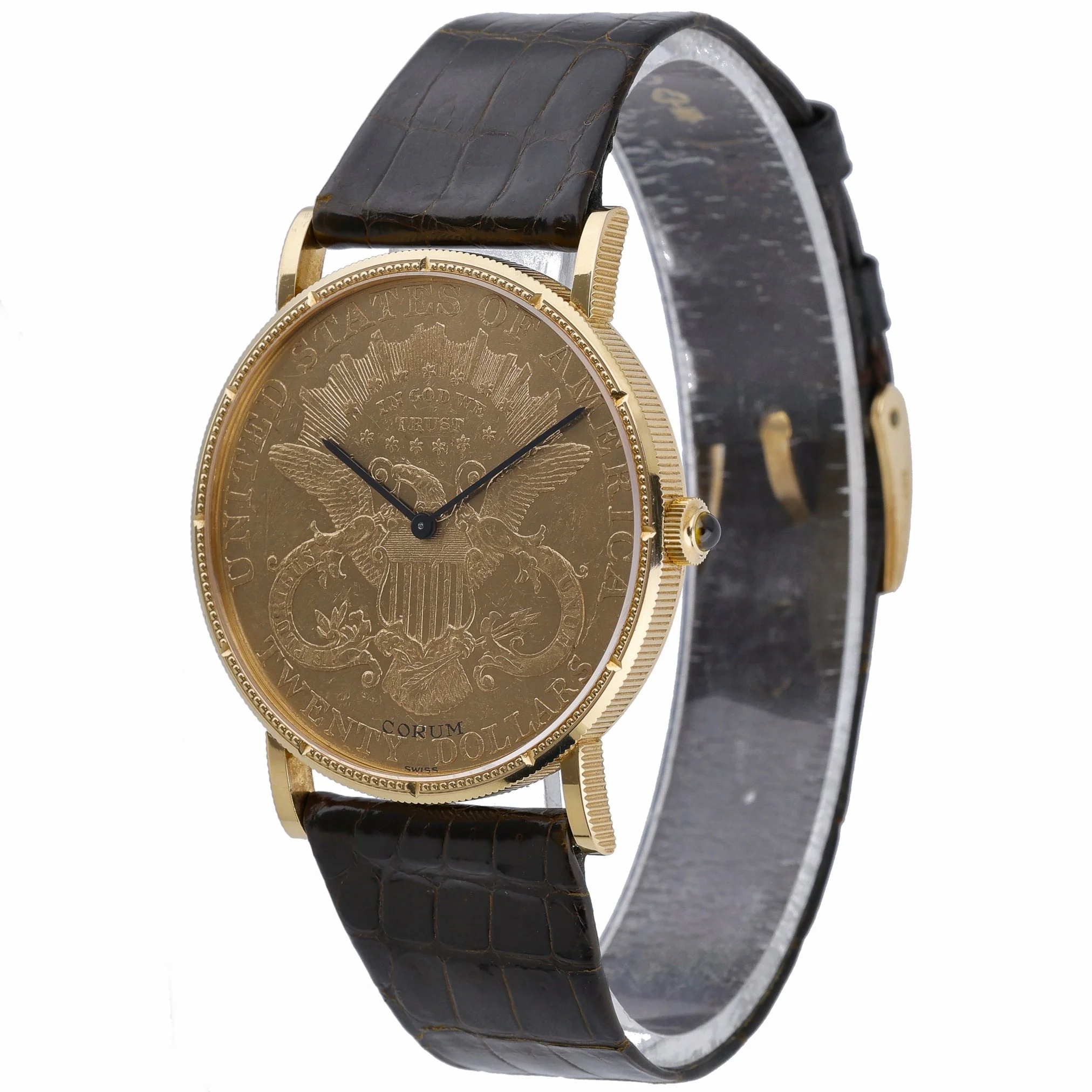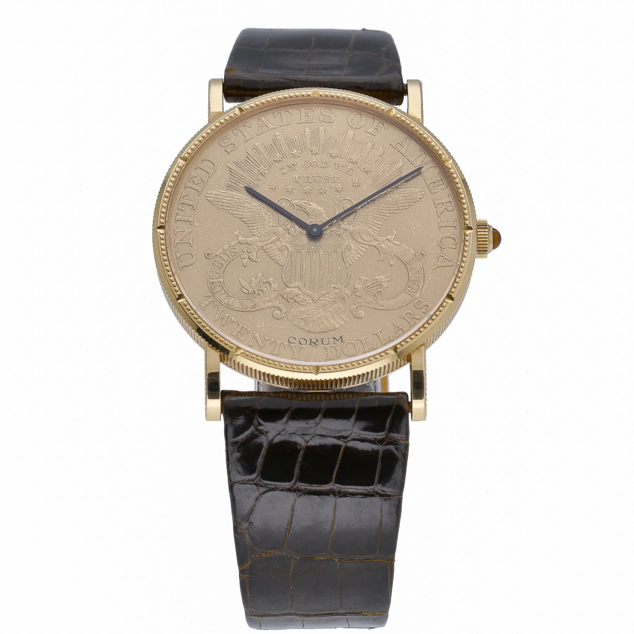 An icon of understated elegance, this Corum Coin Watch 20 Dollars Double Eagle (BQ Ref 53189) showcases a 35mm 18ct yellow gold case with a plain bezel and a refined champagne dial beneath durable sapphire crystal. Powered by a manual-wind movement, this 1983 gents model exudes classic sophistication and wears comfortably on a leather strap secured by a pin buckle. Presented in good condition and supplied with its box, it comes with a 2 Year Warranty for added assurance. Enjoy convenient Prompt Delivery and shop with confidence thanks to our 14 Day Return Policy.