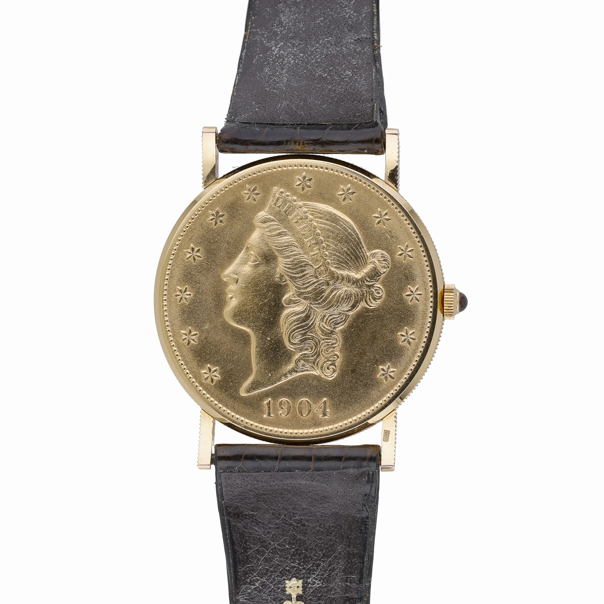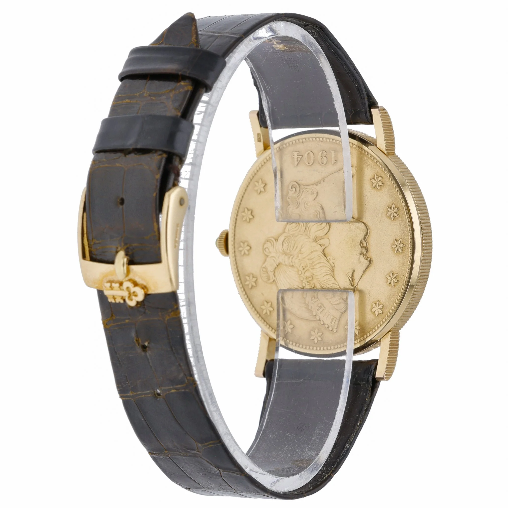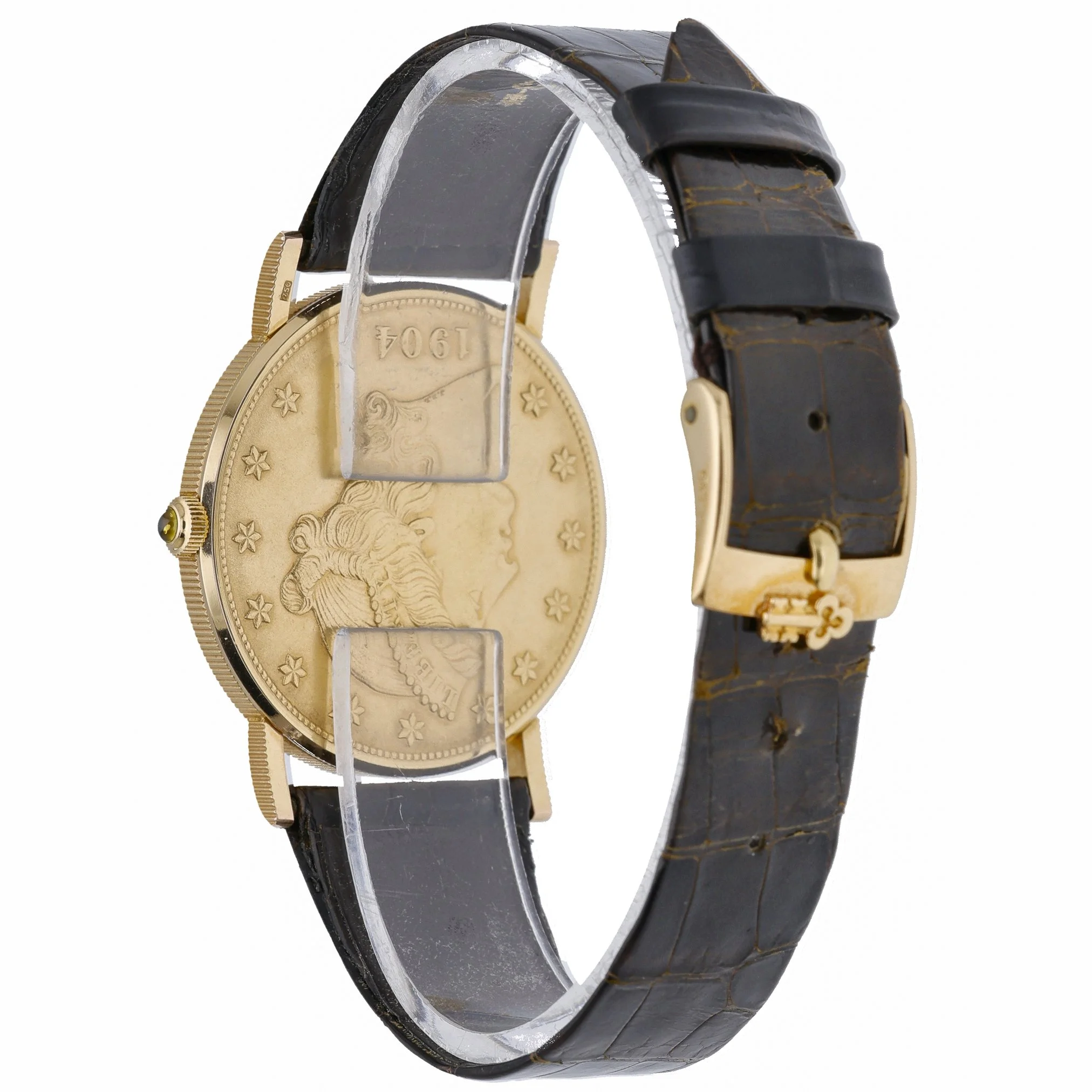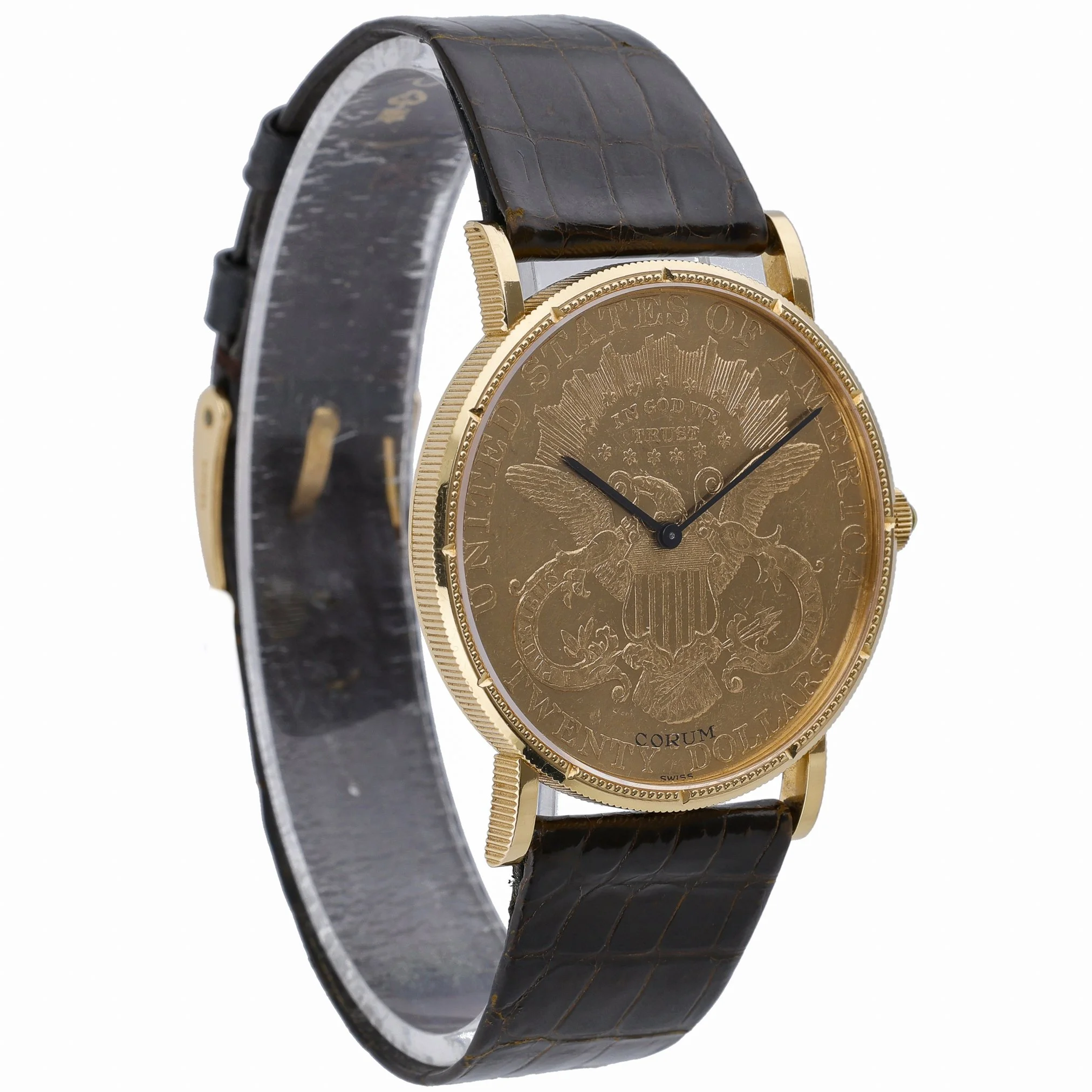 An icon of understated elegance, this Corum Coin Watch 20 Dollars Double Eagle (BQ Ref 53189) showcases a 35mm 18ct yellow gold case with a plain bezel and a refined champagne dial beneath durable sapphire crystal. Powered by a manual-wind movement, this 1983 gents model exudes classic sophistication and wears comfortably on a leather strap secured by a pin buckle. Presented in good condition and supplied with its box, it comes with a 2 Year Warranty for added assurance. Enjoy convenient Prompt Delivery and shop with confidence thanks to our 14 Day Return Policy.