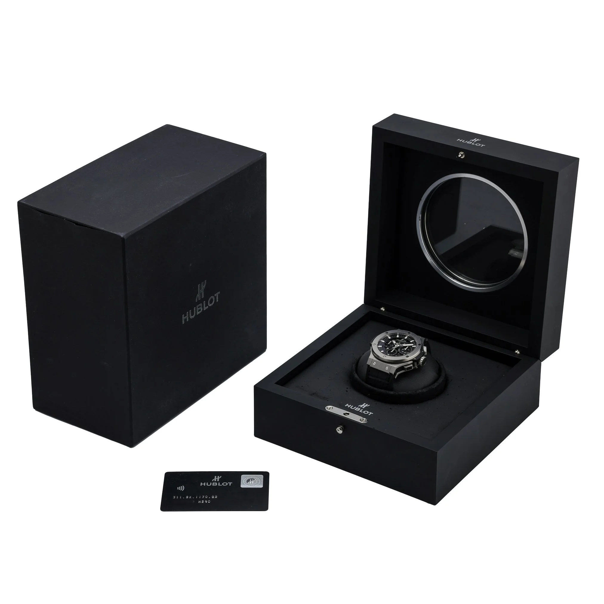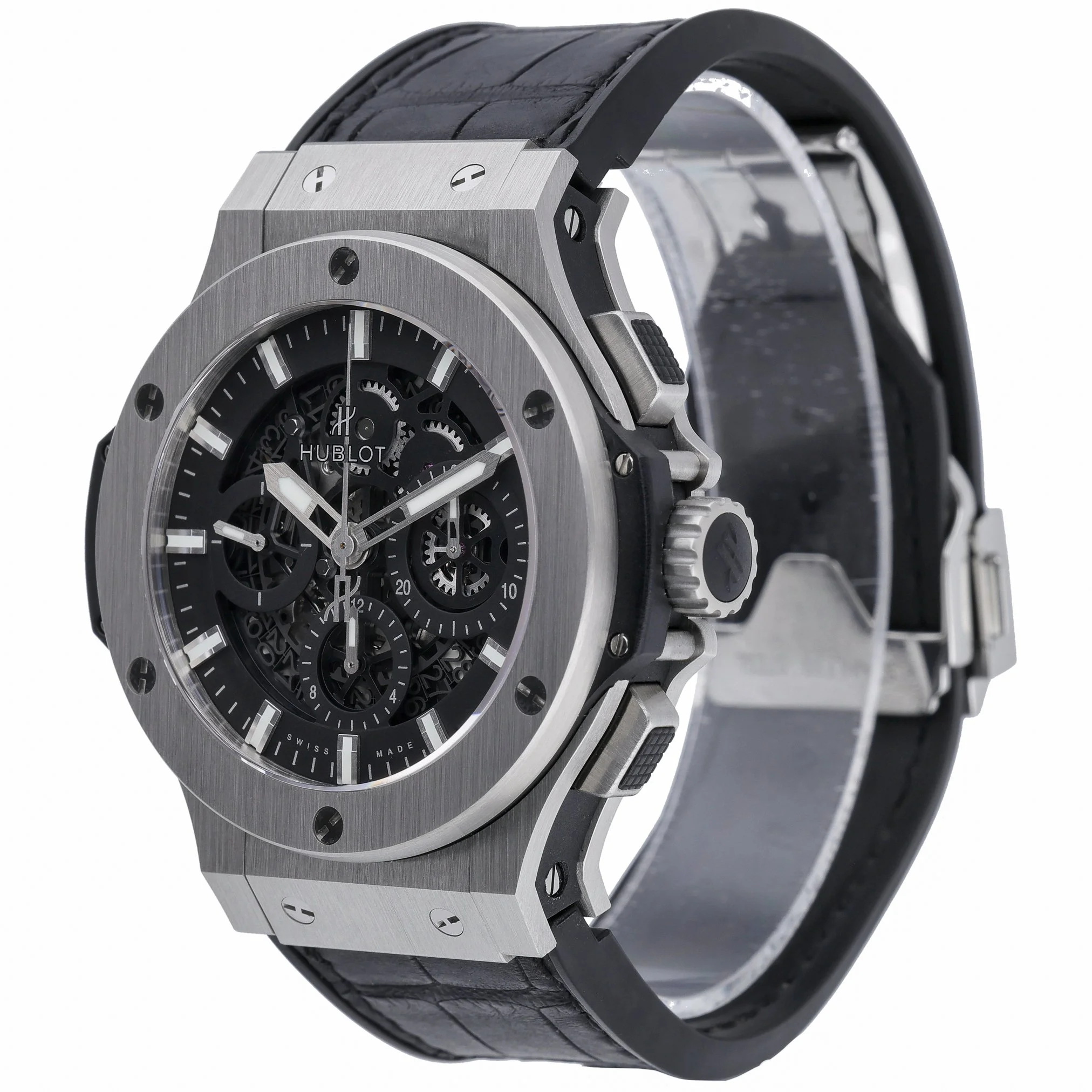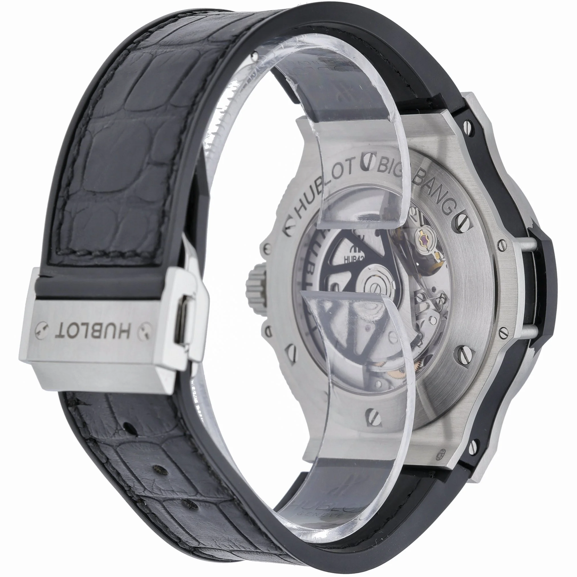 Discover the Hublot Big Bang Aero Bang, BQ Ref. 52202, presented in excellent condition. The 44mm stainless steel case houses a striking black skeleton dial beneath sapphire crystal, revealing the automatic movement that powers this bold gents timepiece. A plain bezel, black leather strap, and secure folding clasp deliver refined comfort, while 10 ATM water resistance makes it a confident companion for everyday wear. Manufactured in 2016, this watch is supplied with its original box and papers and is backed by our 2 Year Warranty for added peace of mind. Enjoy a seamless experience with our 14 Day Return Policy and Prompt Delivery. A distinctive statement from Hublot’s iconic Big Bang line, the Aero Bang fuses contemporary design with mechanical transparency—ideal for those who value precision engineering and modern style.