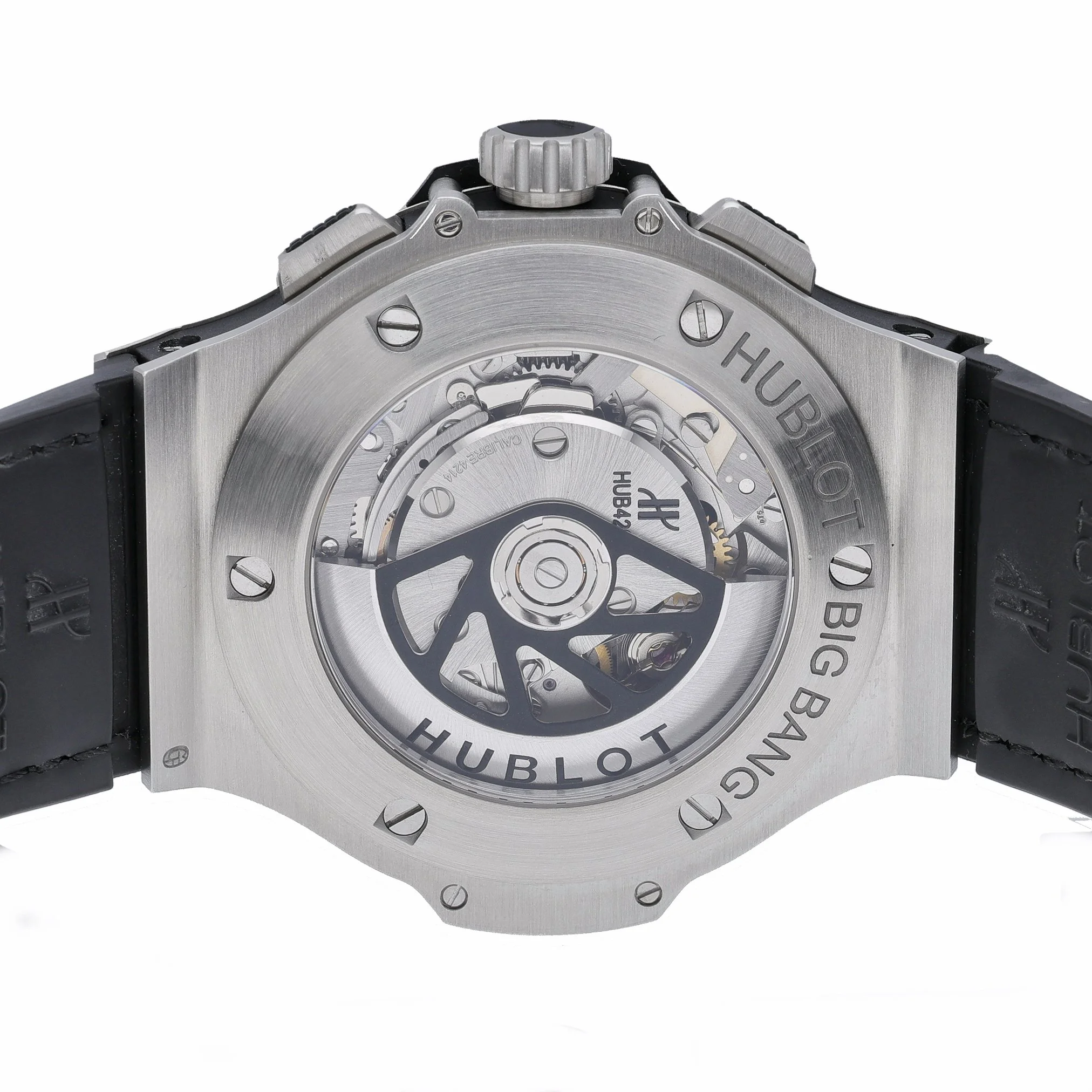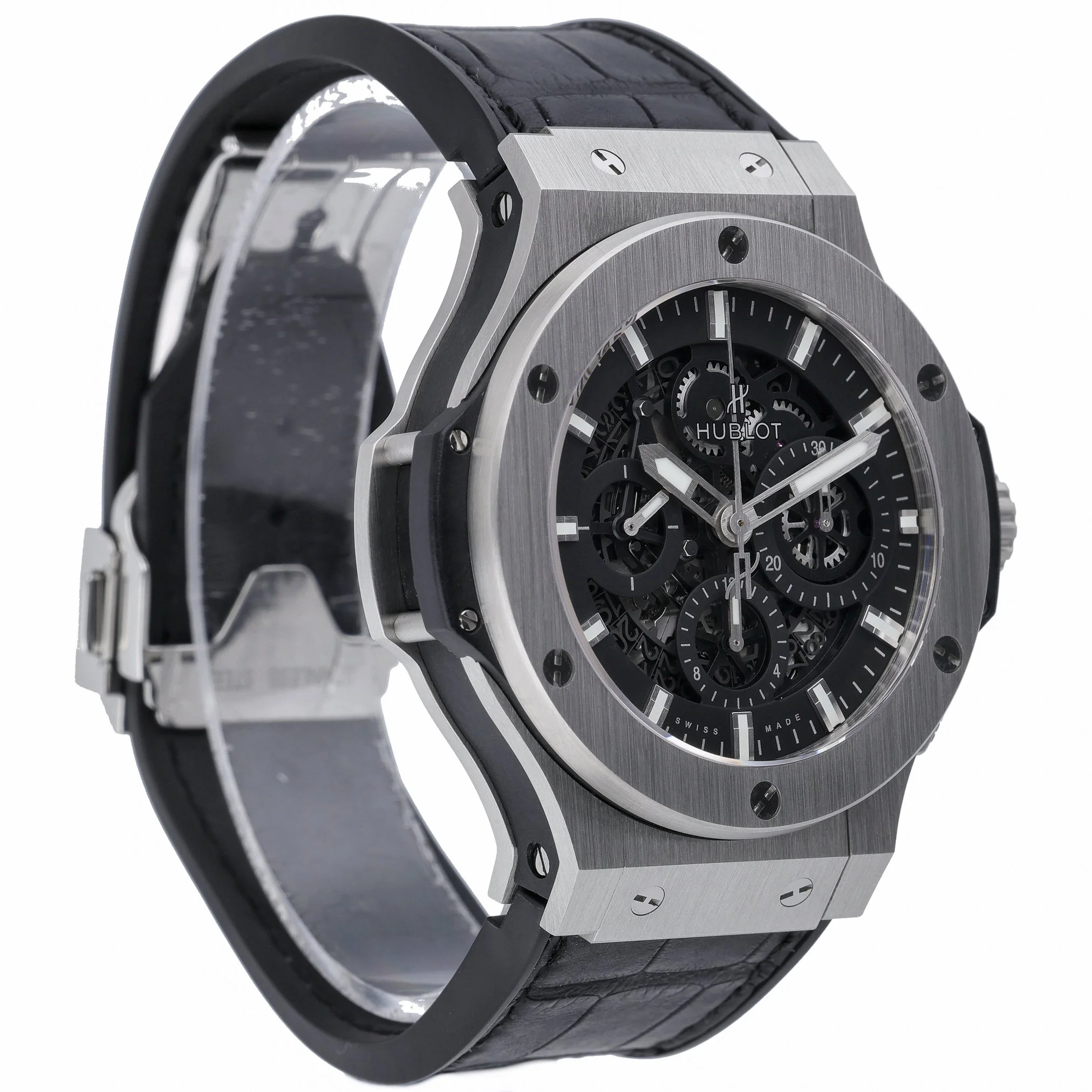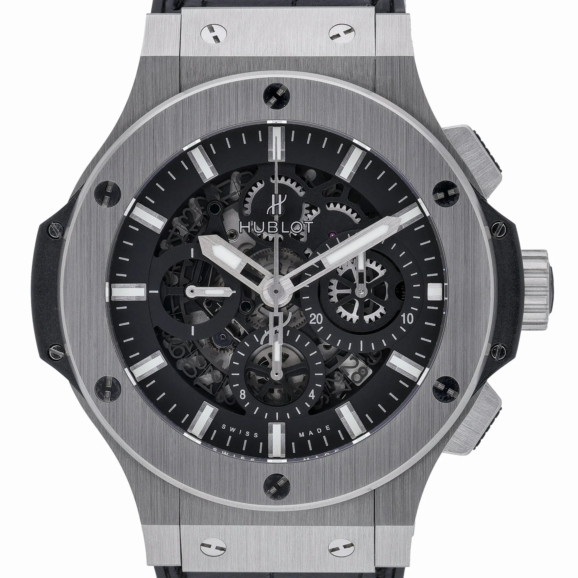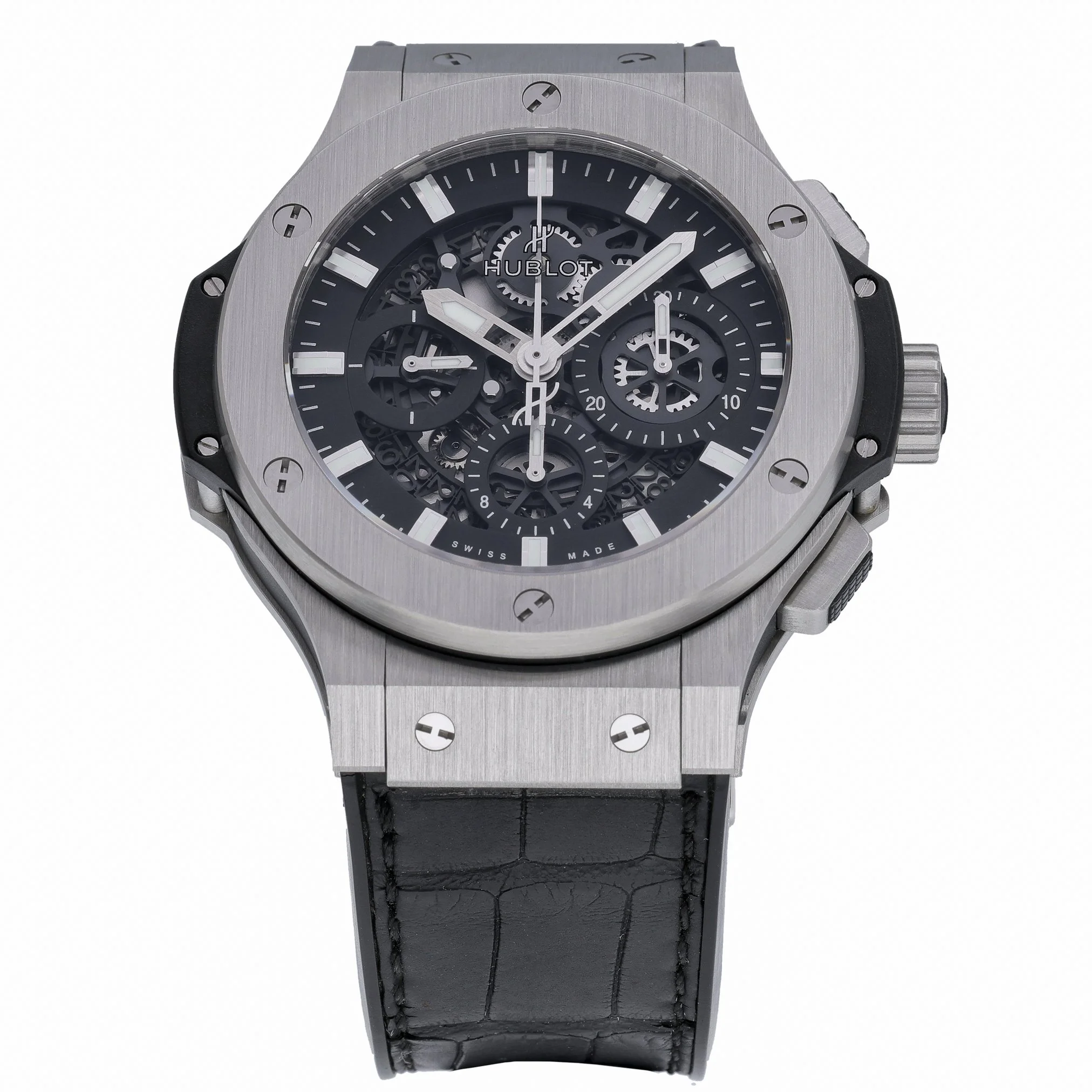 Discover the Hublot Big Bang Aero Bang, BQ Ref. 52202, presented in excellent condition. The 44mm stainless steel case houses a striking black skeleton dial beneath sapphire crystal, revealing the automatic movement that powers this bold gents timepiece. A plain bezel, black leather strap, and secure folding clasp deliver refined comfort, while 10 ATM water resistance makes it a confident companion for everyday wear. Manufactured in 2016, this watch is supplied with its original box and papers and is backed by our 2 Year Warranty for added peace of mind. Enjoy a seamless experience with our 14 Day Return Policy and Prompt Delivery. A distinctive statement from Hublot’s iconic Big Bang line, the Aero Bang fuses contemporary design with mechanical transparency—ideal for those who value precision engineering and modern style.