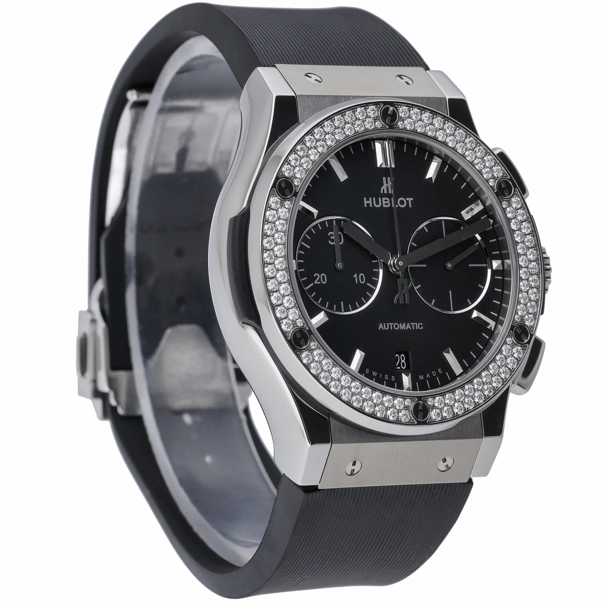 Refined and dynamic, the Hublot Classic Fusion Chronograph (BQ Ref 52479) features a 45mm lightweight titanium case with a diamond-set bezel, framing a black chronograph dial beneath scratch-resistant sapphire crystal. Powered by an automatic movement, it’s paired with a leather strap and secure folding clasp for comfortable, confident wear. Presented in excellent condition, this gents timepiece comes complete with its original box and papers and is water resistant to 5 ATM. Supplied with a 2-year warranty, next day delivery, and a 14-day return policy for complete peace of mind.