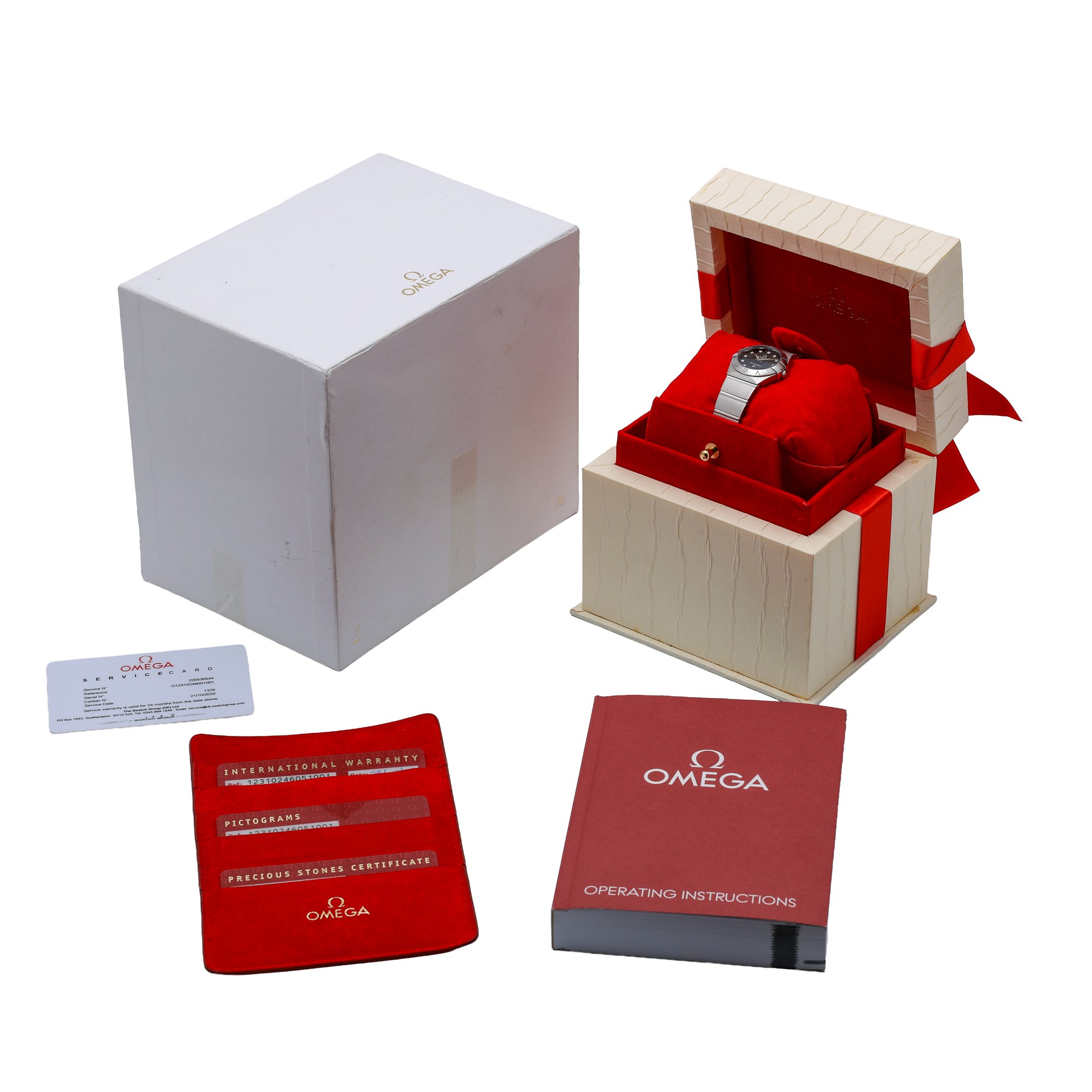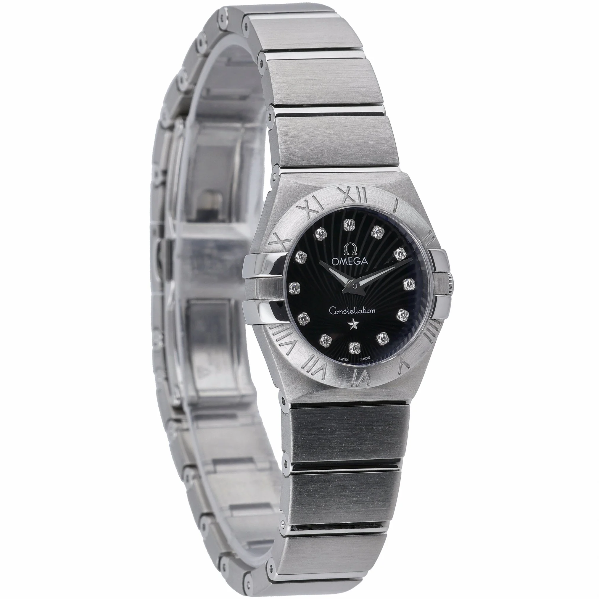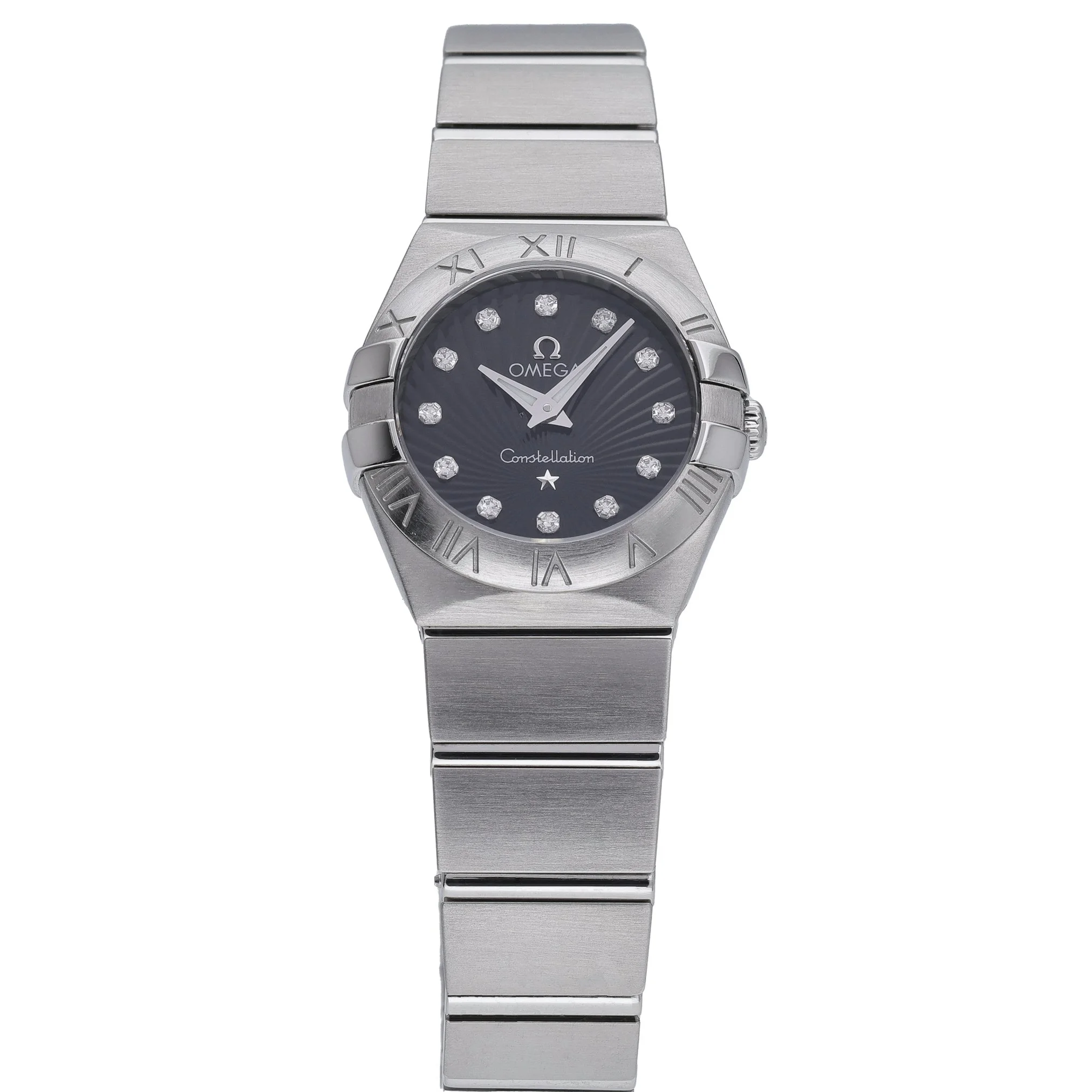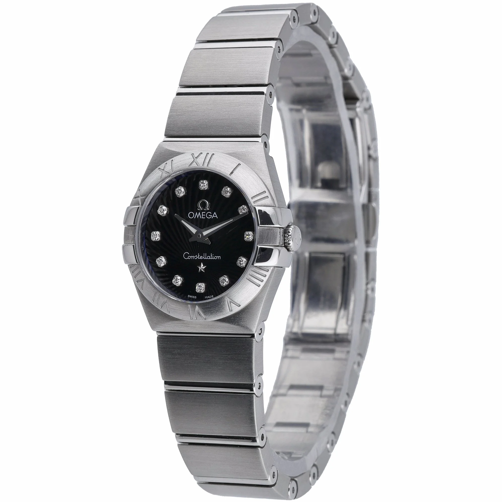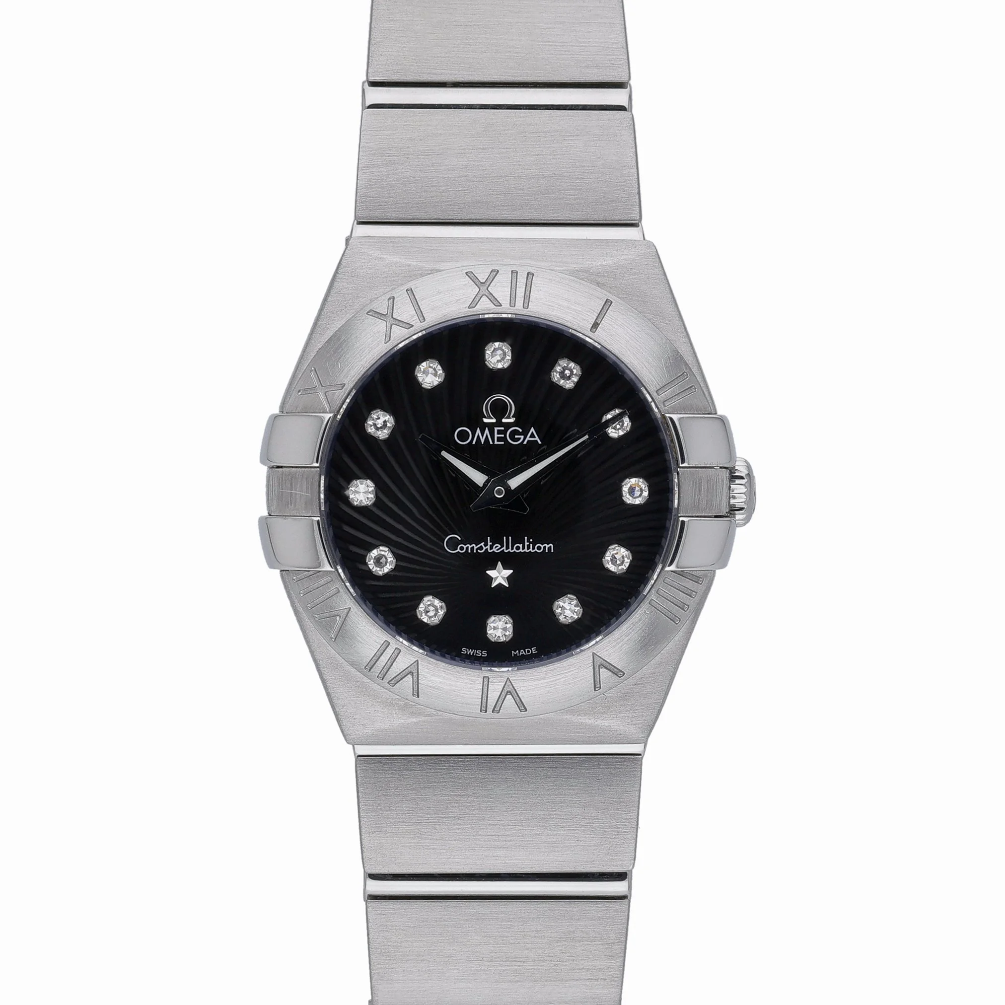 Discover the Omega Constellation (BQ Ref 52483), a refined ladies’ timepiece in excellent condition. Crafted in stainless steel with a 24mm case, it features the collection’s signature Roman numeral bezel, a sleek black diamond-set dial, and a scratch‑resistant sapphire crystal. A precise quartz movement powers this elegant watch, secured on a matching steel bracelet with a folding clasp for everyday comfort. Water resistance to 10 ATM adds practical assurance for daily wear. This 2012 example is offered with its original box and papers, providing added provenance and peace of mind. Covered by our 2 Year Warranty and supported by a 14 Day Return Policy, it is available for Prompt Delivery.