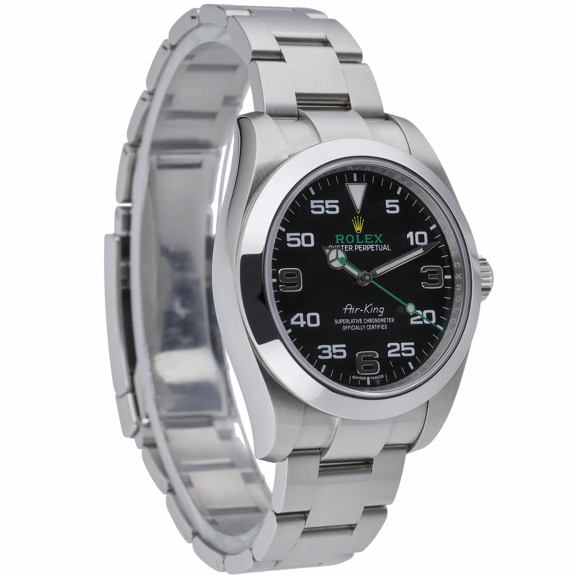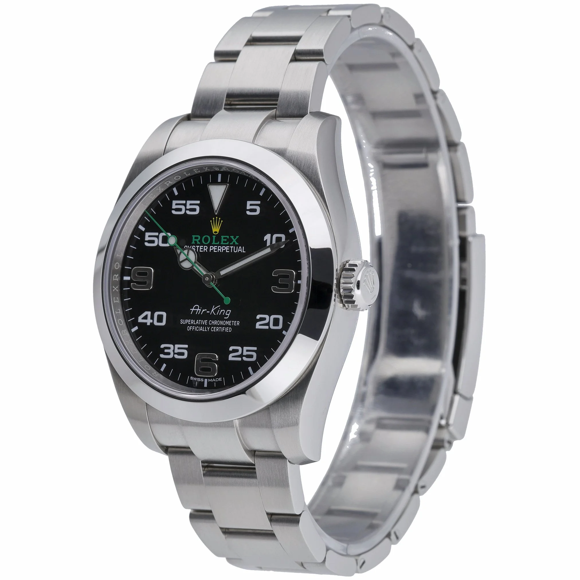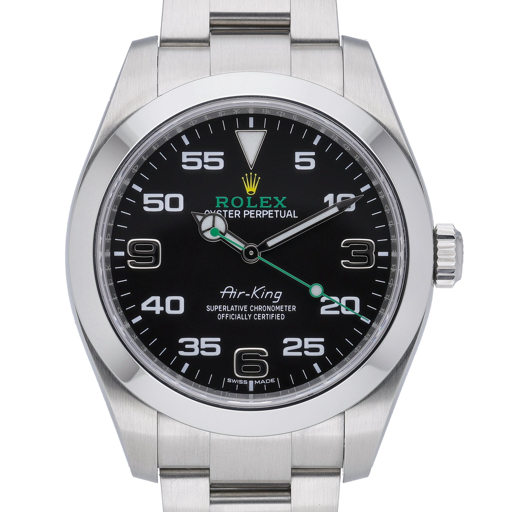 Celebrate precision and heritage with this Rolex Air-King, reference 116900. Crafted in resilient Oystersteel, its 40mm case features a domed bezel and a crisp black dial protected by sapphire crystal. Powered by a reliable automatic movement, this 2016 example is presented in excellent condition. The robust Oystersteel bracelet with folding clasp ensures secure, comfortable wear, while 100M water resistance adds everyday versatility. Supplied with its original box, papers, and white tag, this Air-King embodies the brand’s aviation spirit with timeless clarity and performance. Enjoy peace of mind with our 2 Year Warranty, a 14 Day Return Policy, and Prompt Delivery. BQ Ref 52889.