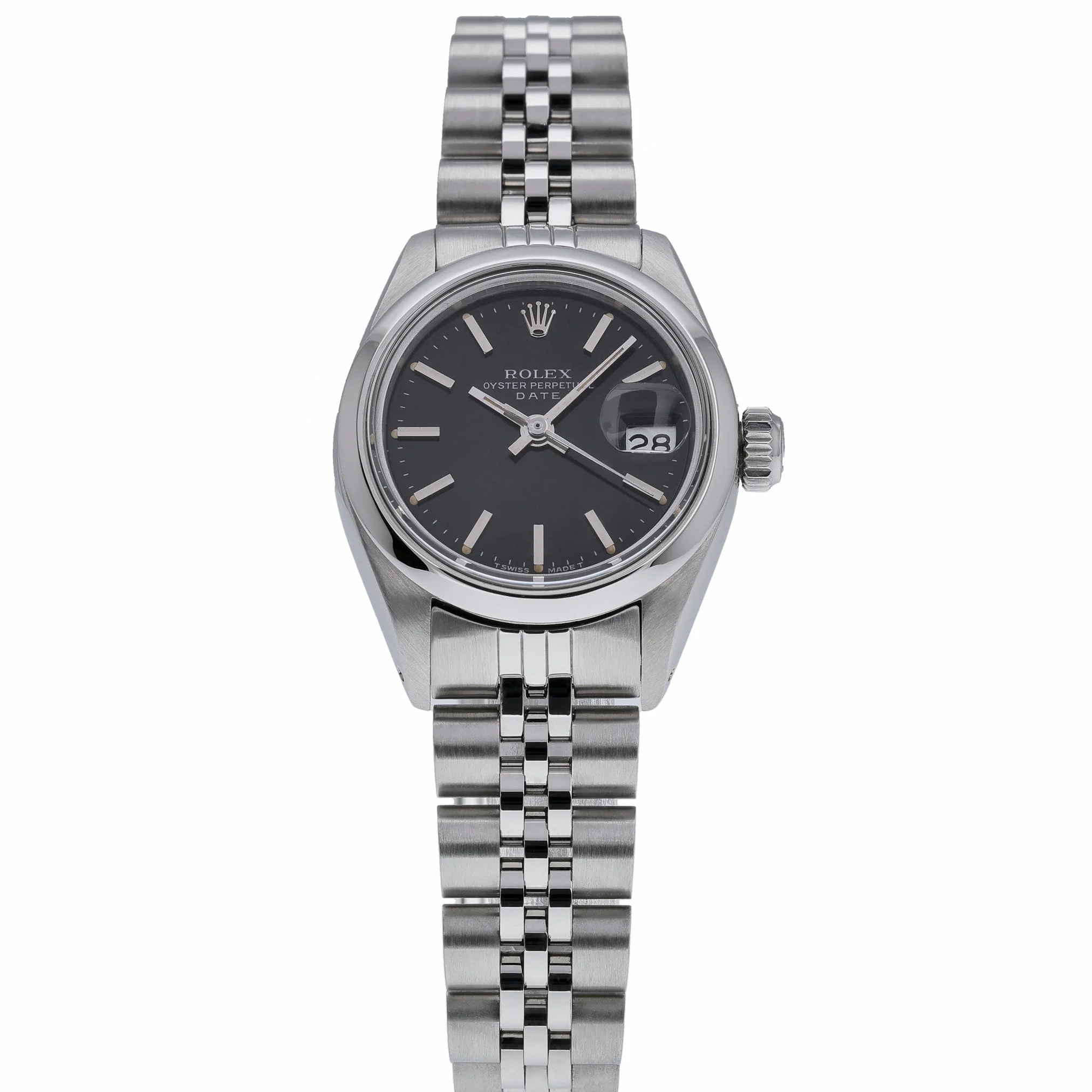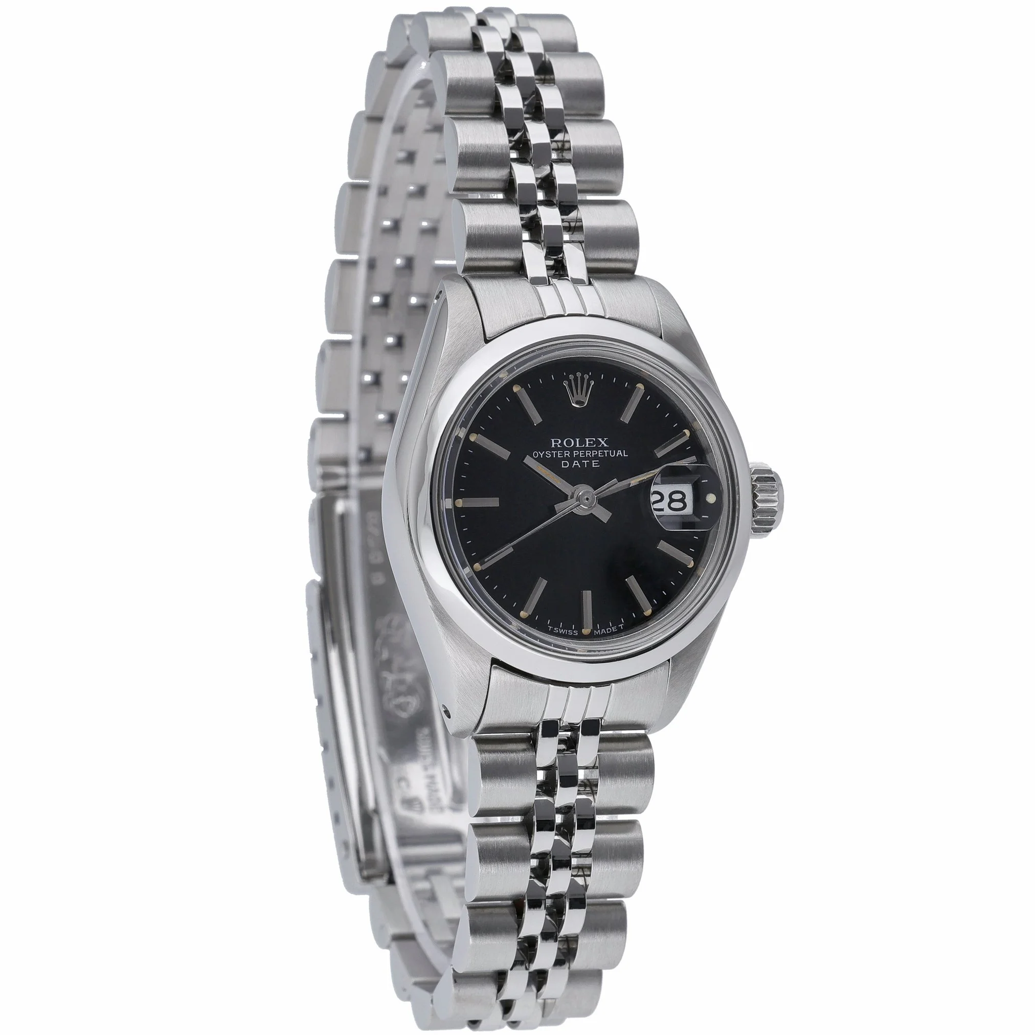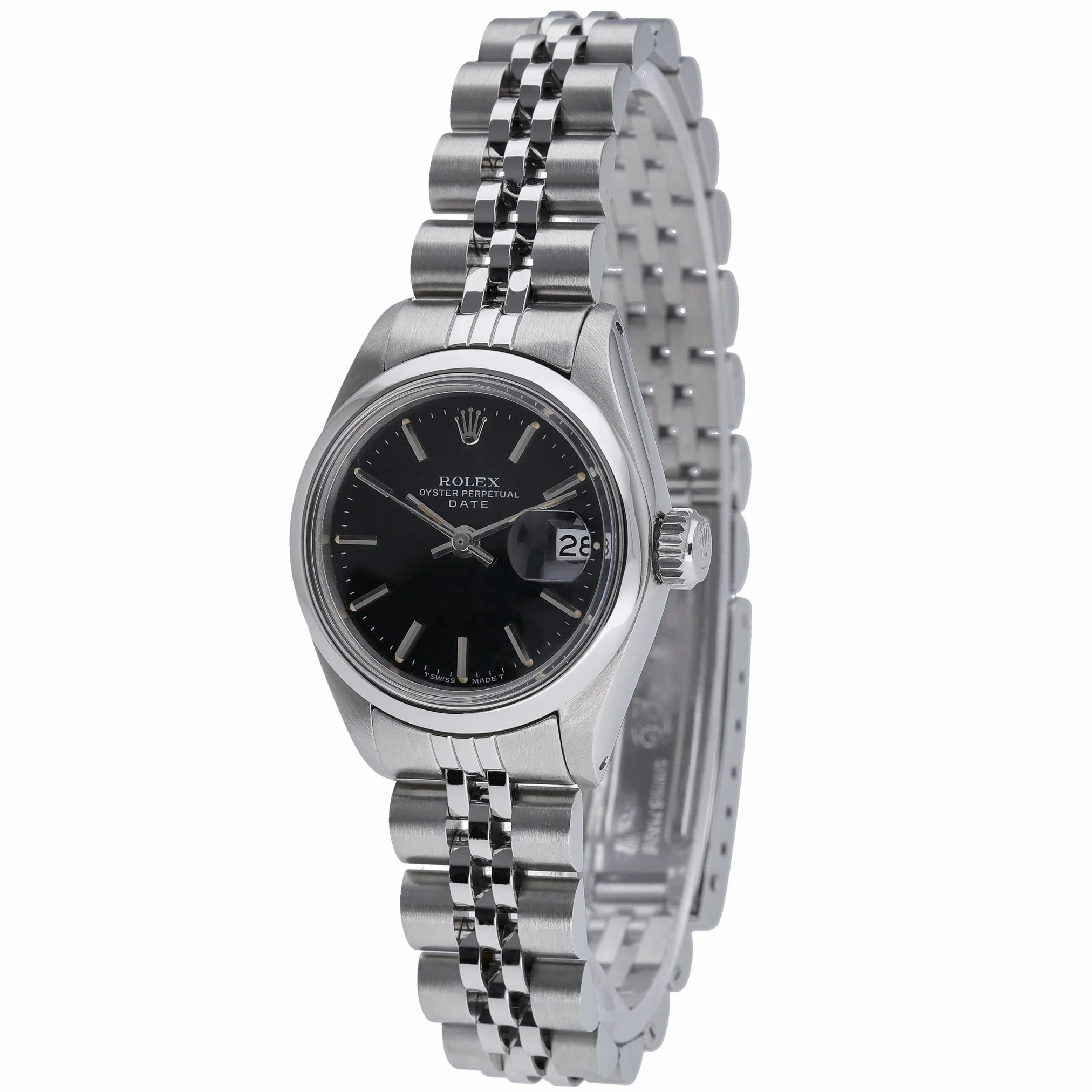 Timeless and refined, this vintage Rolex Date (ref. 6916, BQ Ref 51836) pairs a 26mm stainless steel case and domed bezel with a classic black baton dial beneath scratch-resistant sapphire crystal. The steel Jubilee bracelet and secure folding clasp enhance comfort and elegance, while tasteful diamond-set detailing adds a subtle touch of luxury. Powered by an automatic movement and water resistant to 100M, it’s a versatile everyday companion from 1979, offered in good condition. Supplied with its box, this piece includes next day delivery, a 14-day return policy, and the assurance of a 2-year warranty.