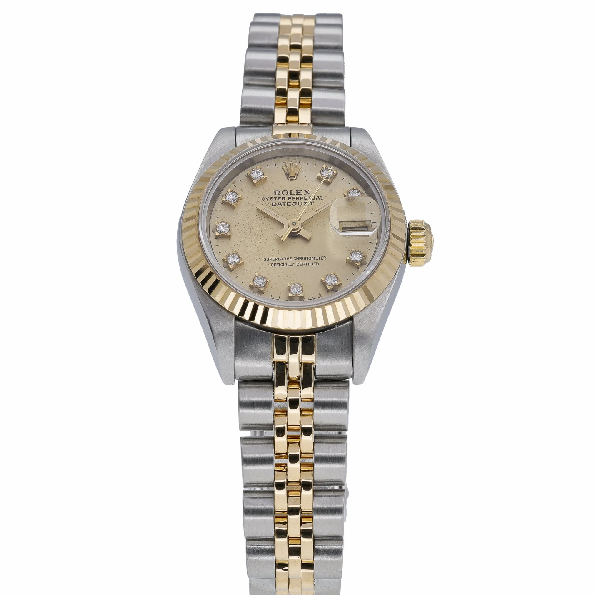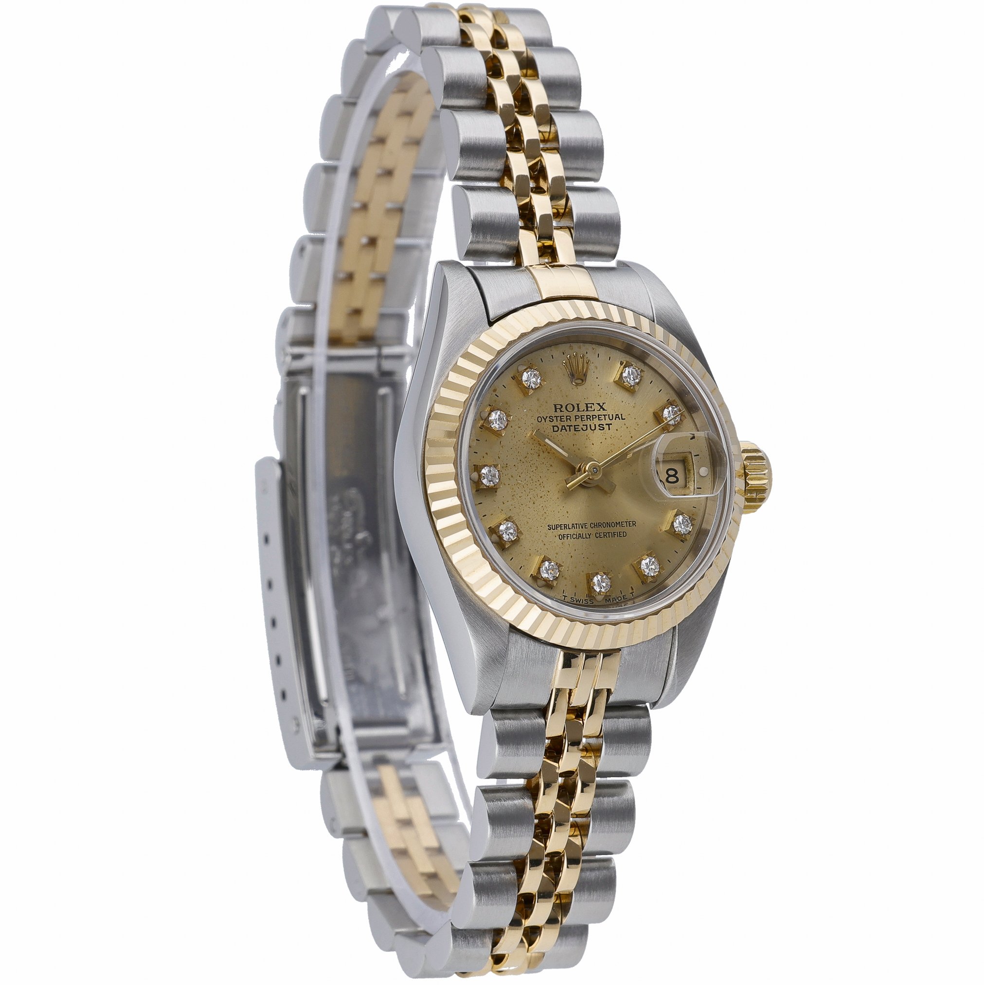 Timeless and refined, this ladies Rolex Datejust 26mm (ref. 79173) pairs a steel and yellow gold case with a matching Jubilee bracelet and fluted bezel for classic two‑tone elegance. The champagne diamond dial adds discreet sparkle, protected by a sapphire crystal, while the automatic movement delivers reliable precision. Presented in excellent condition and water resistant to 10 ATM, it features a folding clasp for secure, comfortable wear. Year of manufacture: 2000. Supplied with its original Rolex box, original papers, and green tag, this piece includes a 2 Year Warranty for peace of mind, plus Prompt Delivery and a 14 Day Return Policy for a seamless purchase experience. BQ Ref: 52912.