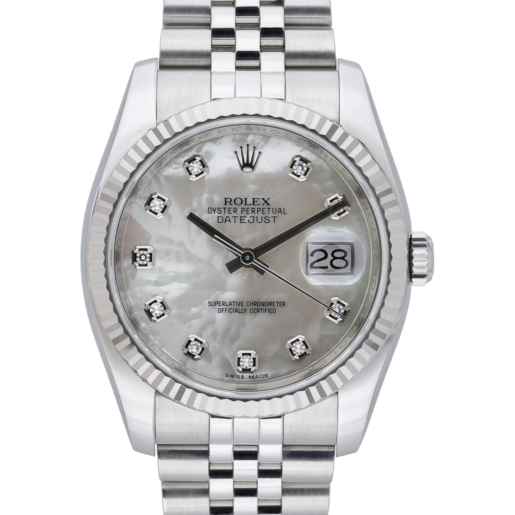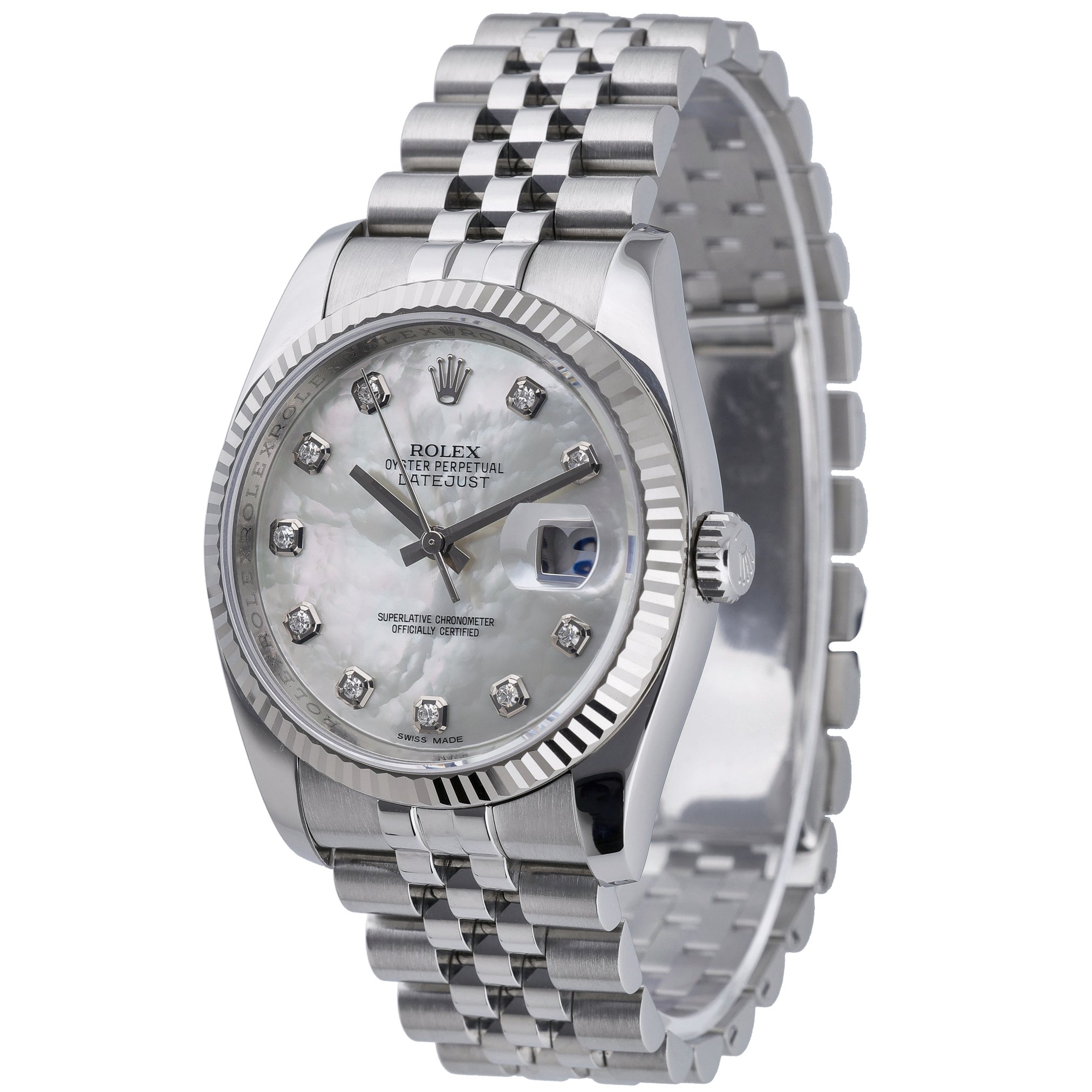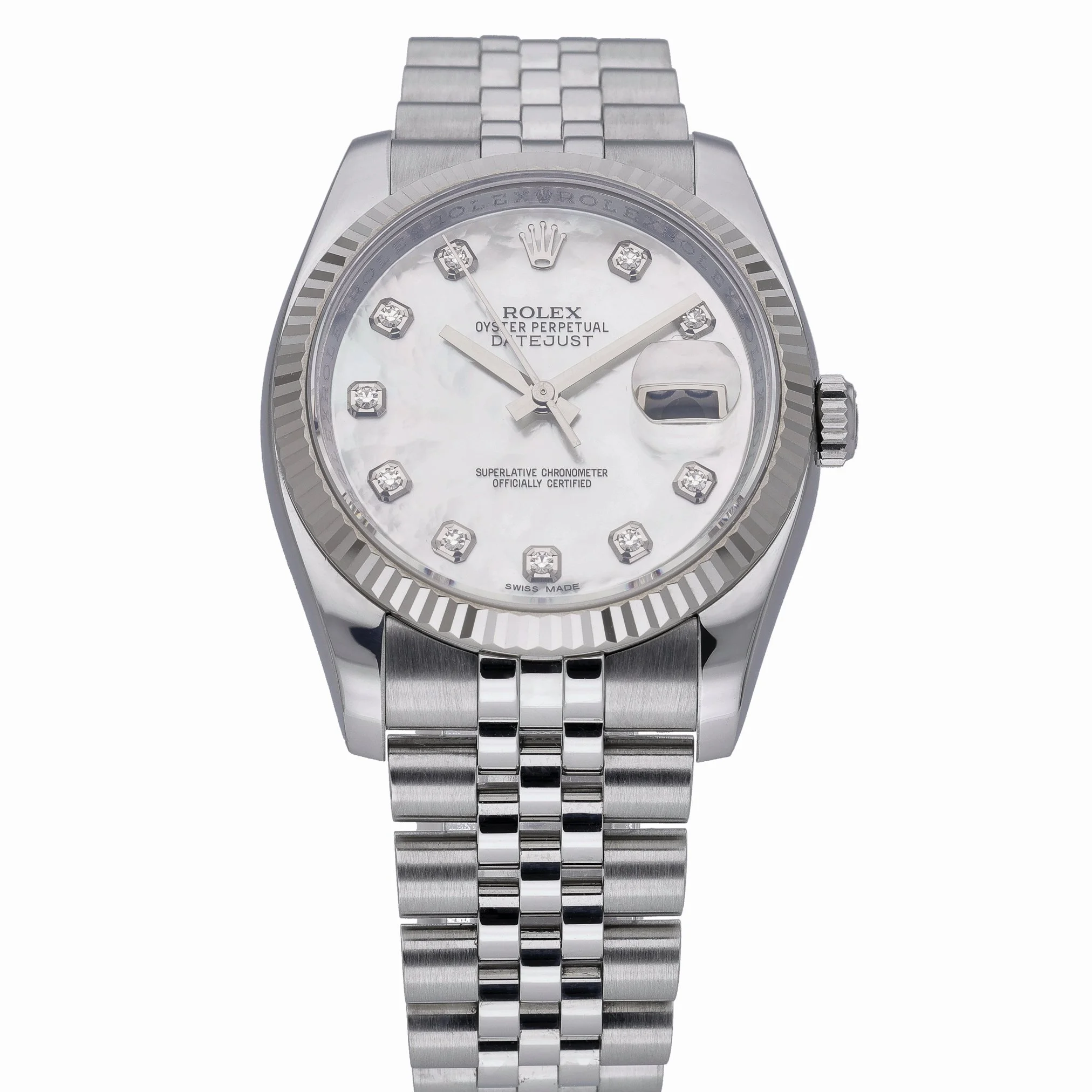 Elevate your collection with this 2014 Rolex Datejust 36 (ref. 116234), BQ Ref 52874. Crafted in steel with an 18 ct white gold fluted bezel, it features a luminous diamond‑set mother‑of‑pearl dial under scratch‑resistant sapphire crystal. The automatic movement is housed in a 36mm case with 100M water resistance, and it’s paired with the classic Jubilee bracelet in Oystersteel with a secure folding clasp. In excellent condition, this piece is supplied with its original Rolex box, papers, and green tag. Backed by our 2 Year Warranty, it also includes next day delivery and a 14 day return policy for complete peace of mind. A timeless and versatile Datejust that blends refined luxury with everyday practicality.
