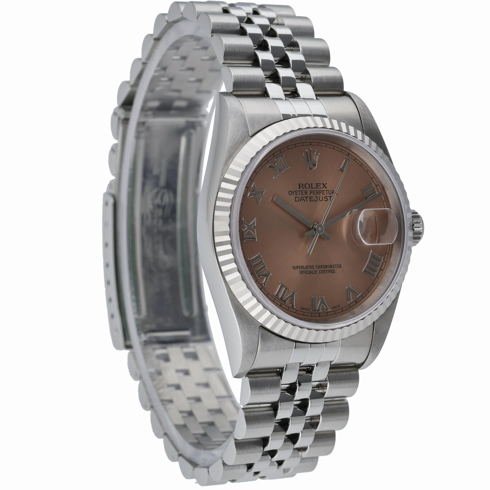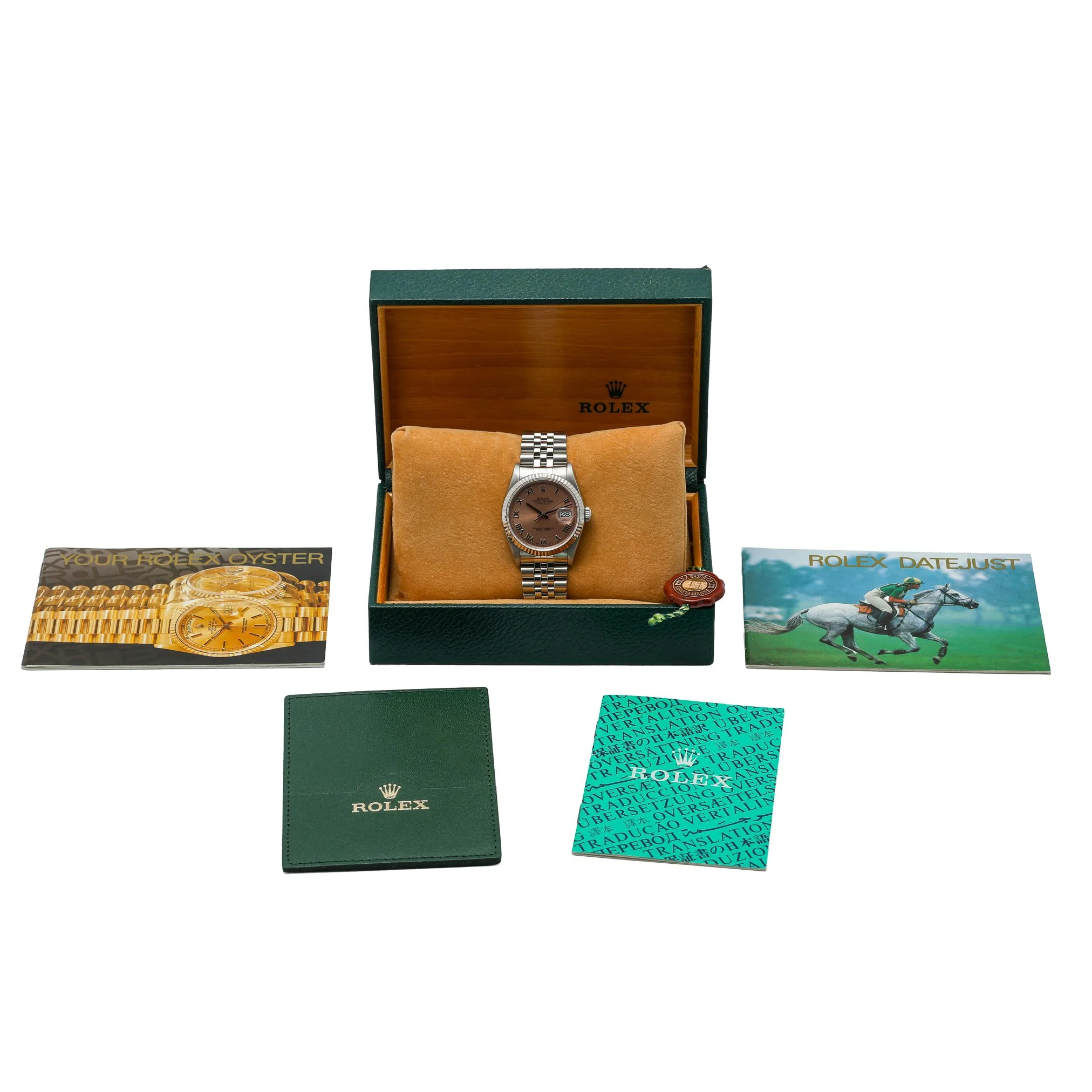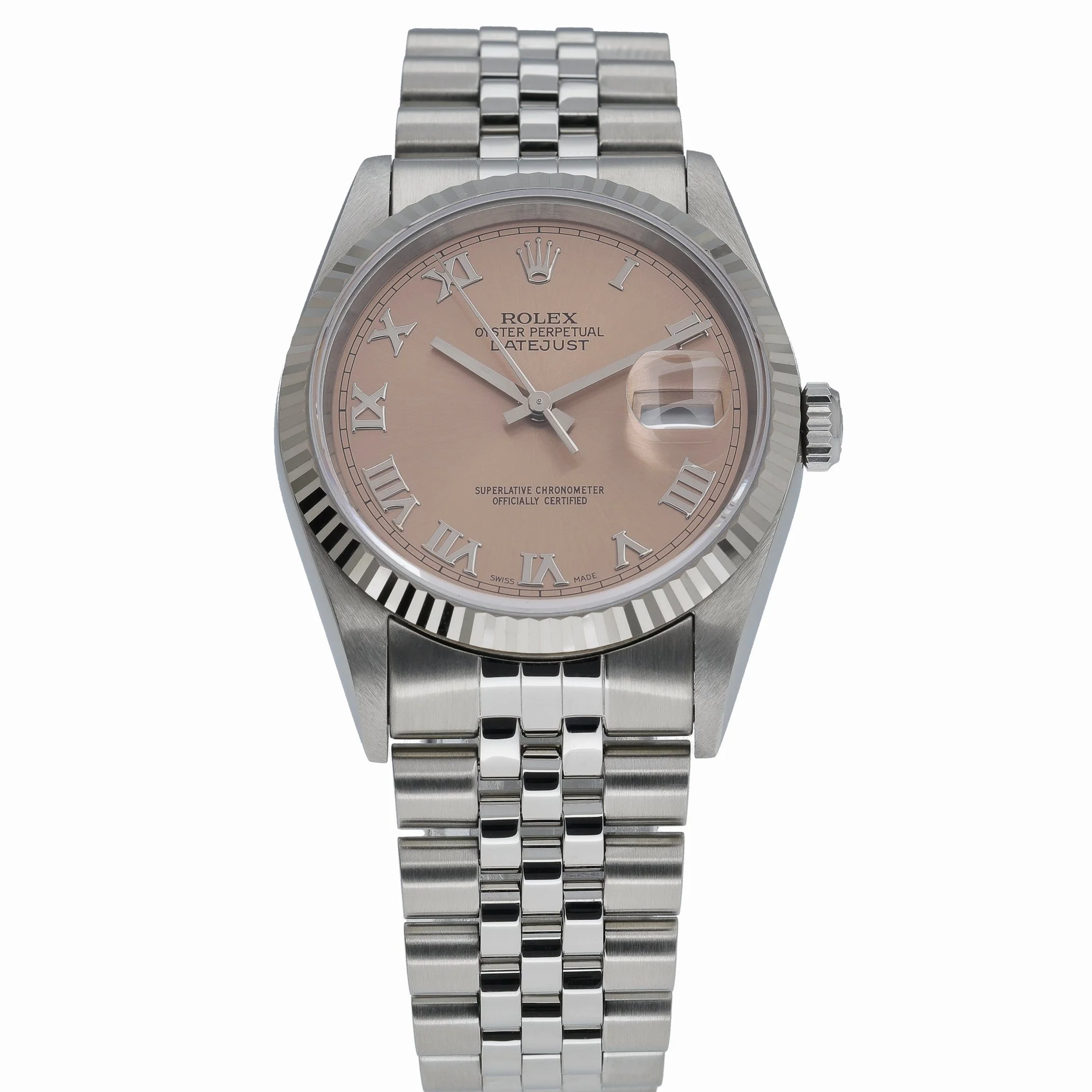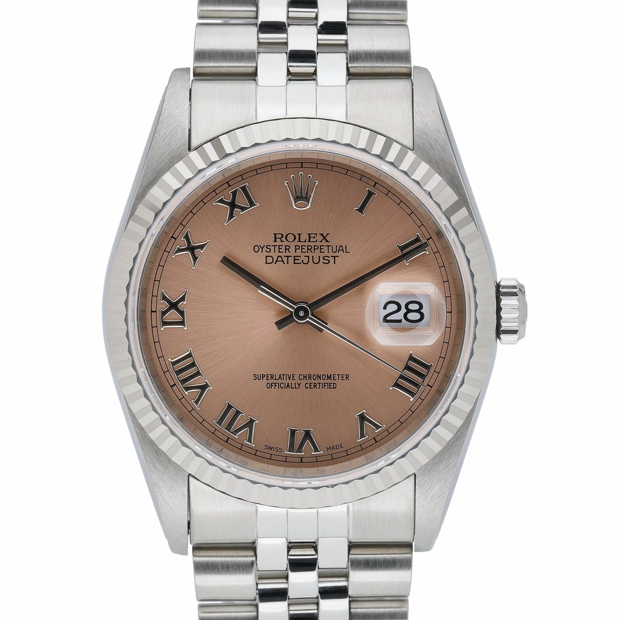 Rolex Datejust ref. 16234 (BQ Ref 52929), a timeless 36mm classic from 1997, presented in excellent condition. The steel case is paired with a white gold fluted bezel and a striking salmon dial with Roman numerals, protected by scratch‑resistant sapphire crystal. Powered by a reliable automatic movement and fitted to a steel Oyster bracelet with Oysterclasp, this Datejust offers everyday versatility with water resistance to 100M. Supplied with its box, it combines enduring style with practical performance. Covered by our 2 Year Warranty and supported by a 14 Day Return Policy, with Prompt Delivery available. A refined and collectible example of the quintessential Rolex dress‑sport watch.