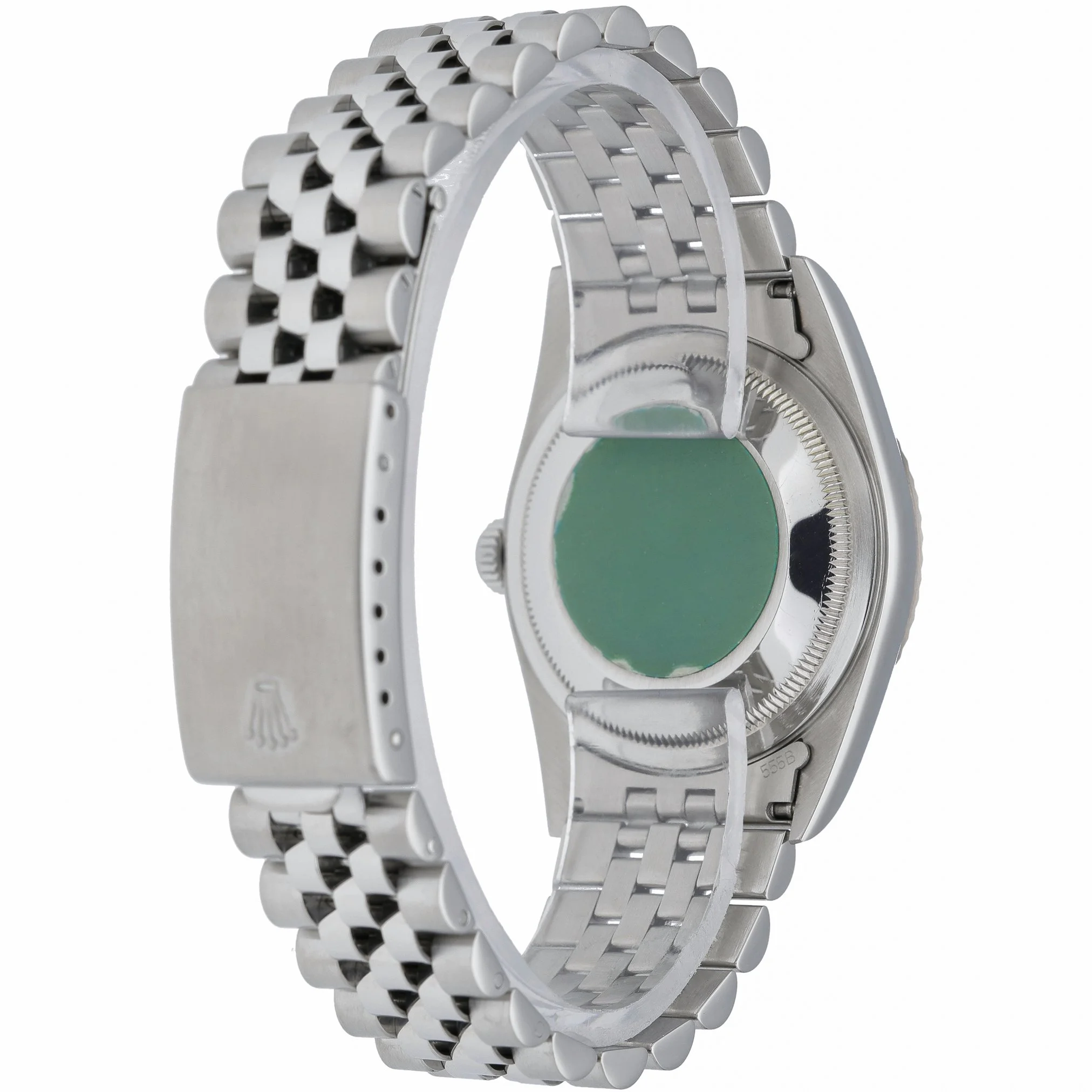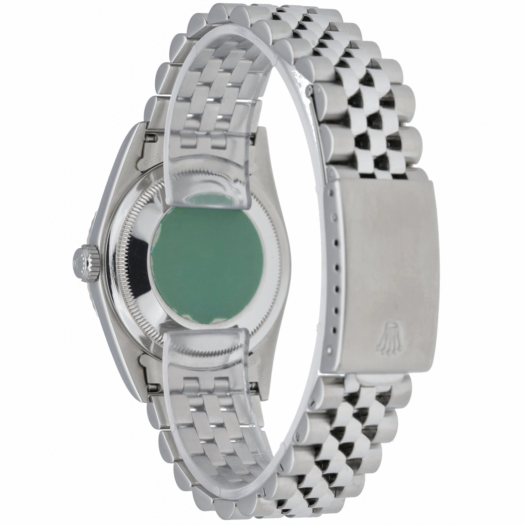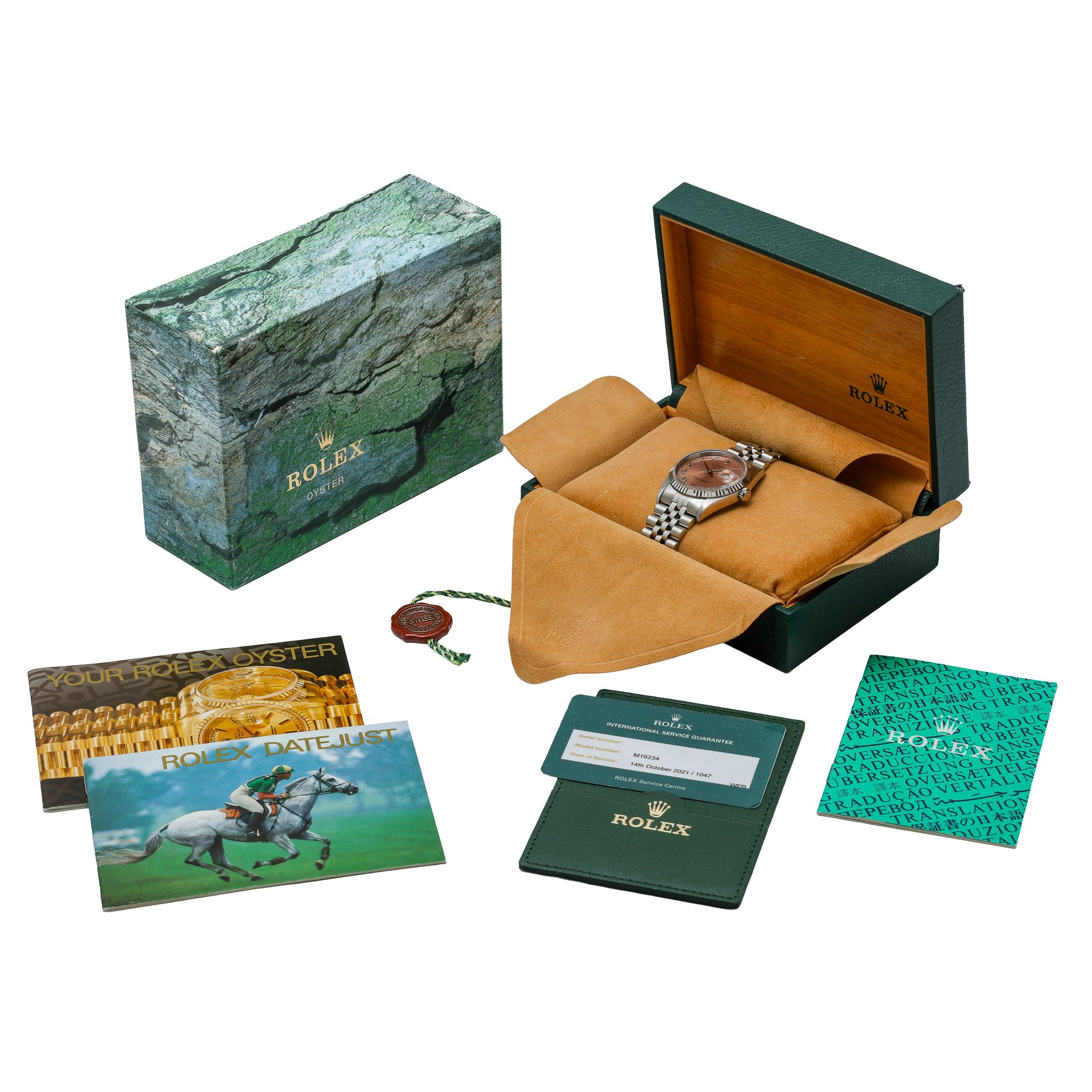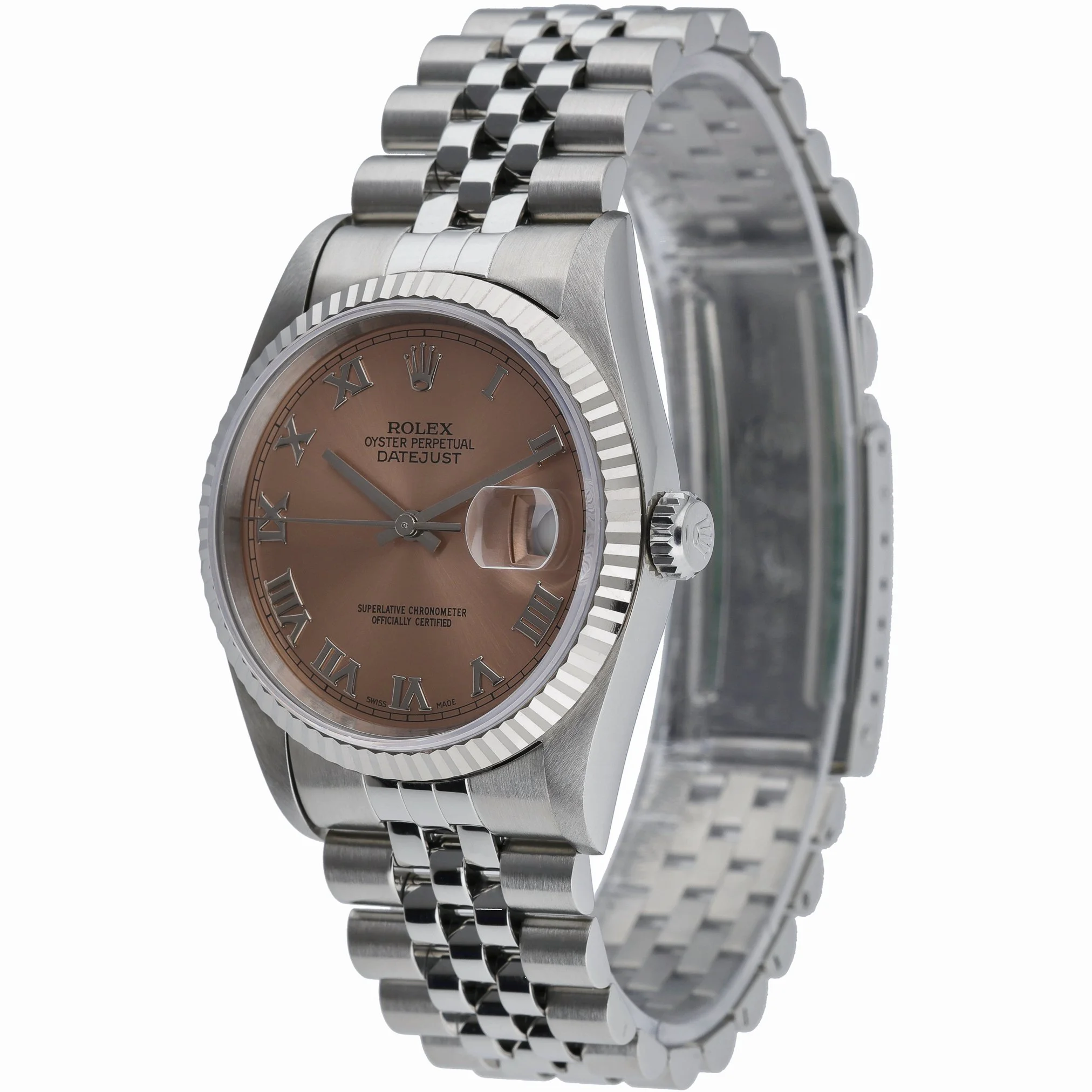 Rolex Datejust ref. 16234 (BQ Ref 52929), a timeless 36mm classic from 1997, presented in excellent condition. The steel case is paired with a white gold fluted bezel and a striking salmon dial with Roman numerals, protected by scratch‑resistant sapphire crystal. Powered by a reliable automatic movement and fitted to a steel Oyster bracelet with Oysterclasp, this Datejust offers everyday versatility with water resistance to 100M. Supplied with its box, it combines enduring style with practical performance. Covered by our 2 Year Warranty and supported by a 14 Day Return Policy, with Prompt Delivery available. A refined and collectible example of the quintessential Rolex dress‑sport watch.