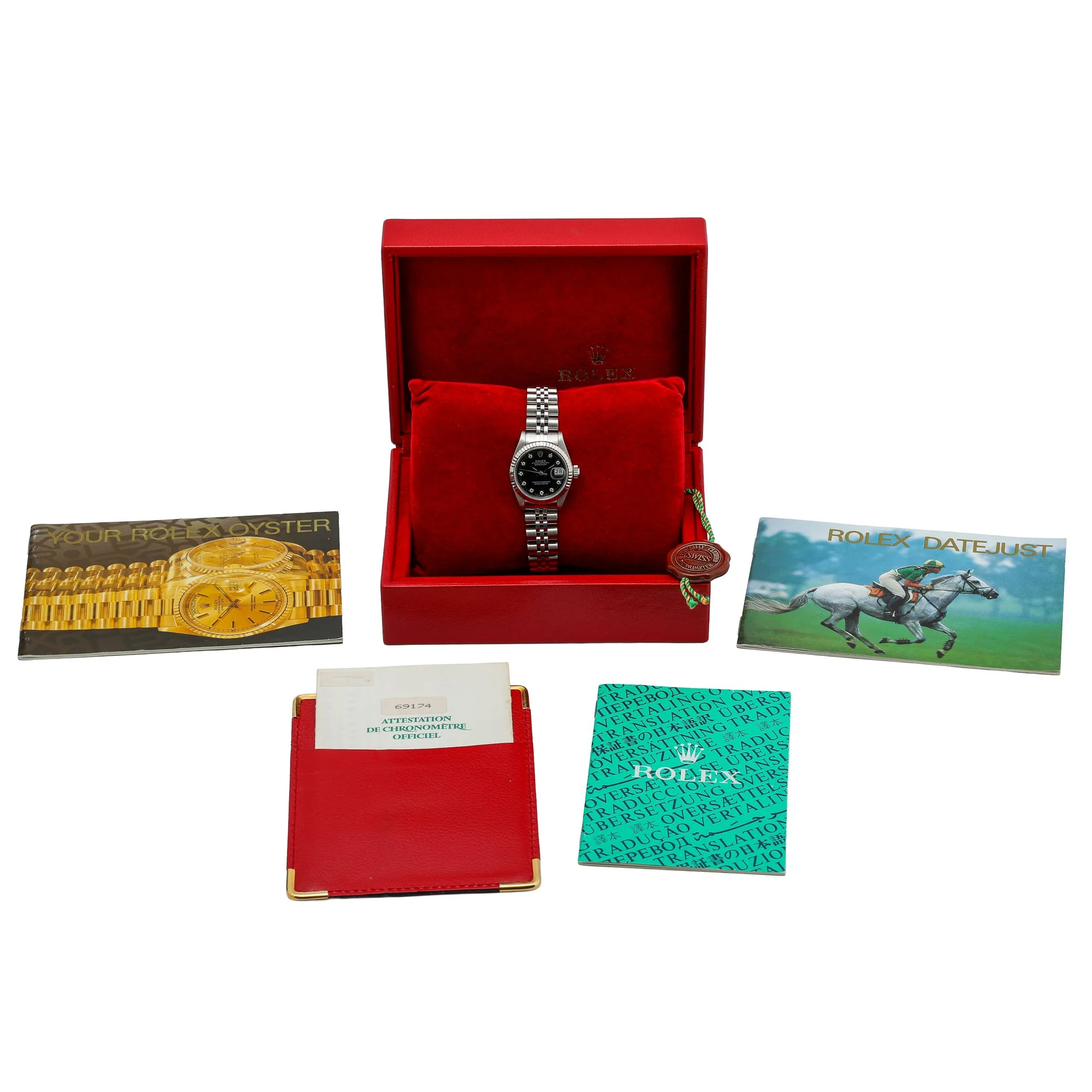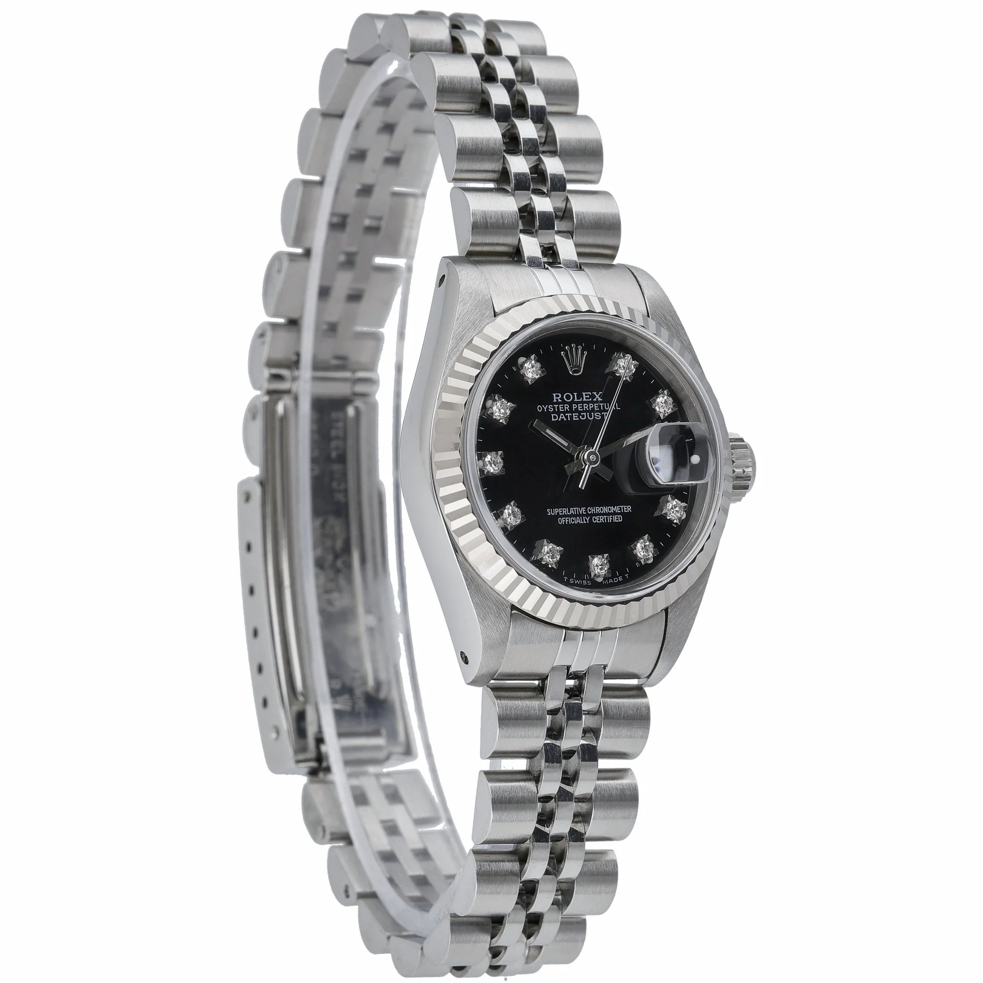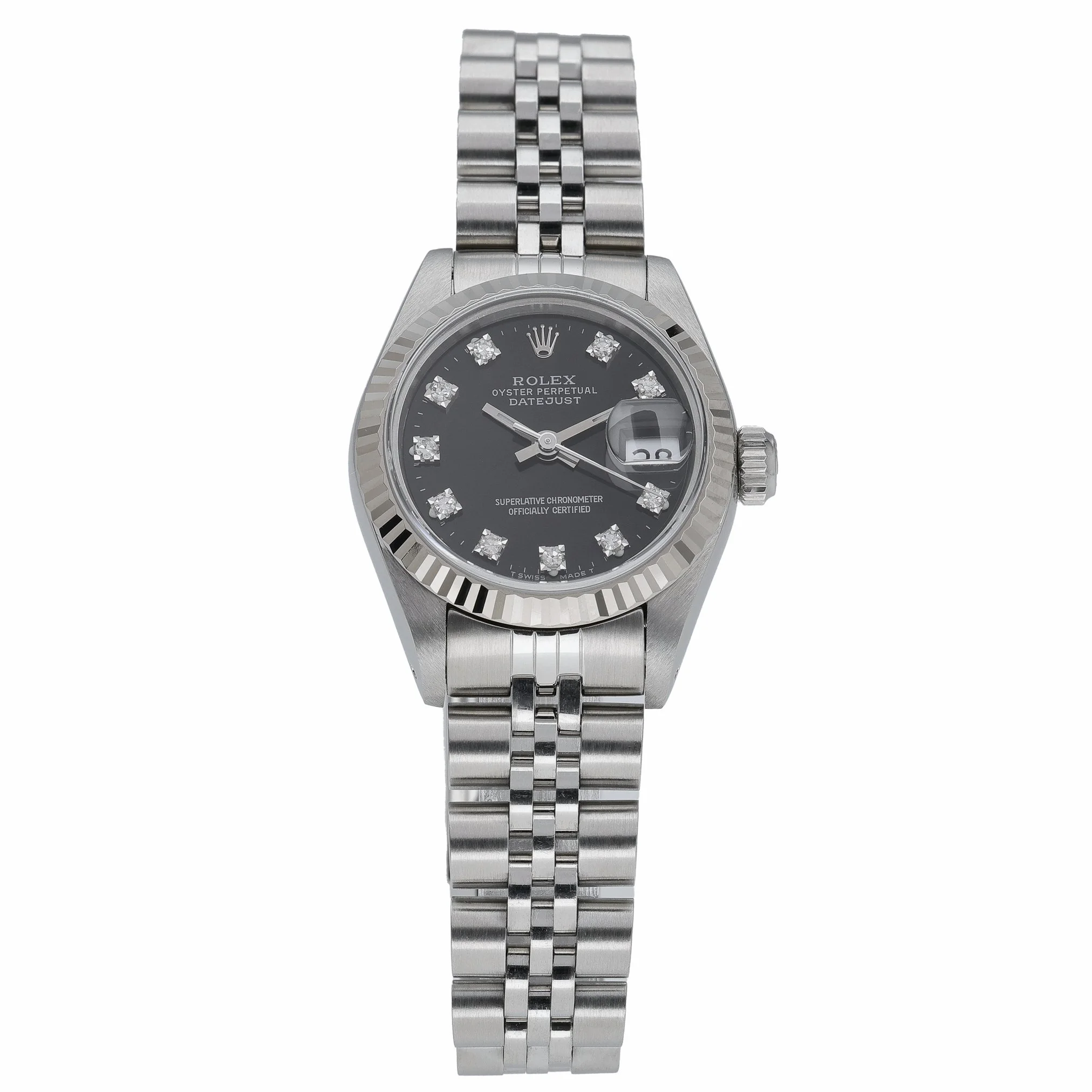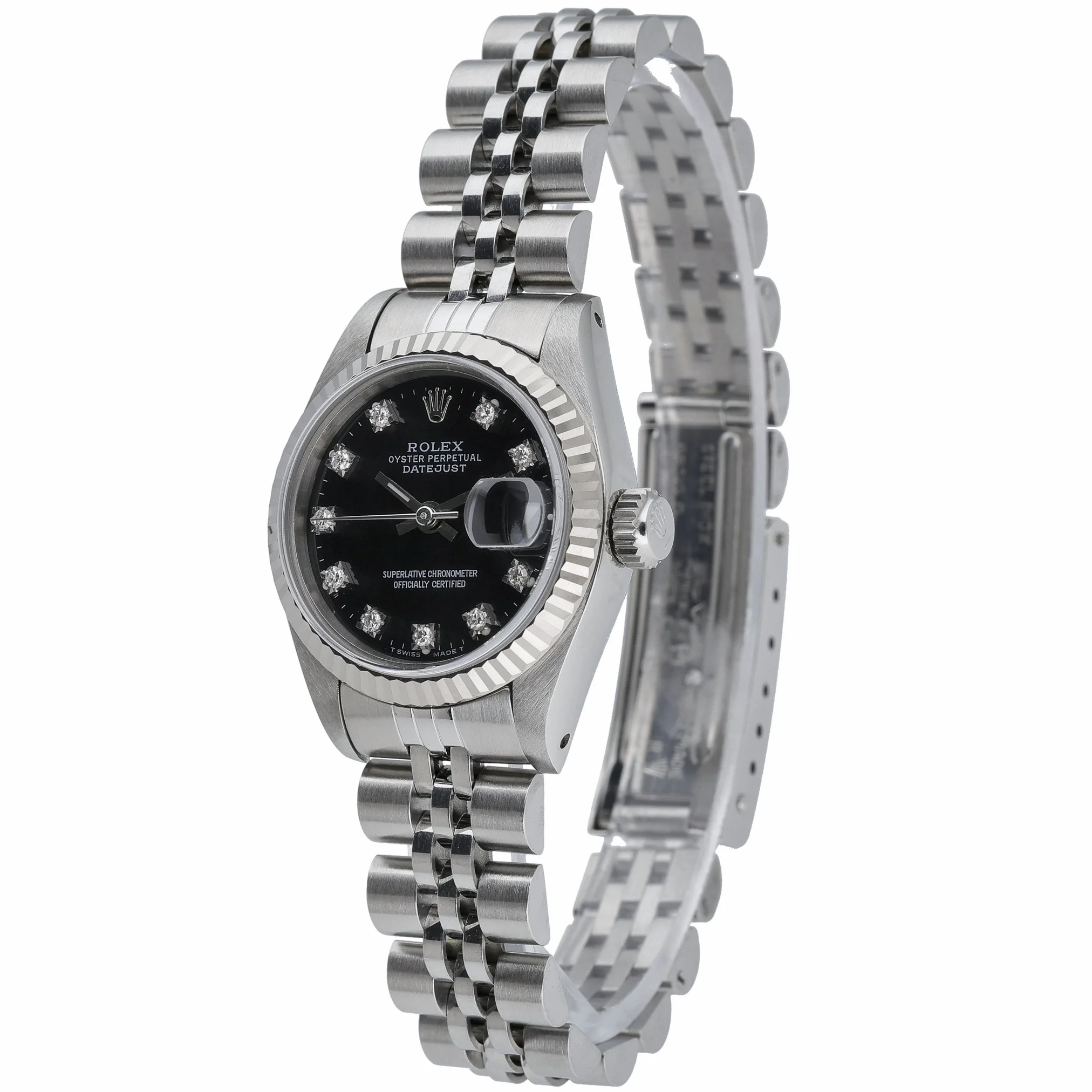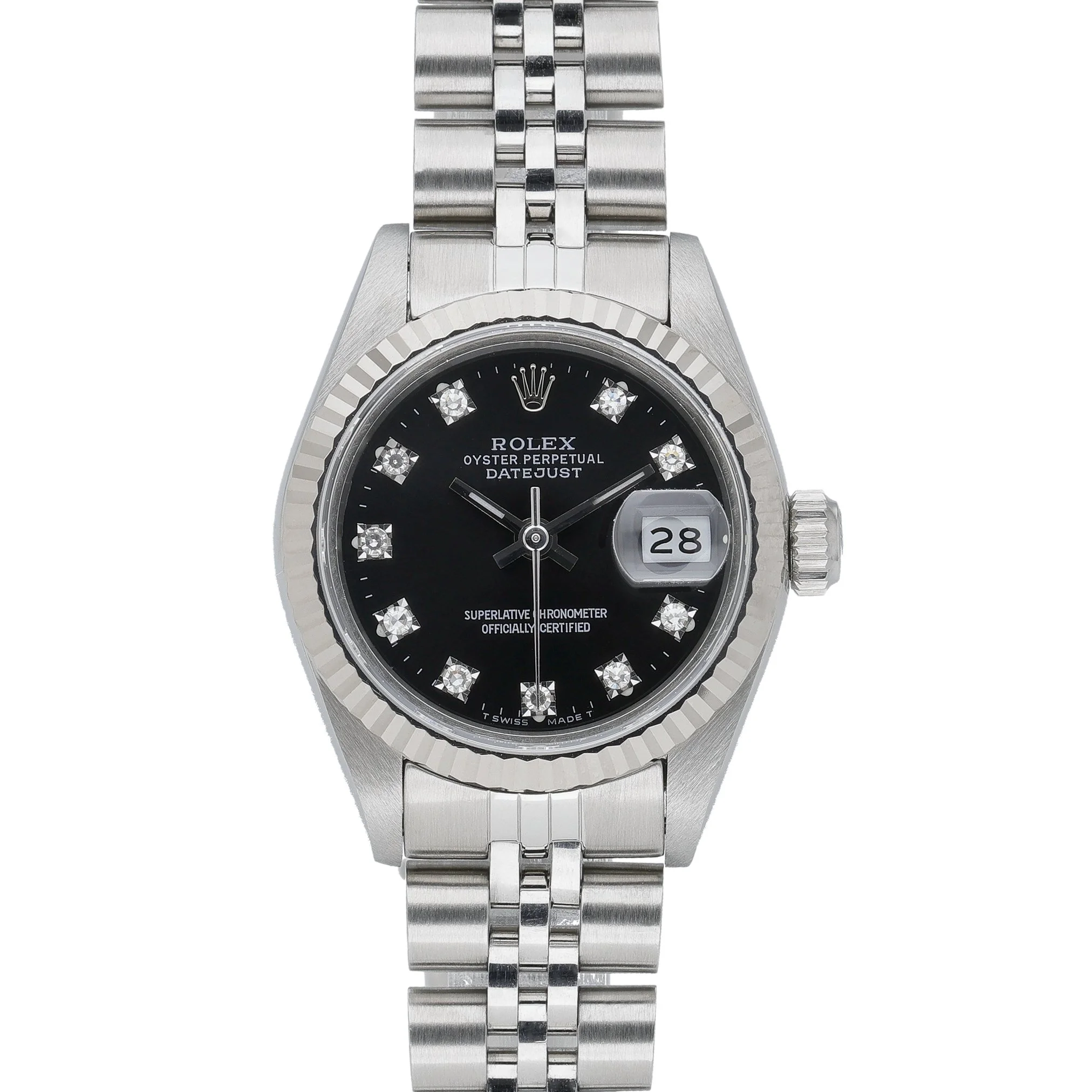 Elevate your collection with this ladies’ Rolex Datejust 26mm, ref. 69174 (BQ Ref 53286), crafted in steel with a white gold fluted bezel. The black dial is diamond-set and protected by sapphire crystal, paired with the classic steel Jubilee bracelet and secure folding clasp. Powered by an automatic movement and water resistant to 100M, this 1991 example is presented in excellent condition. Supplied with its original box and papers, it includes a 2 Year Warranty for peace of mind, plus our 14 Day Return Policy and Prompt Delivery. A timeless blend of elegance and everyday versatility, this Datejust is a refined choice for any occasion.