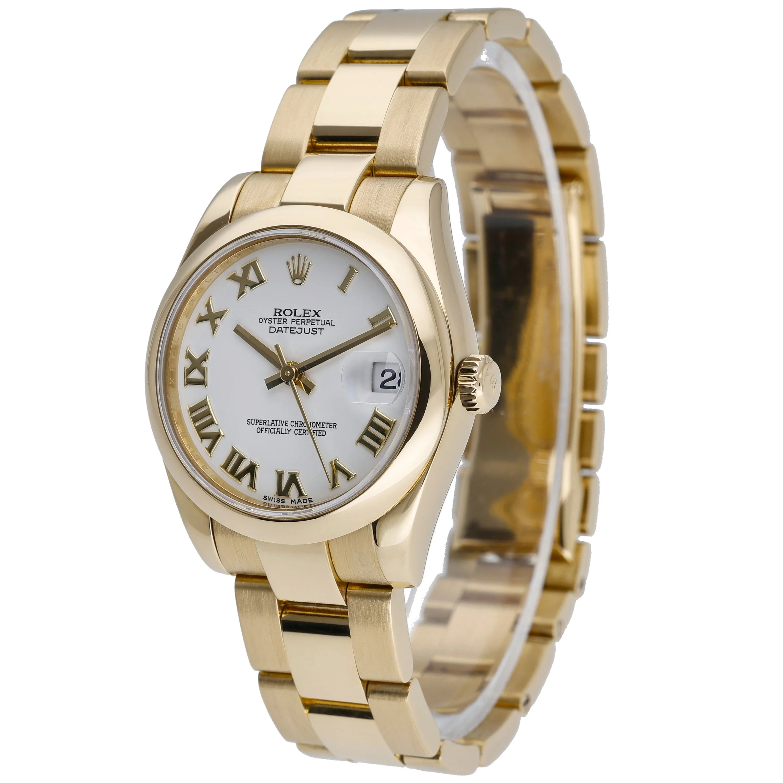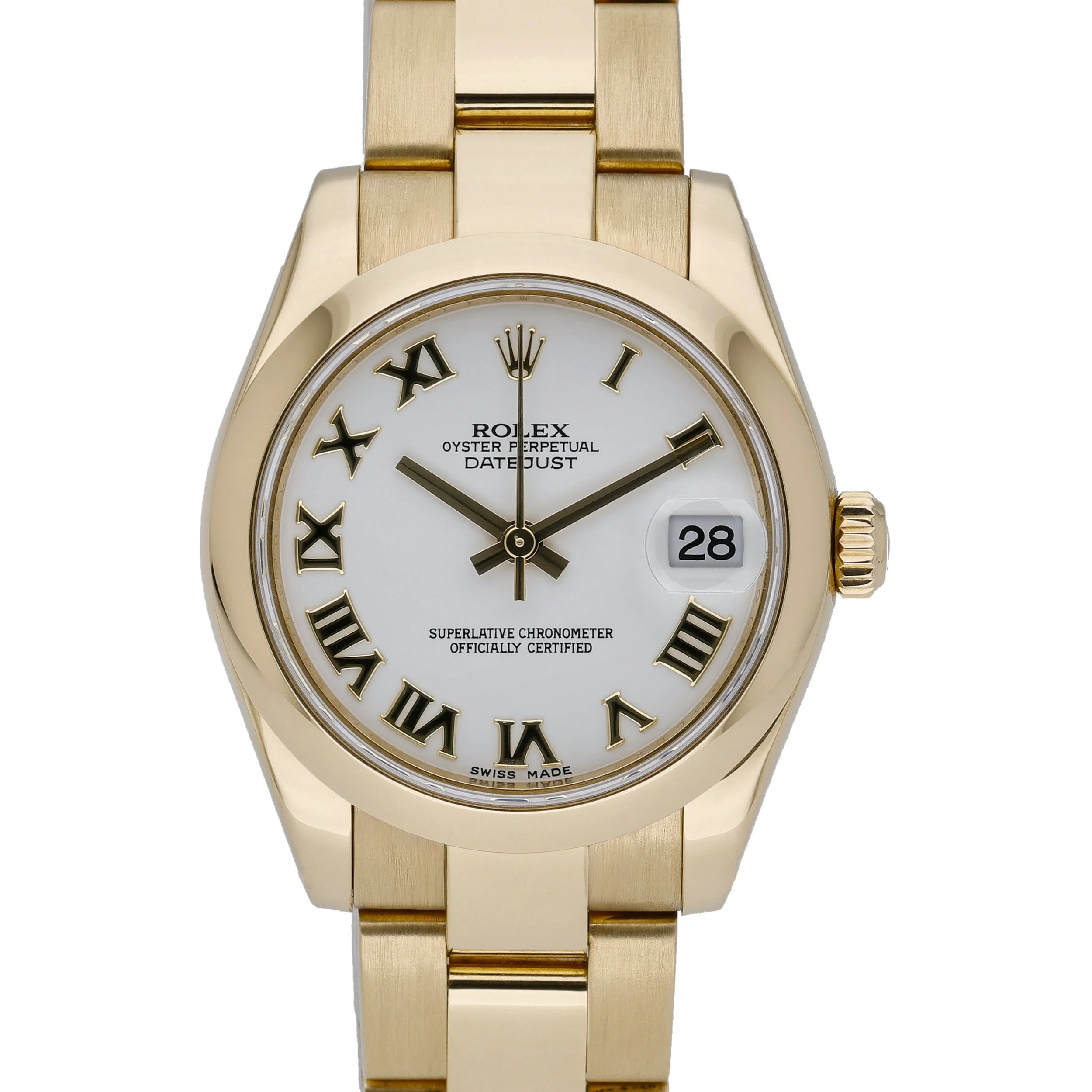 The Rolex Datejust 31 (ref. 178248) presents timeless elegance in solid 18ct yellow gold. Its 31mm case with domed bezel frames a crisp white Roman dial beneath scratch-resistant sapphire crystal, while the automatic movement delivers reliable precision. The matching 18ct yellow-gold Oyster bracelet with concealed clasp ensures a sleek, comfortable fit, and the watch is water resistant to 100M for everyday versatility. Produced in 2016 and in excellent condition, this midsize Datejust is offered as a complete set with original box, papers, and green tag. Supplied with a 2-year warranty, 14-day return policy, and next-day delivery for your convenience. BQ Ref: 52438.