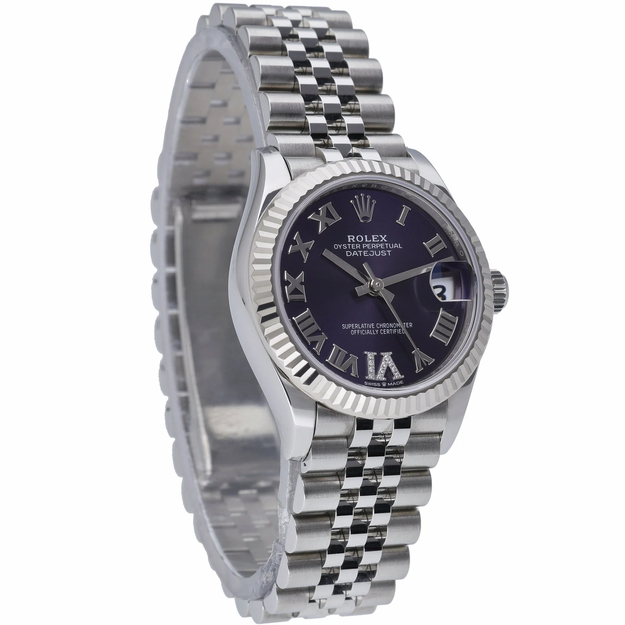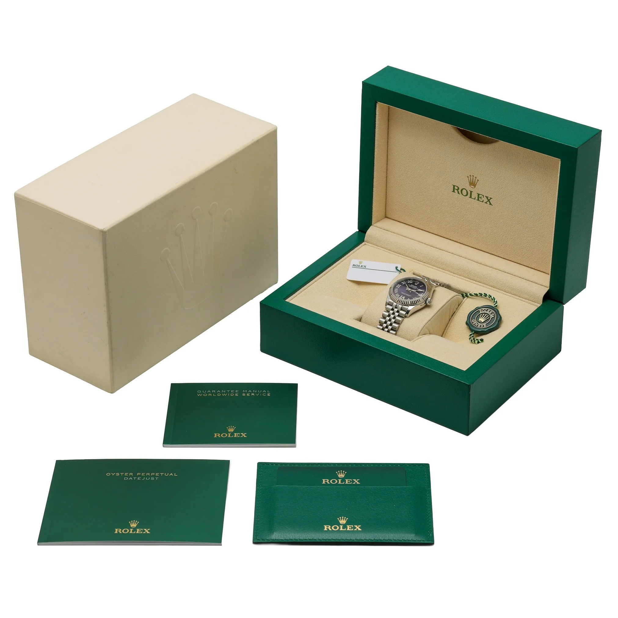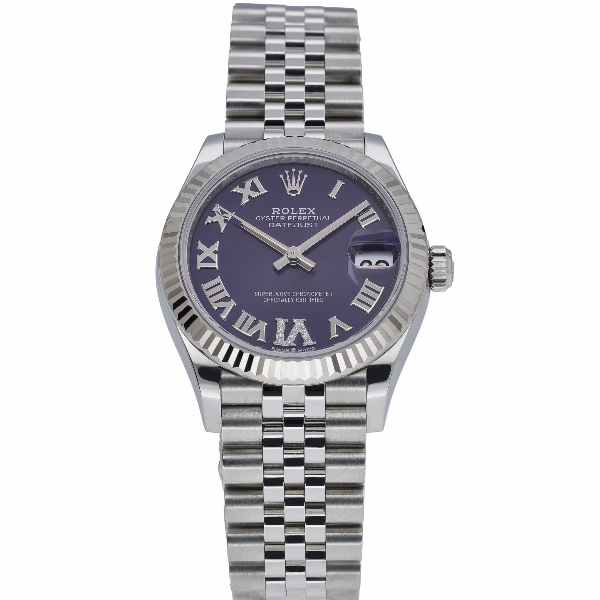This 2022 Rolex Datejust 31, ref. 278274 (BQ Ref 53321), blends timeless elegance with everyday performance. The 31mm steel and white gold case is crowned by a fluted bezel and sealed with scratch-resistant sapphire crystal, protecting an aubergine dial with Roman numerals. An automatic movement delivers reliable precision, while 100m water resistance readies it for daily wear. The watch is paired with a Jubilee bracelet in Oystersteel featuring a concealed clasp for a seamless fit. In excellent condition, it is supplied with its original box, papers, and white tag. Enjoy peace of mind with our 2 Year Warranty and 14 Day Return Policy, plus Prompt Delivery.