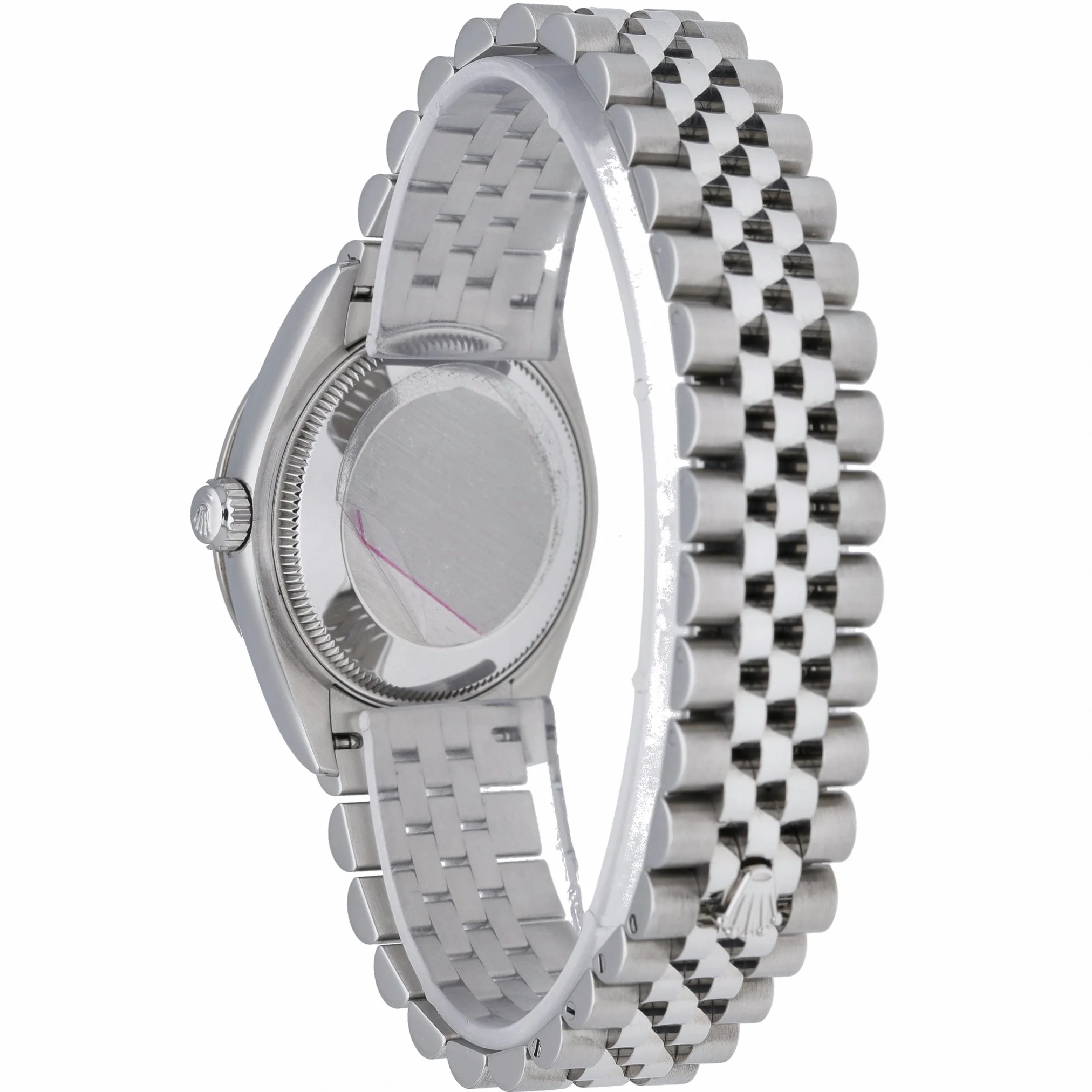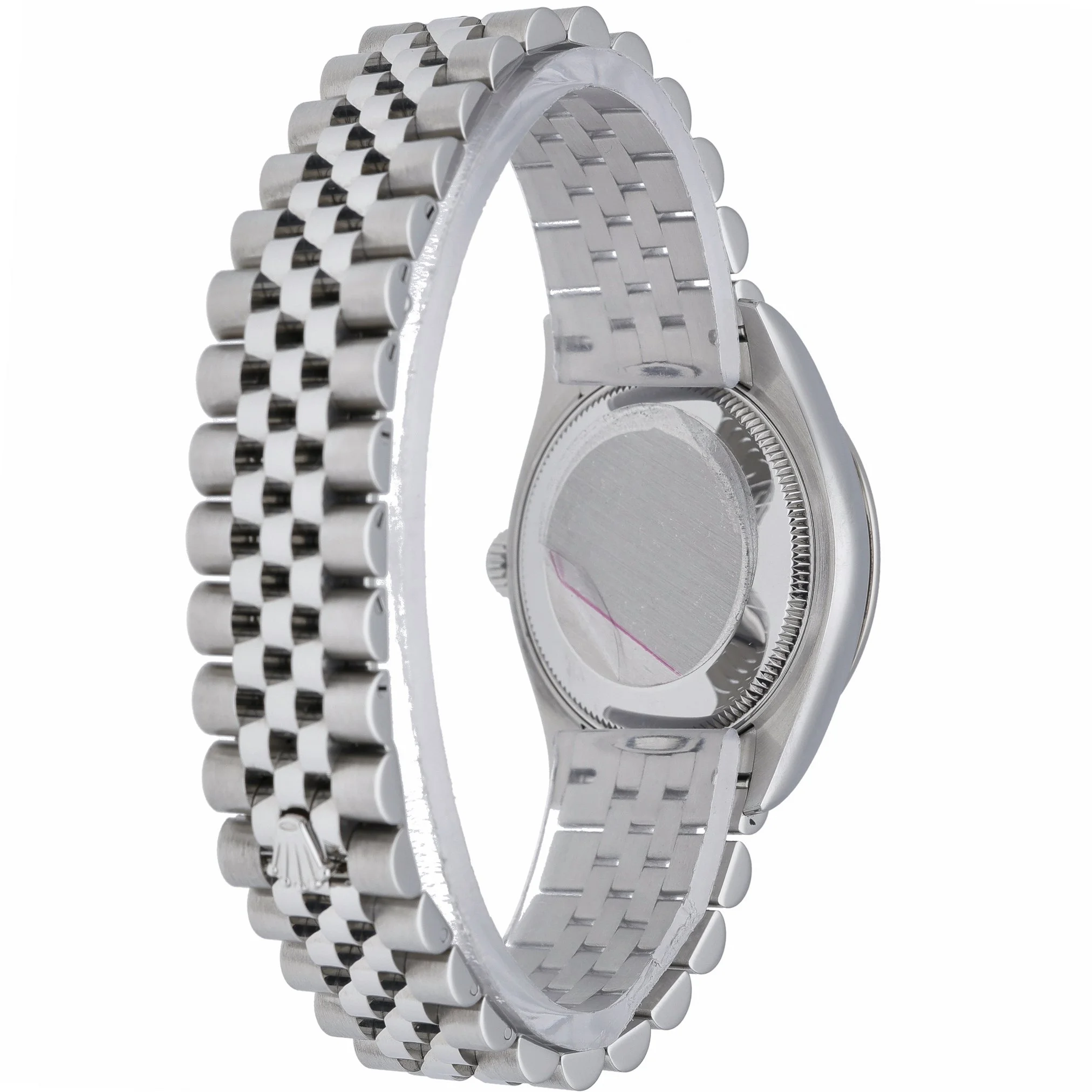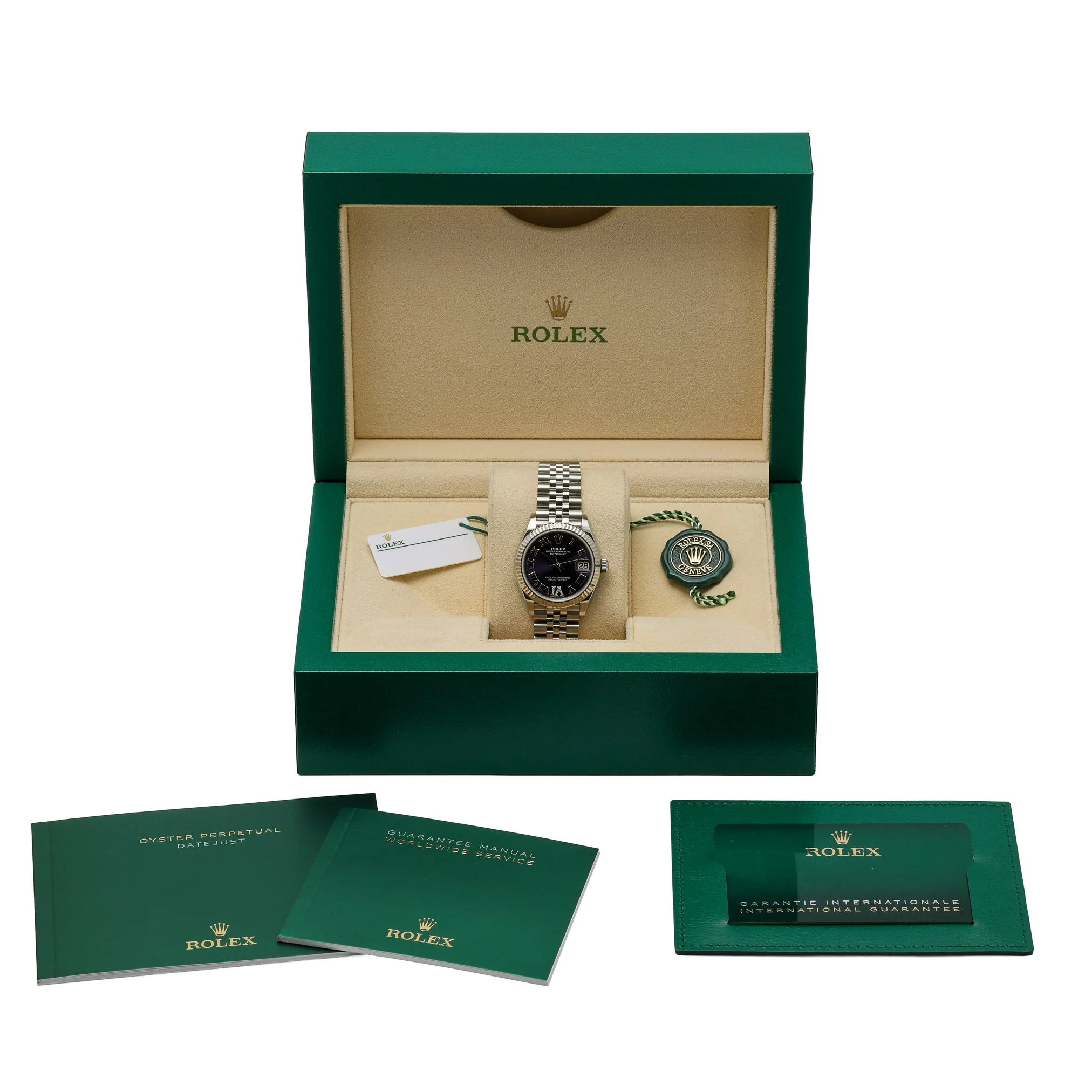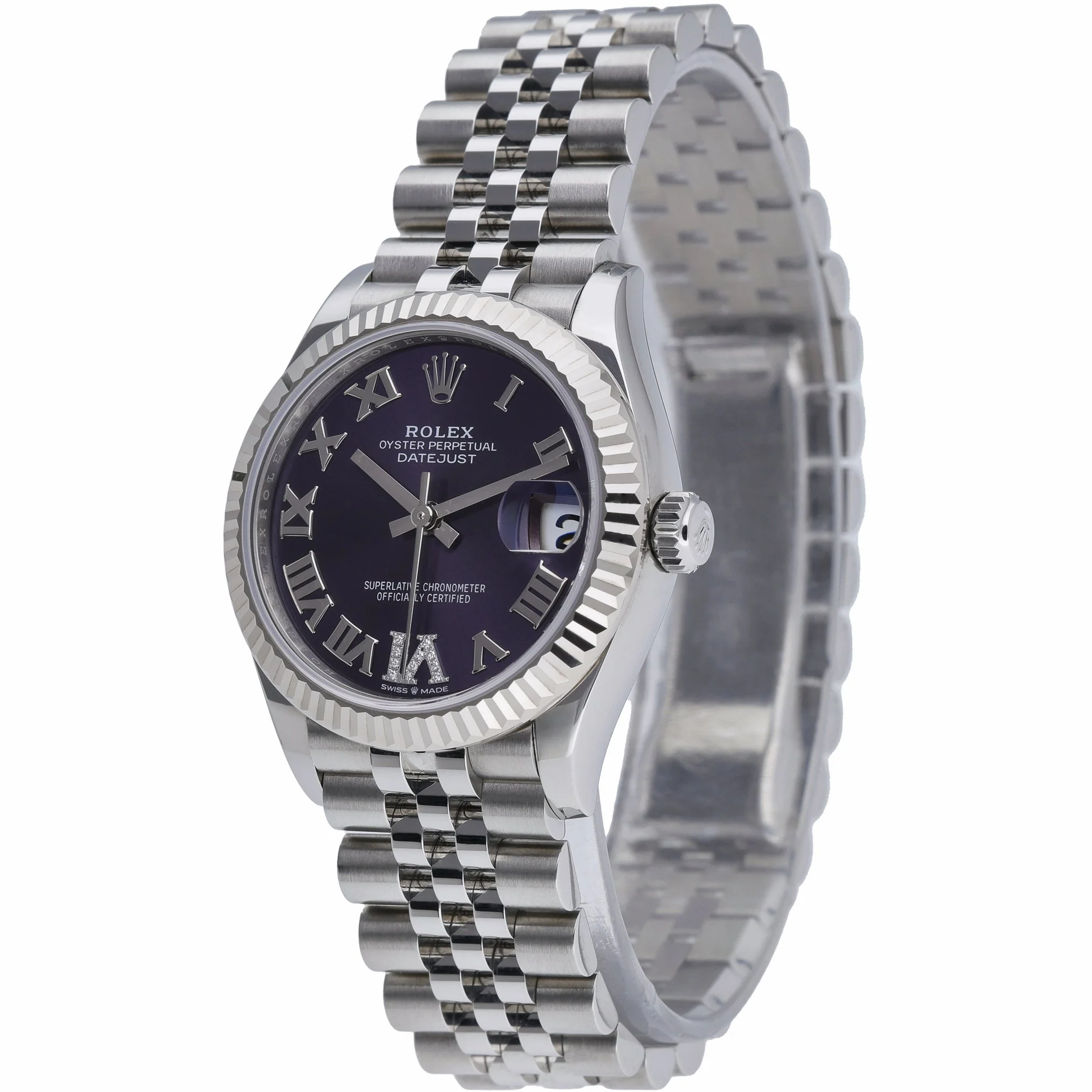 This 2022 Rolex Datejust 31, ref. 278274 (BQ Ref 53321), blends timeless elegance with everyday performance. The 31mm steel and white gold case is crowned by a fluted bezel and sealed with scratch-resistant sapphire crystal, protecting an aubergine dial with Roman numerals. An automatic movement delivers reliable precision, while 100m water resistance readies it for daily wear. The watch is paired with a Jubilee bracelet in Oystersteel featuring a concealed clasp for a seamless fit. In excellent condition, it is supplied with its original box, papers, and white tag. Enjoy peace of mind with our 2 Year Warranty and 14 Day Return Policy, plus Prompt Delivery.