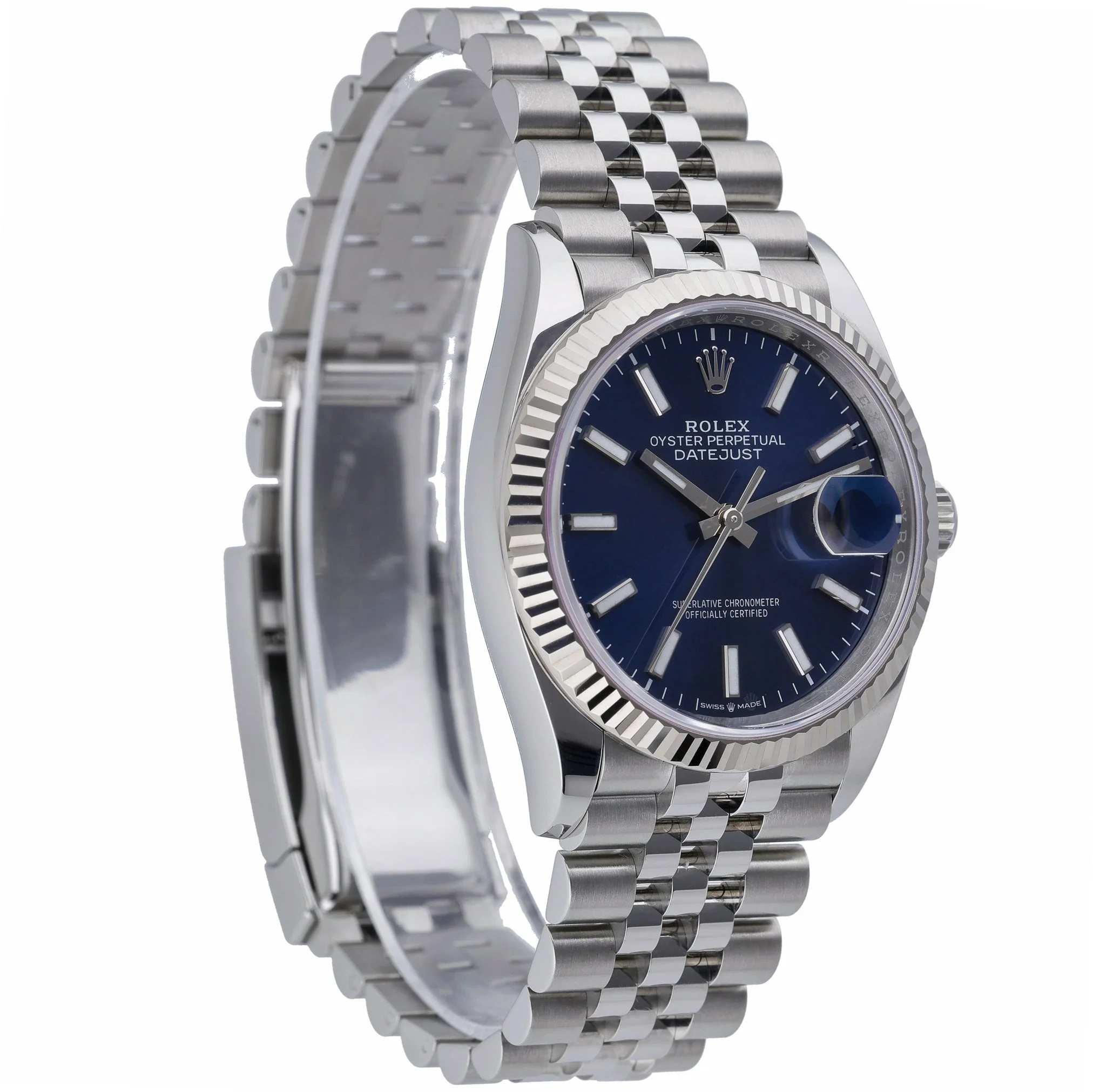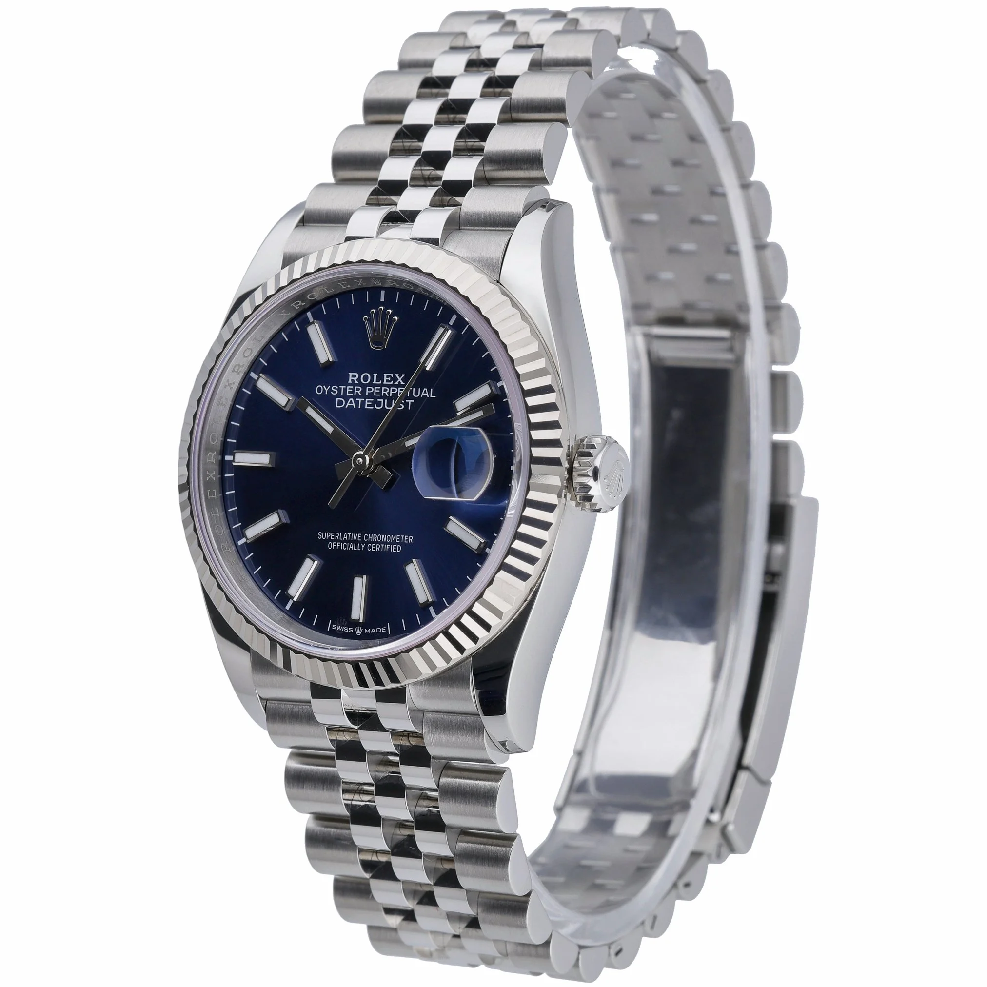 Timeless and versatile, the Rolex Datejust 36 ref. 126234 pairs an Oystersteel case and Jubilee bracelet with a signature white gold fluted bezel. Its striking blue baton dial sits beneath scratch‑resistant sapphire crystal, powered by a precise automatic movement and secured with a folding clasp. Measuring 36mm and water resistant to 100M, this 2025 example is in excellent condition and offers everyday robustness with refined elegance. Supplied with original box, papers, and white tag, it is covered by the Rolex 5‑year manufacturer’s warranty from the 2025 date of manufacture. Enjoy peace of mind with our 14 Day Return Policy and the convenience of Prompt Delivery. BQ Ref: 52772.