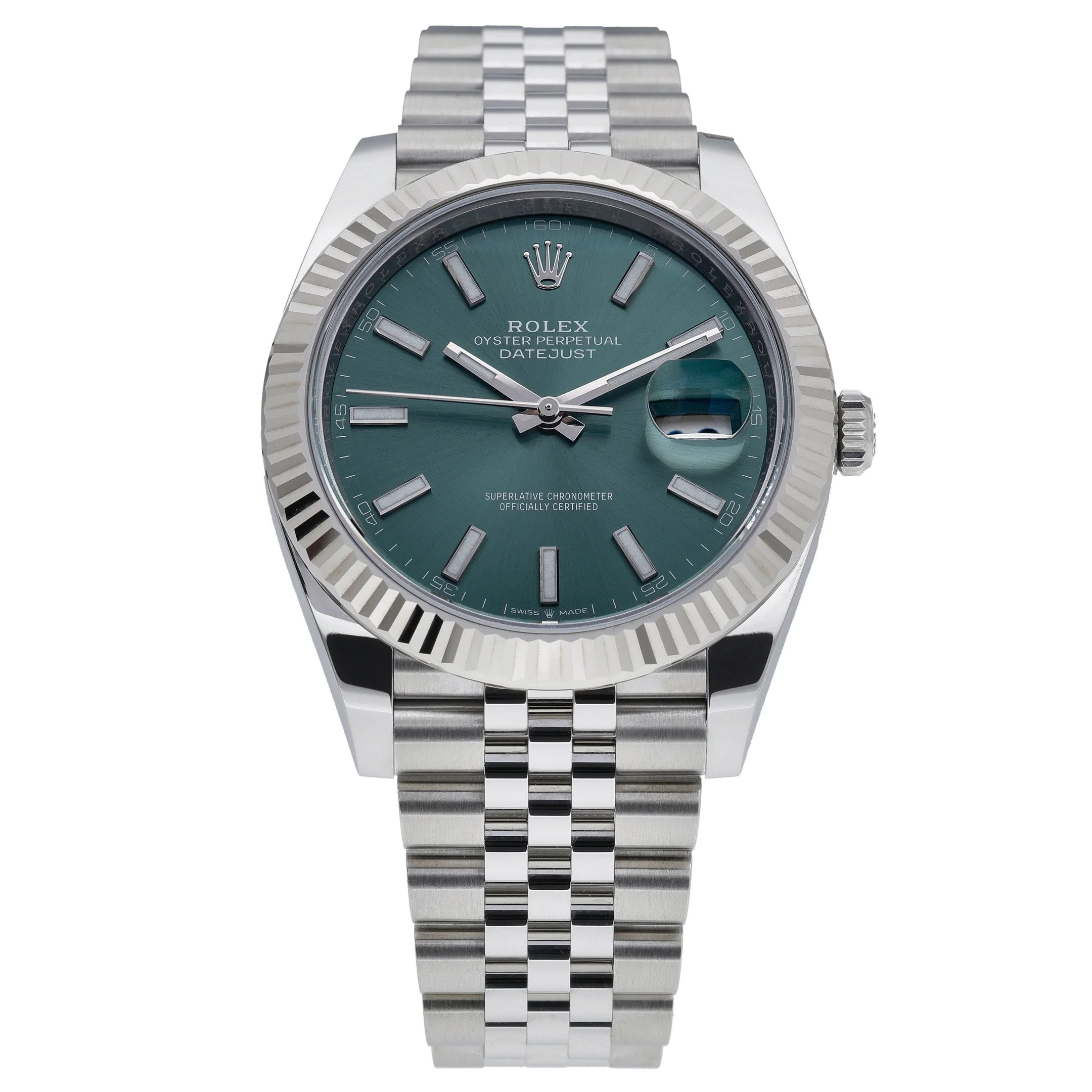Presenting the Rolex Datejust 41 (ref. 126334), a new/unworn 2026 example that blends classic elegance with everyday performance. Its 41mm case in steel and white gold is crowned by a signature fluted bezel, framing a striking green baton dial protected by sapphire crystal. Powered by a precise automatic movement and water resistant to 100M, it’s paired with a Jubilee bracelet in Oystersteel secured by an Oysterclasp for refined comfort. Supplied with Rolex box, original papers, and original white tag, this watch is covered by a 5-year manufacturer’s warranty running from the 2026 date of manufacture. Prompt Delivery and a 14 Day Return Policy for your peace of mind. BQ Ref: 52853.