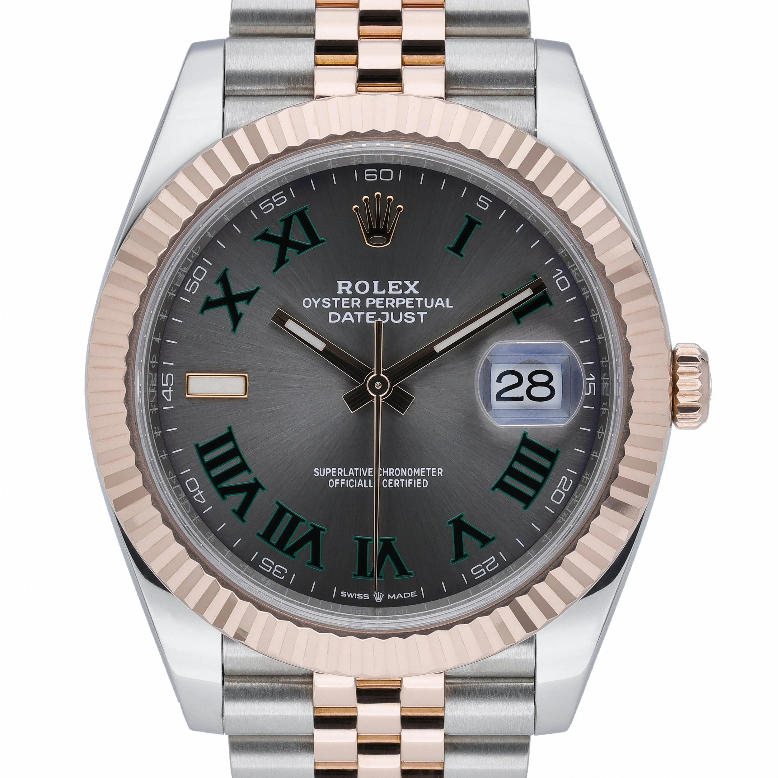 Rolex Datejust 41 “Wimbledon” (Ref. 126331). This 2021 gents timepiece is presented in excellent condition and comes complete with its original box and papers. The 41mm steel and rose gold case features a signature fluted bezel and a slate Roman dial protected by sapphire crystal. An elegant two‑tone Jubilee bracelet with Oysterclasp complements the design, while the automatic movement and 100M water resistance ensure everyday reliability. Supplied with a 2 Year Warranty, a 14 Day Return Policy, and Prompt Delivery. BQ Ref: 52571.
