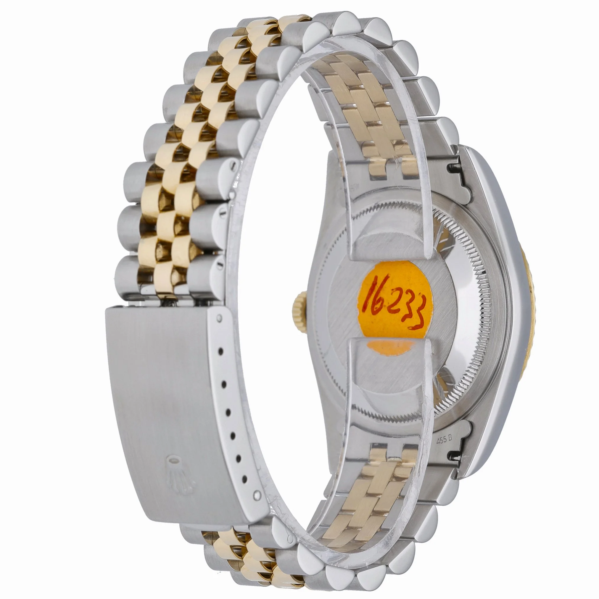 Rolex Datejust 36, ref. 16233 (BQ Ref 52301), a timeless two-tone classic from 1997 in excellent condition. The 36mm steel and yellow gold case showcases a signature fluted bezel and scratch‑resistant sapphire crystal, framing a cream dial with Arabic numerals and tasteful diamond accents. Powered by a reliable automatic movement, it is complemented by the iconic steel and yellow gold Jubilee bracelet with a secure folding clasp. Water resistant to 10 ATM, this gents’ Datejust is offered with its Rolex box, original papers, and green tag, and includes our 2-year warranty. Enjoy next day delivery and a 14-day return policy for complete peace of mind.