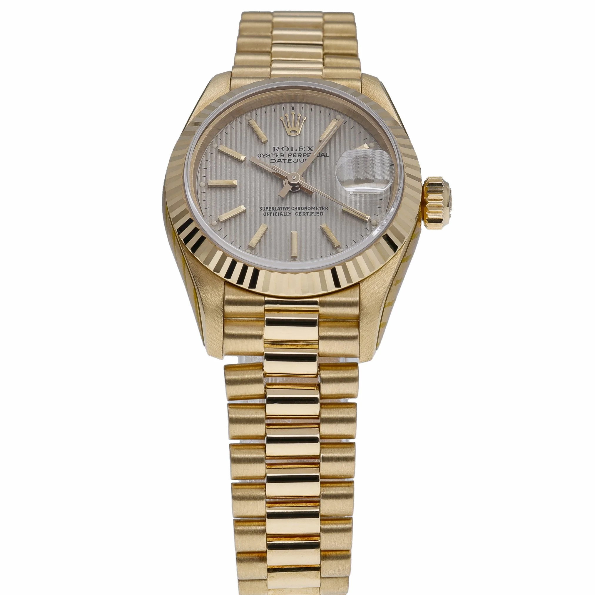Discover the elegance of the Rolex Datejust 69178, a 26mm ladies’ timepiece crafted in solid 18ct yellow gold. Its classic fluted bezel frames a Champagne Tapestry dial protected by scratch-resistant sapphire crystal, while the automatic movement delivers dependable precision. The iconic President bracelet in matching 18ct yellow gold features a concealed clasp for a seamless, refined look. Water resistant to 100M, this 1996 example is presented in excellent condition and comes complete with Rolex box and original papers. Backed by our 2 Year Warranty, plus a 14 Day Return Policy and Prompt Delivery for your convenience. BQ Ref: 52498.