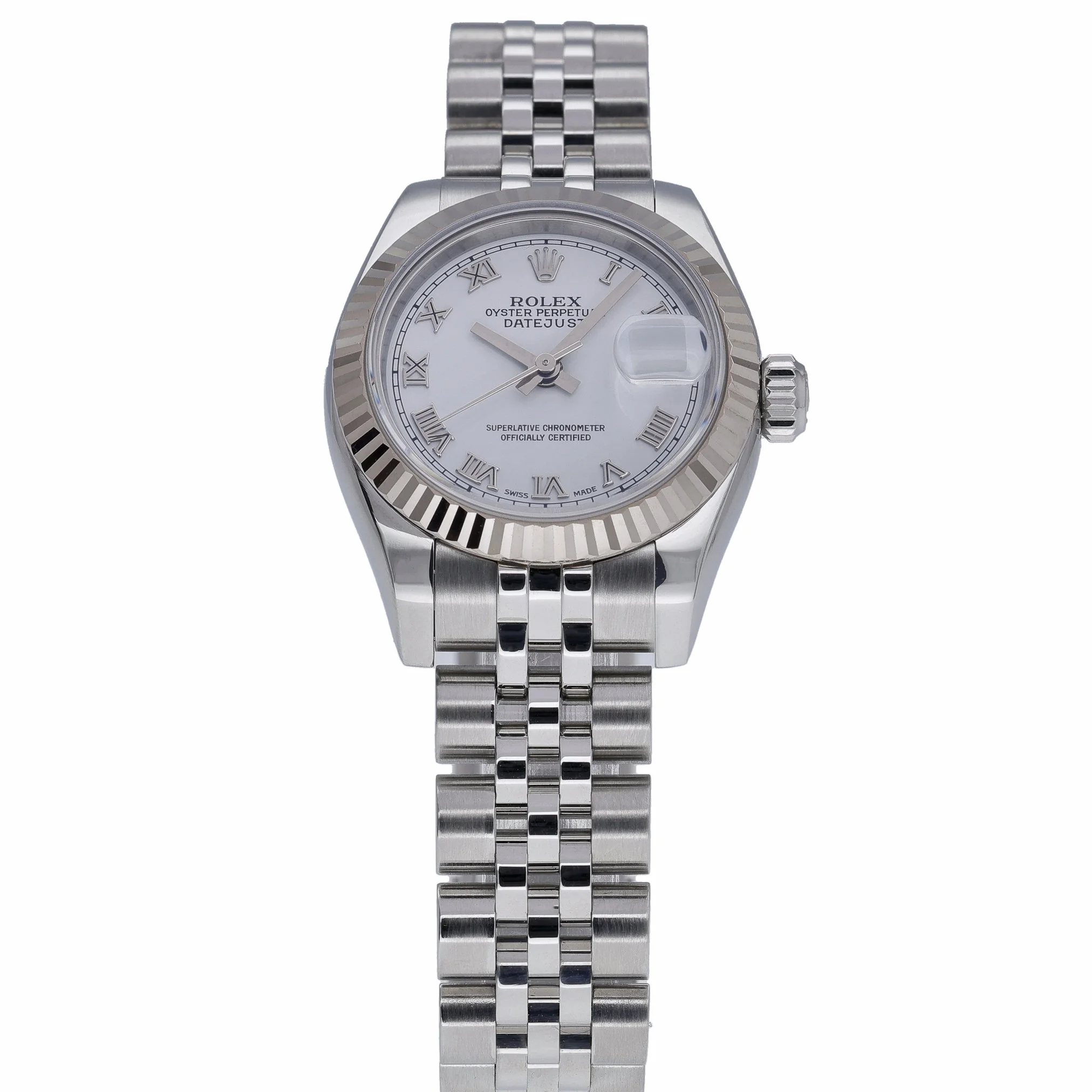 Refined and timeless, this ladies’ Rolex Datejust (179174) pairs a 26mm steel and white gold case with a signature fluted bezel and a white Roman dial protected by sapphire crystal. Powered by an automatic movement and secured by a Jubilee bracelet in Oystersteel with a concealed clasp, it offers dependable performance and everyday elegance. Produced in 2005 and presented in excellent condition, this example comes complete with its box, original papers, and green tag. Water resistant to 100M, it’s equally at home in formal and daily settings. BQ Ref 52352. Supplied with a 2 Year Warranty, Prompt Delivery, and our 14 Day Return Policy. Please note: this watch features aftermarket alterations.