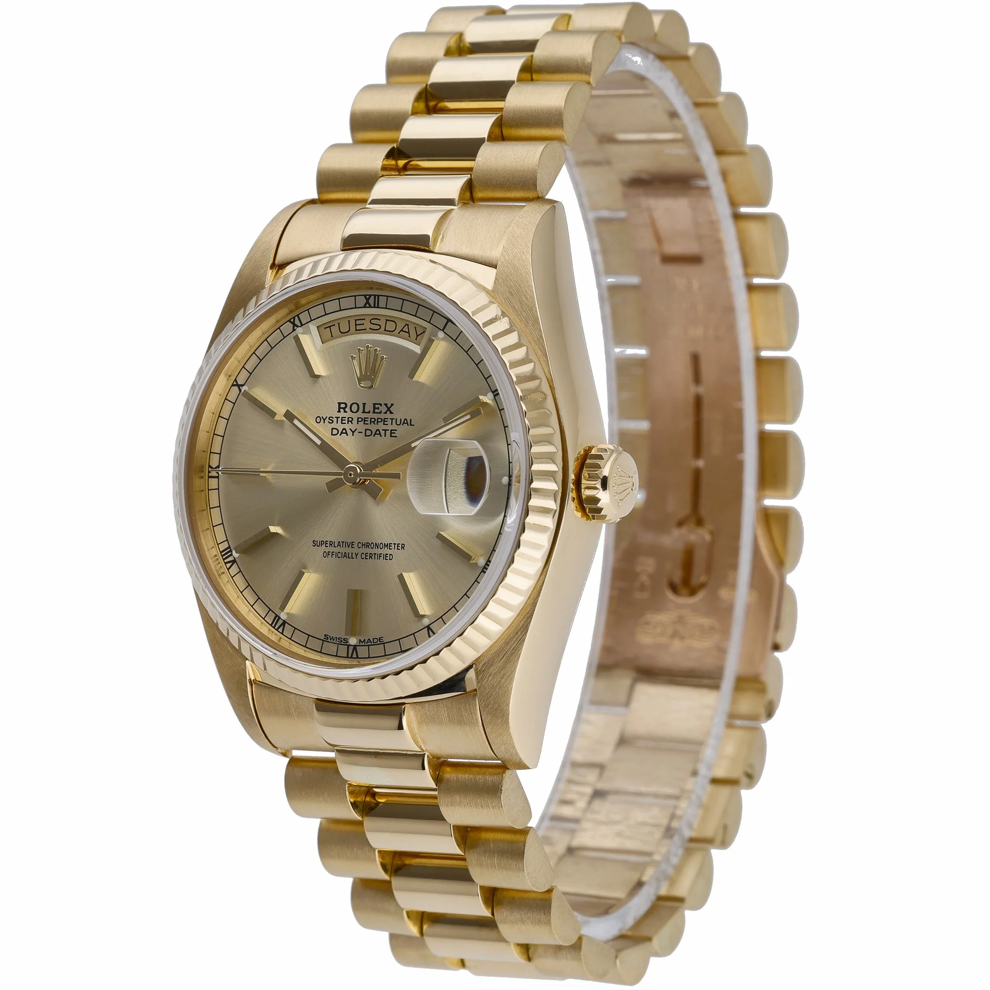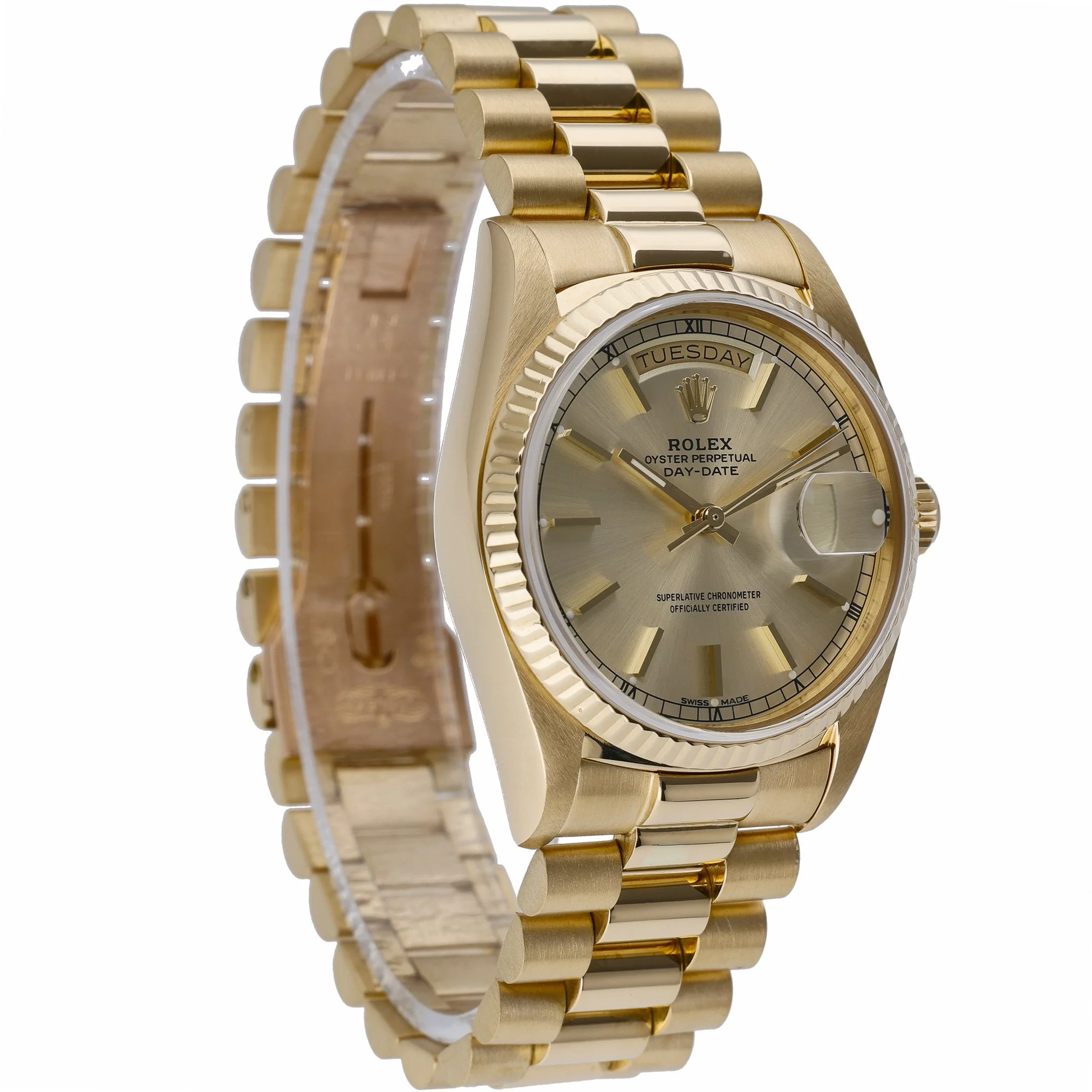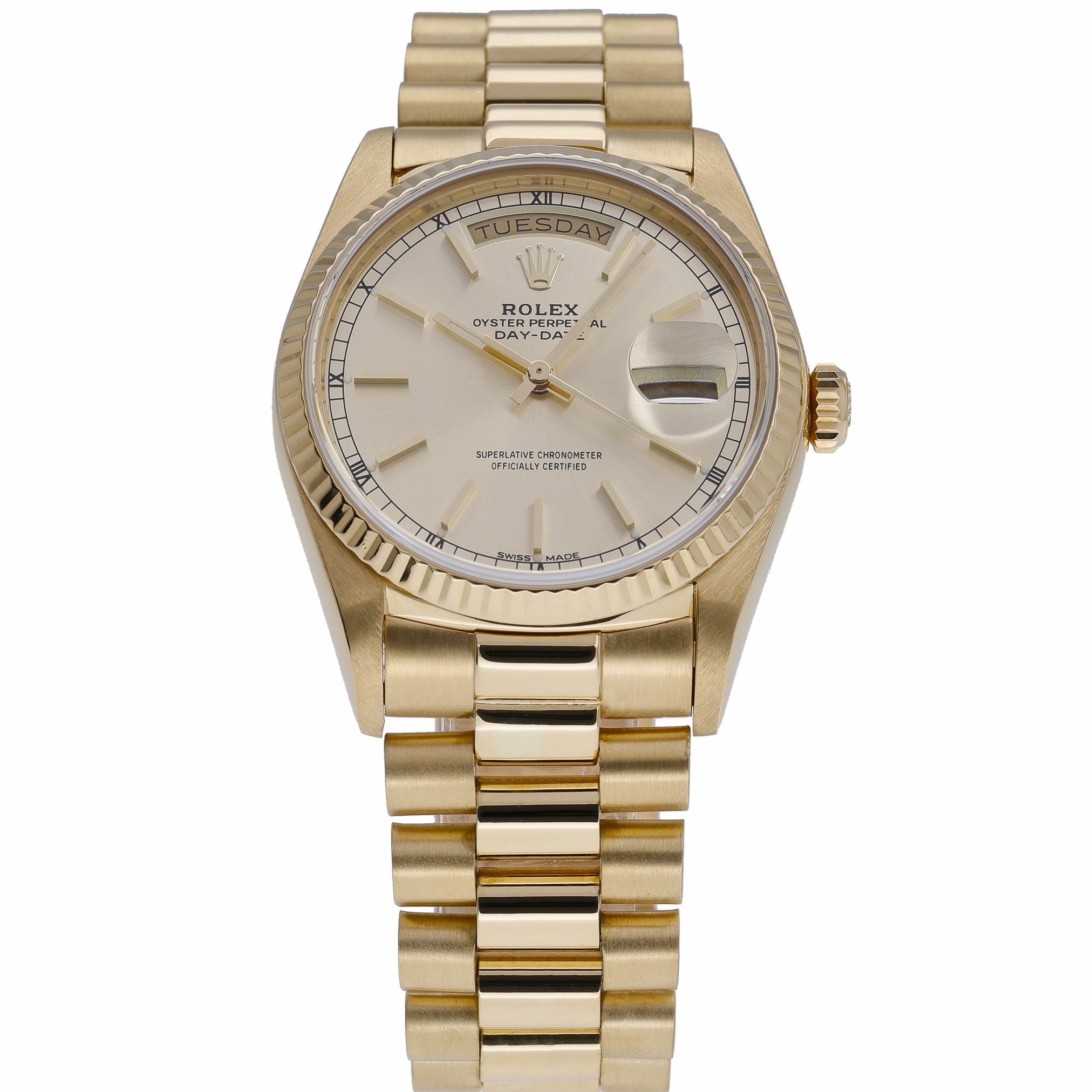 Rolex Day-Date 18038 (BQ Ref 51962) in 18ct yellow gold, featuring the iconic 36mm Oyster case and President bracelet with a concealed clasp. A diamond-set bezel frames the champagne baton dial beneath sapphire crystal, while the automatic movement delivers reliable, refined performance. Produced in 1984 and presented in good condition, this gentleman’s classic combines unmistakable Day-Date prestige with everyday versatility and 100M water resistance. Supplied with Rolex box and green tag, it includes a 2 Year Warranty for peace of mind, plus a 14 Day Return Policy and Prompt Delivery for a seamless purchase experience.