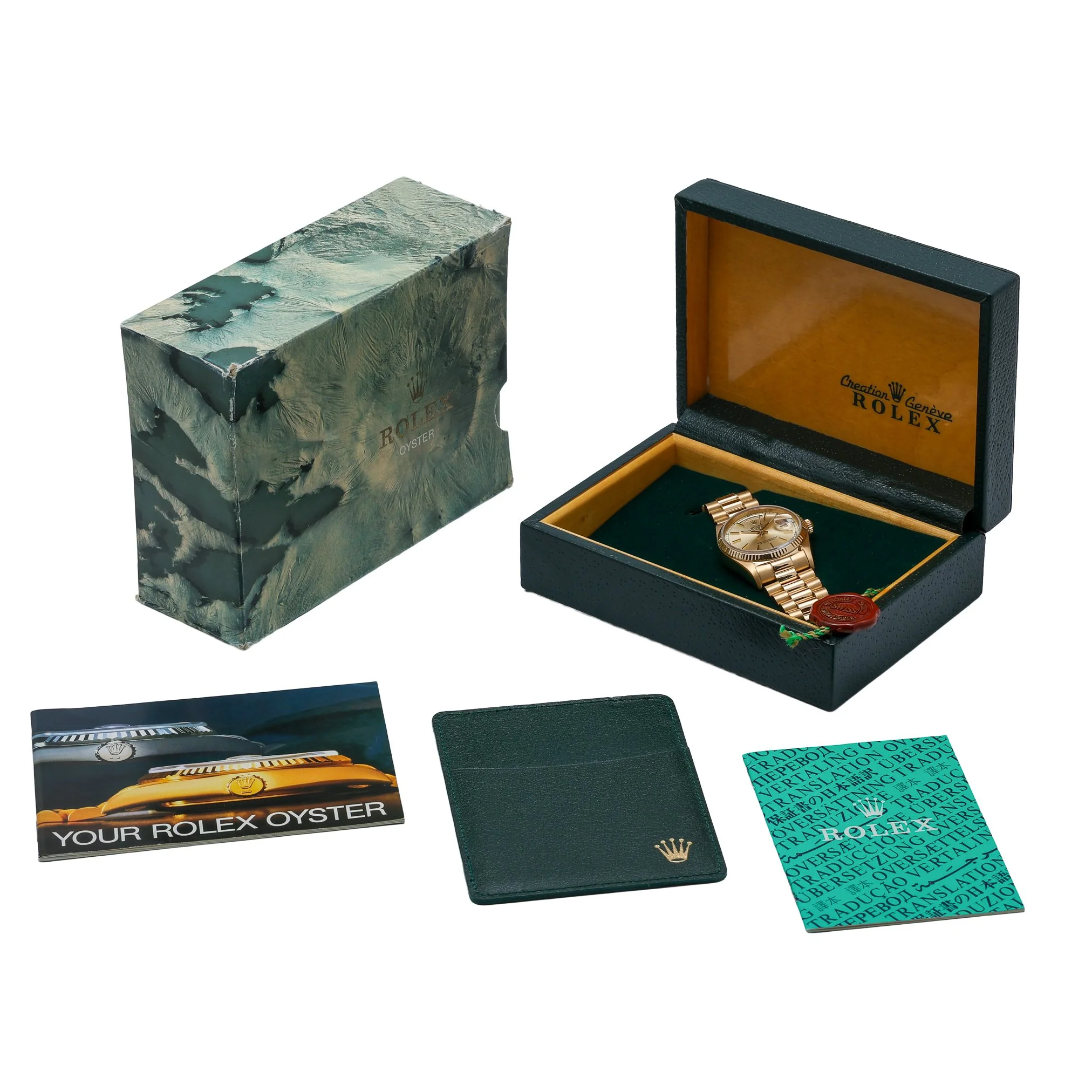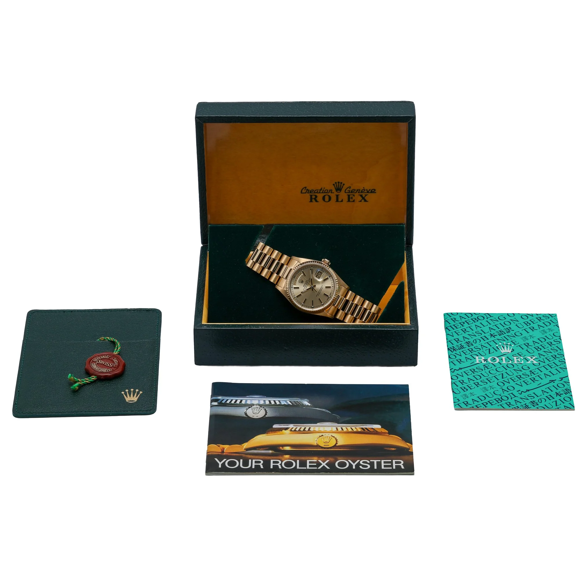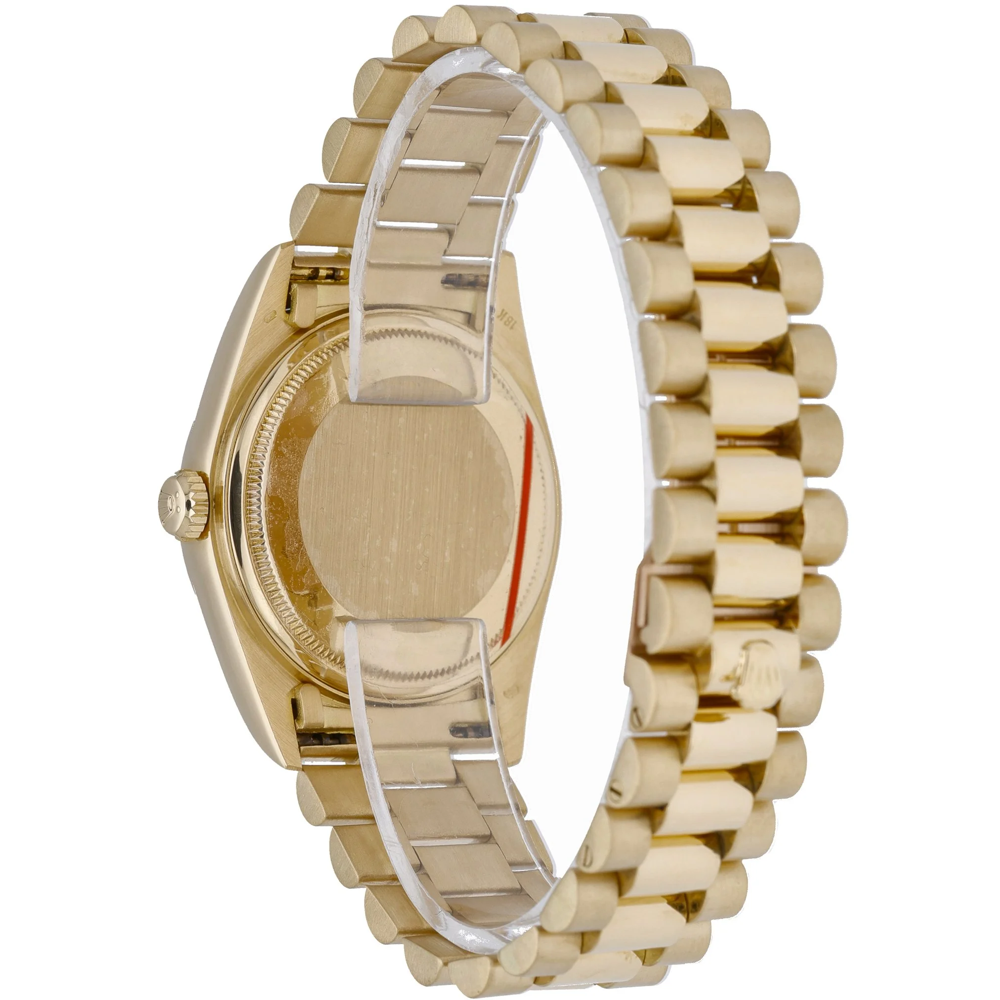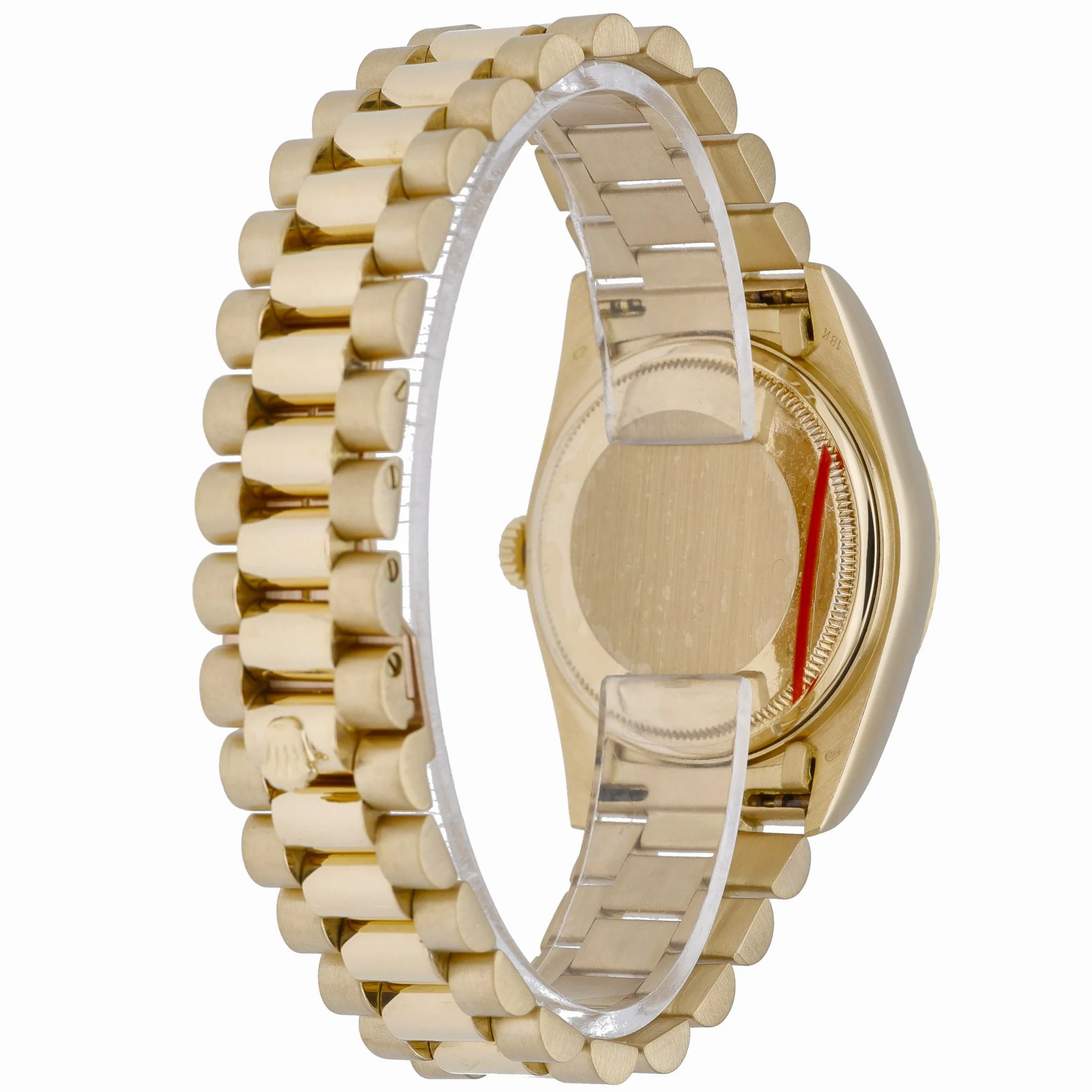 Rolex Day-Date 18038 (BQ Ref 51962) in 18ct yellow gold, featuring the iconic 36mm Oyster case and President bracelet with a concealed clasp. A diamond-set bezel frames the champagne baton dial beneath sapphire crystal, while the automatic movement delivers reliable, refined performance. Produced in 1984 and presented in good condition, this gentleman’s classic combines unmistakable Day-Date prestige with everyday versatility and 100M water resistance. Supplied with Rolex box and green tag, it includes a 2 Year Warranty for peace of mind, plus a 14 Day Return Policy and Prompt Delivery for a seamless purchase experience.