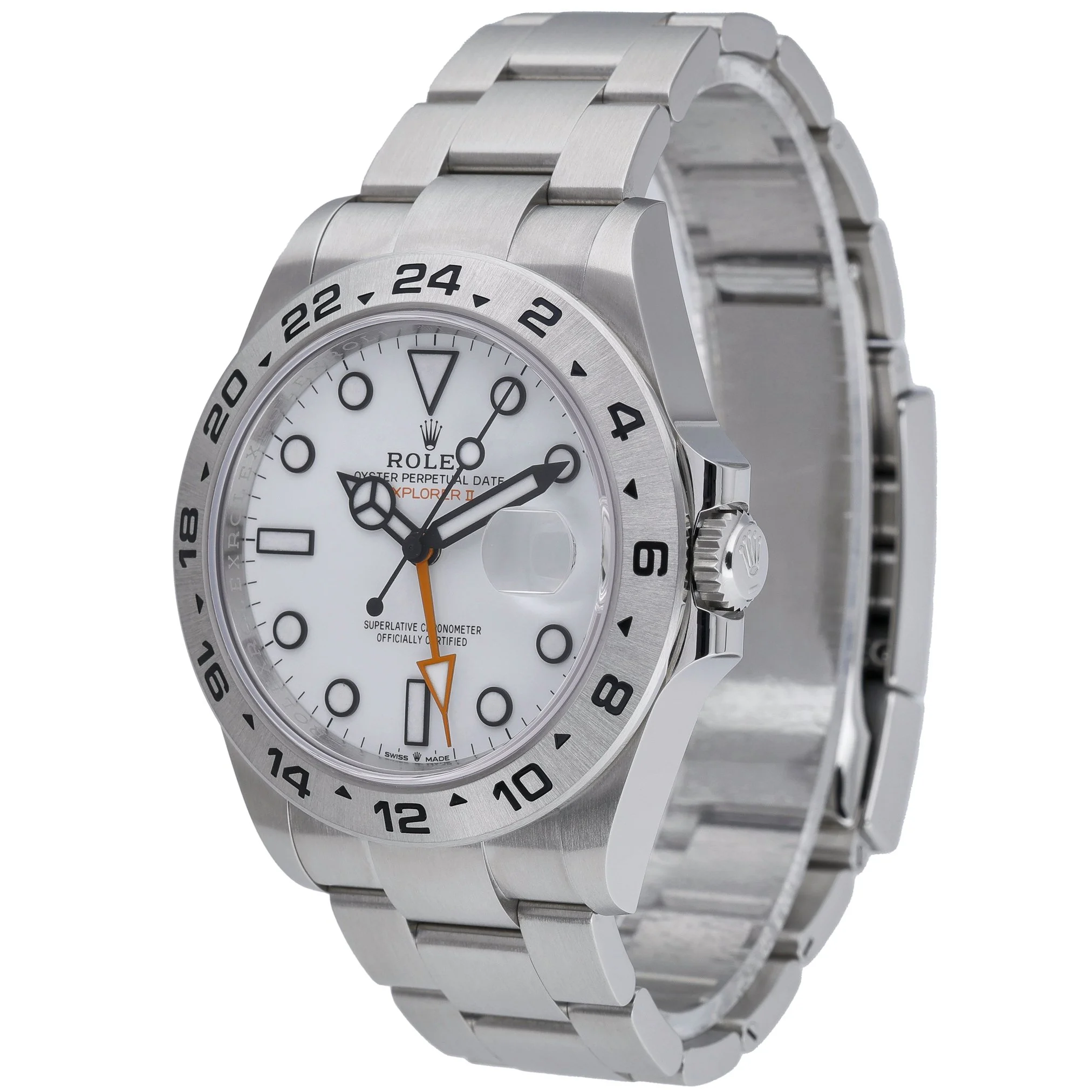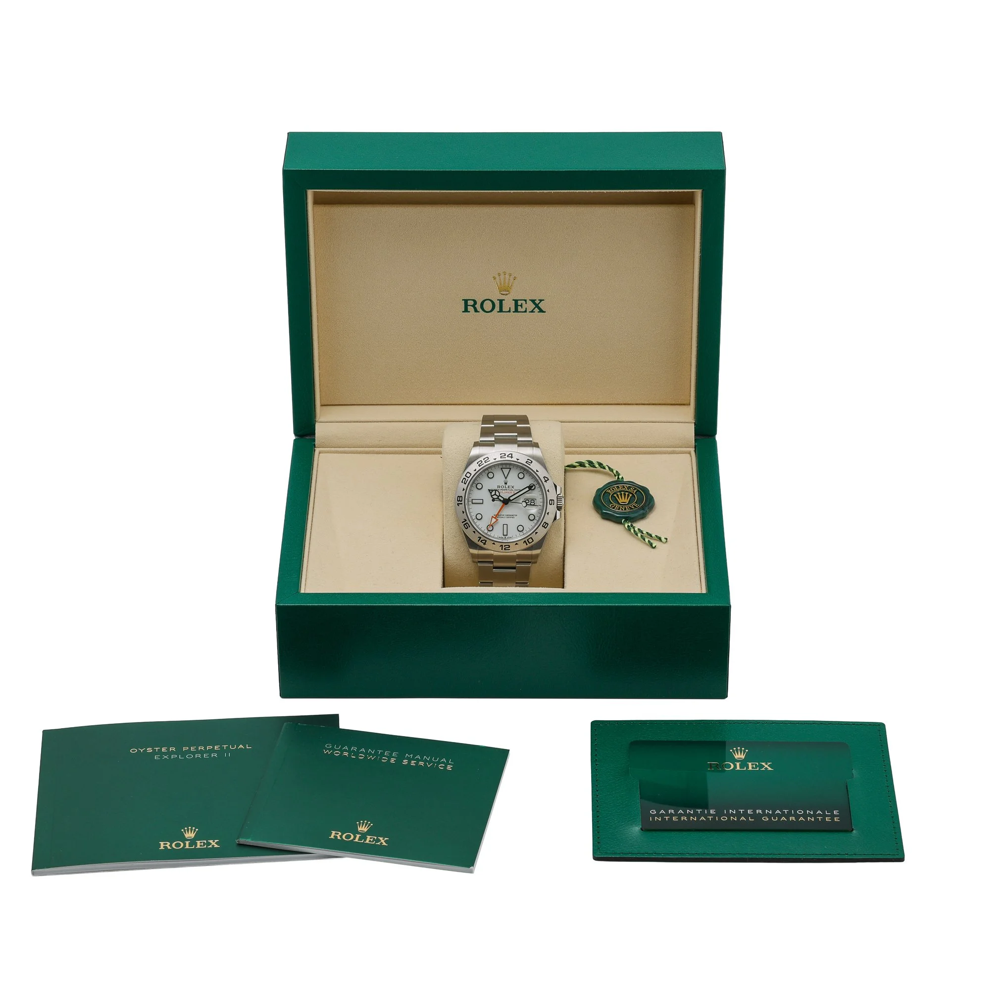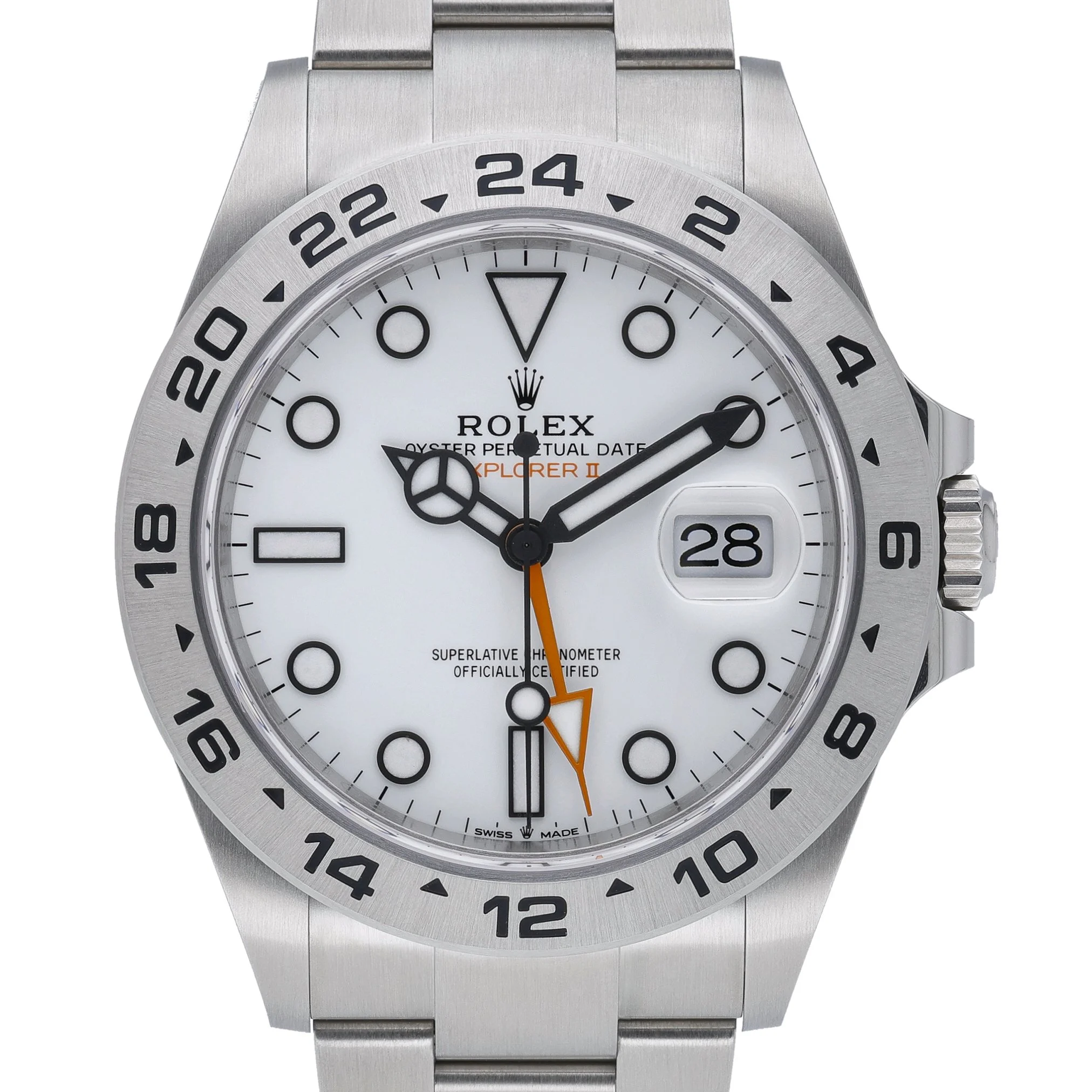 Discover the Rolex Explorer II, reference 226570, a 42mm tool watch in resilient Oystersteel with a crisp white dial and a fixed 24-hour graduated bezel for assured legibility around the clock. This New/Unworn 2026 example features an automatic movement, scratch-resistant sapphire crystal, and 100m water resistance, paired with the robust Oyster bracelet and secure Oysterlock clasp. Supplied as a complete set with Rolex box, original papers, and white tag (BQ Ref 53205). Enjoy peace of mind with a 5-year manufacturer’s warranty from the 2026 date of manufacture, alongside our 14 Day Return Policy. In stock for Prompt Delivery.