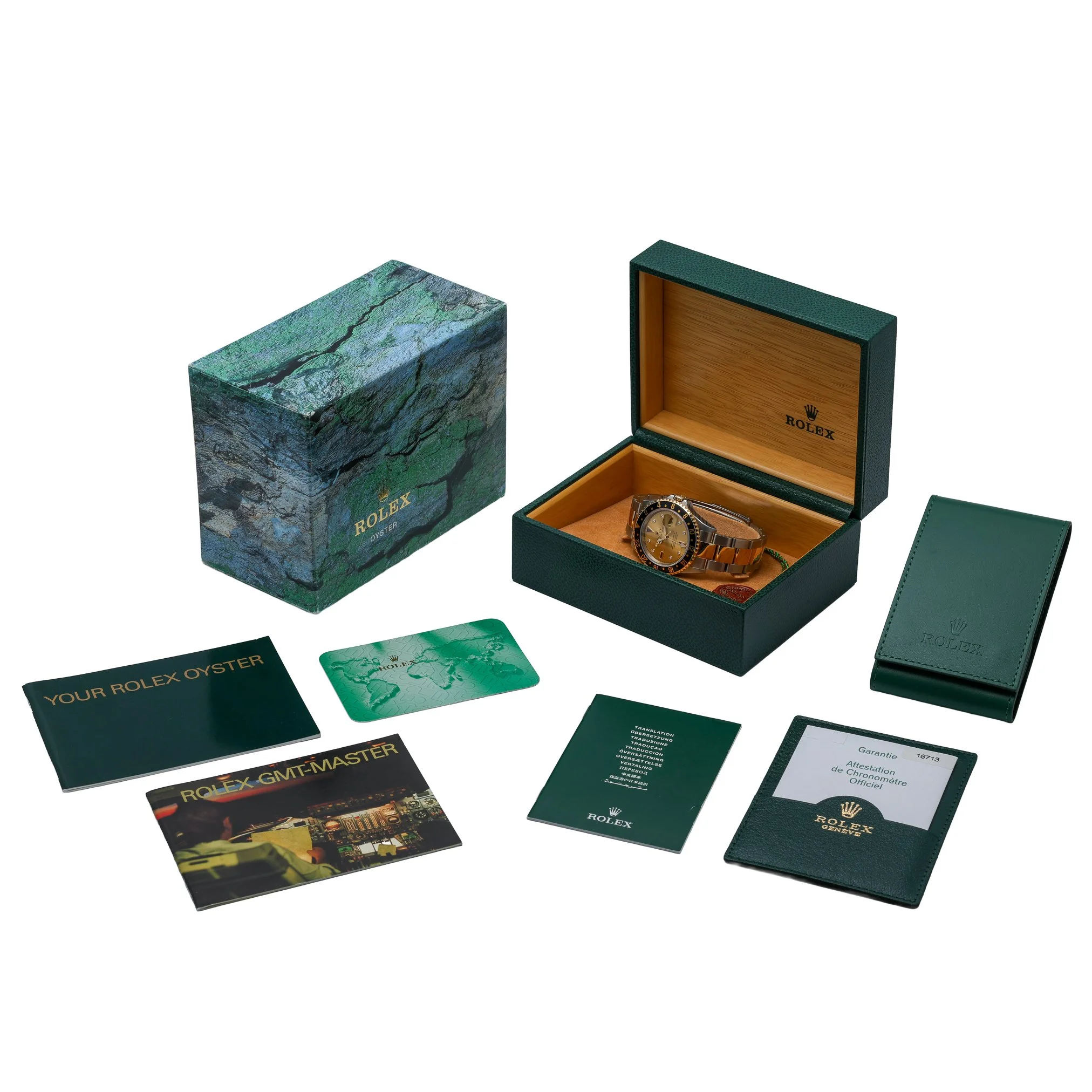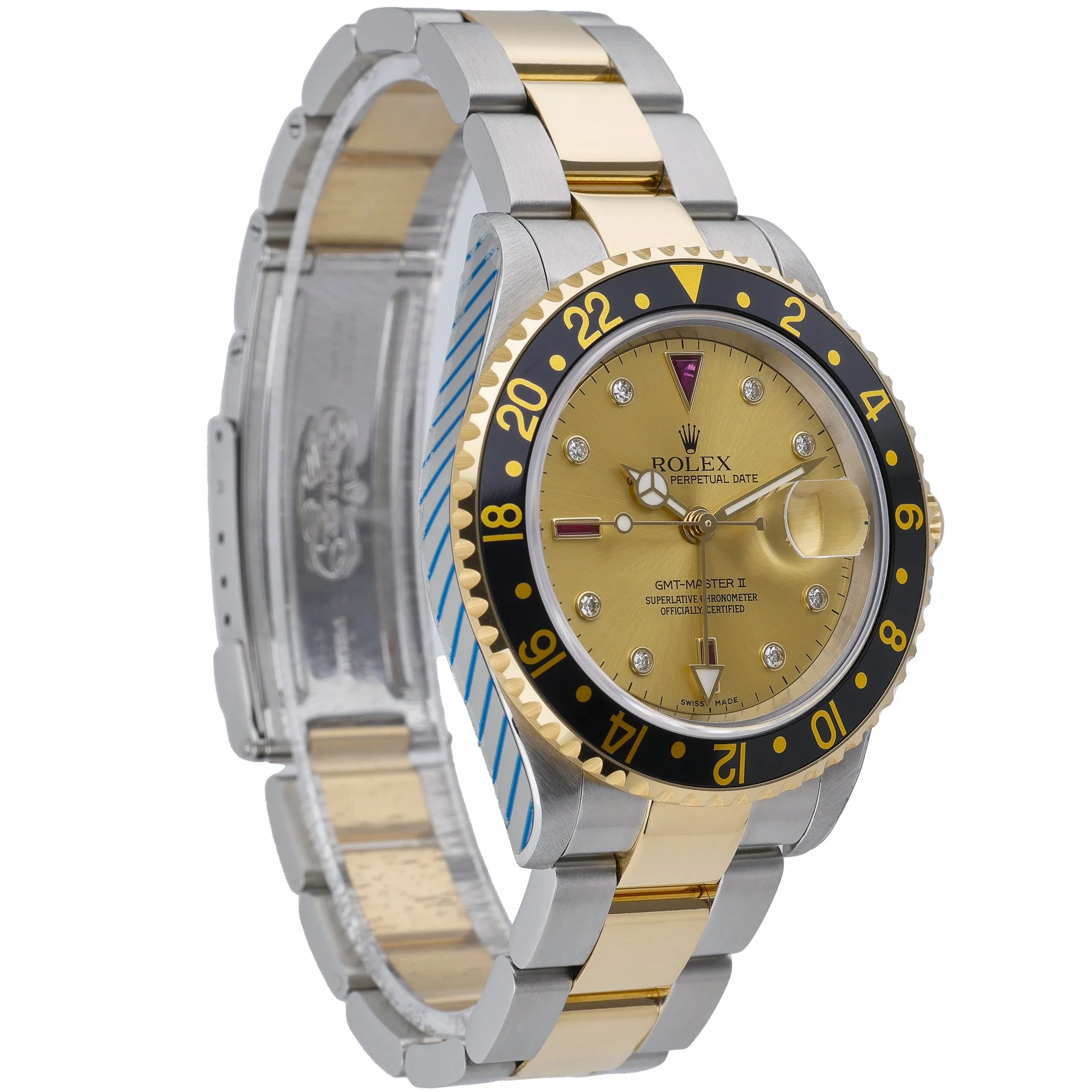 Rolex GMT-Master II ref. 16713 (2002) in steel and yellow gold, featuring a 40mm case with a bidirectional rotatable bezel and a champagne Serti dial set with diamonds. Powered by an automatic movement, this iconic traveler’s watch tracks a second time zone and is protected by a sapphire crystal. Presented on the two-tone Oyster bracelet with Oysterclasp and water resistant to 100m. In excellent condition, it is supplied with its original box and papers and backed by our 2 Year Warranty. BQ Ref 52489. Prompt Delivery and 14 Day Return Policy for complete peace of mind.