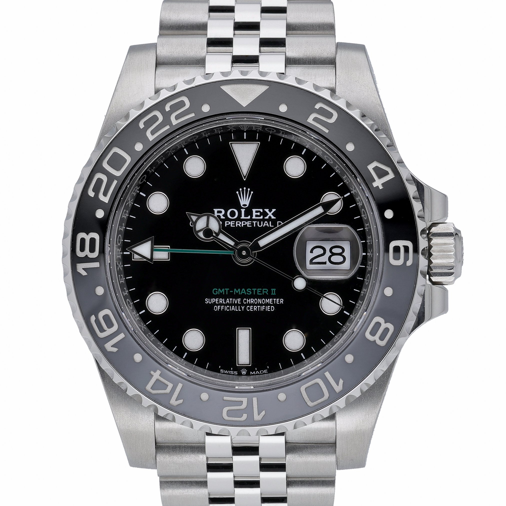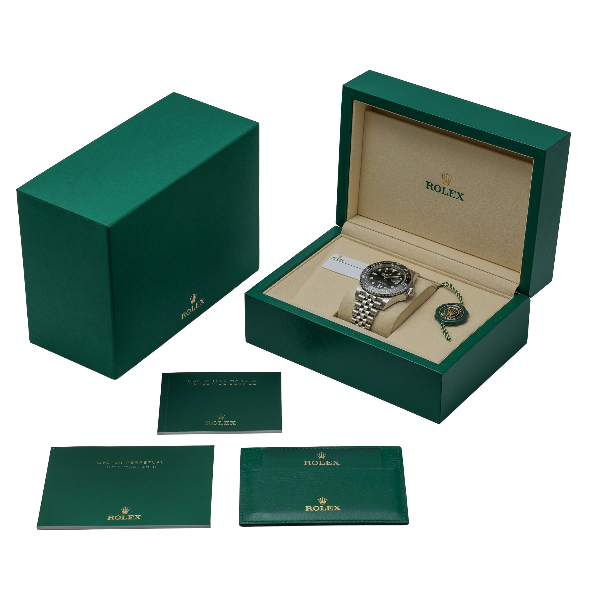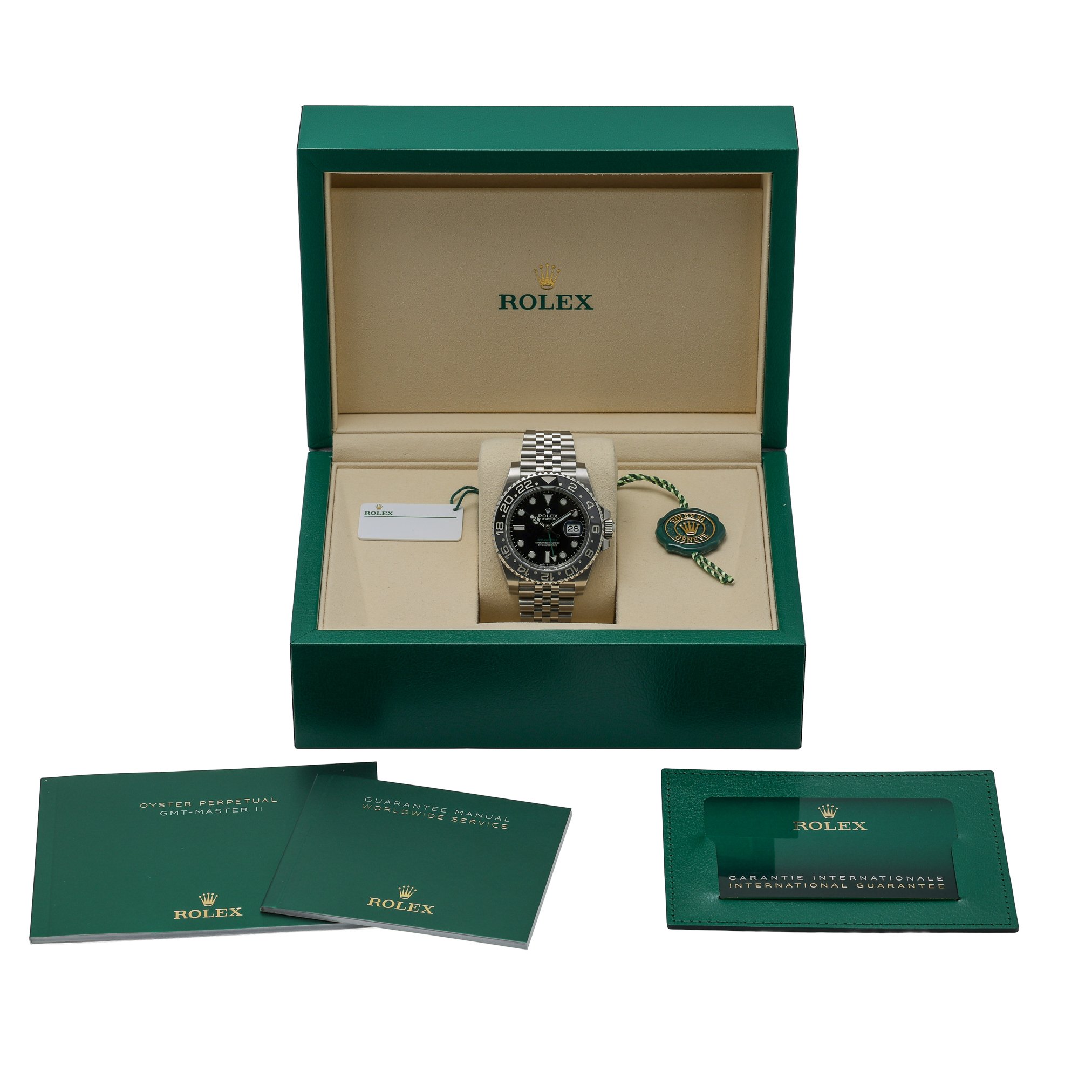 Discover the Rolex GMT-Master II “Bruce Wayne” (Ref. 126710GRNR), a 2026 new/unworn gents’ model pairing professional utility with iconic style. Its 40mm Oystersteel case is topped with a sapphire crystal protecting a sleek black dial, while the bidirectional rotatable GMT bezel and automatic movement deliver seamless dual time-zone tracking. The robust Jubilee bracelet with Oysterlock clasp ensures secure, all-day comfort, and 100m water resistance readies it for travel and daily wear alike. Supplied with Rolex presentation box, original papers, and white tag. Covered by a 5-year manufacturer’s warranty from the 2026 date of manufacture. Model: 126710GRNR. BQ Ref: 53137. Prompt Delivery available and backed by our 14 Day Return Policy.
