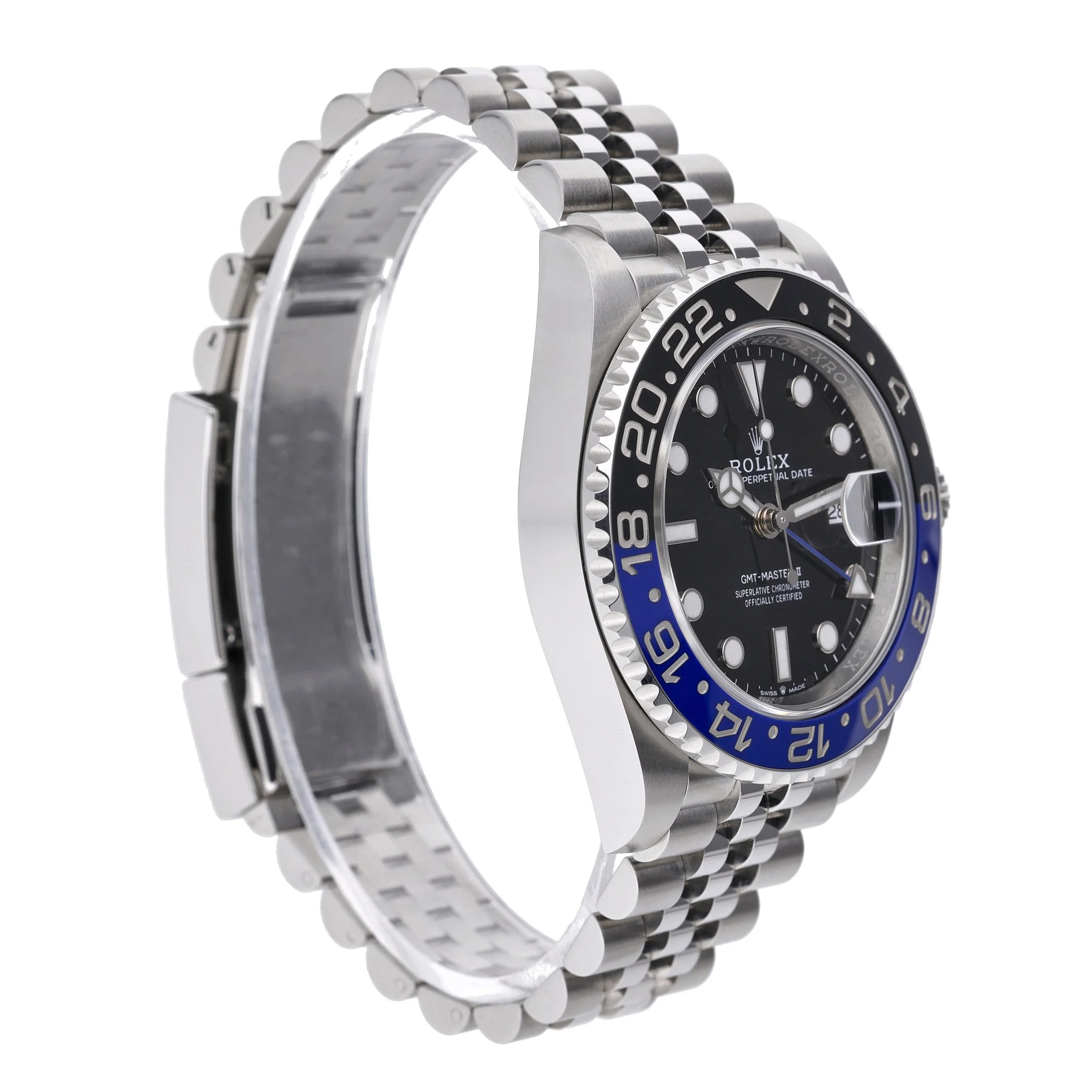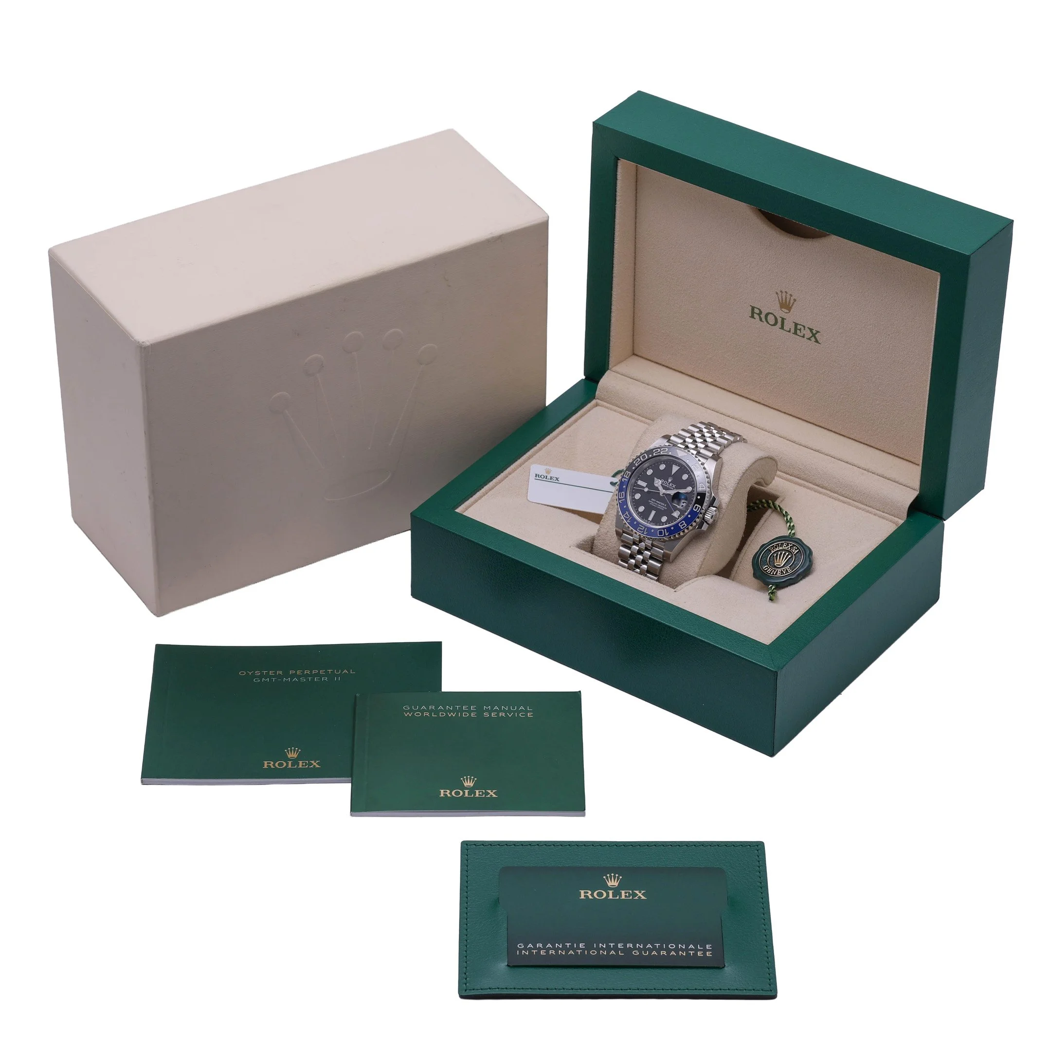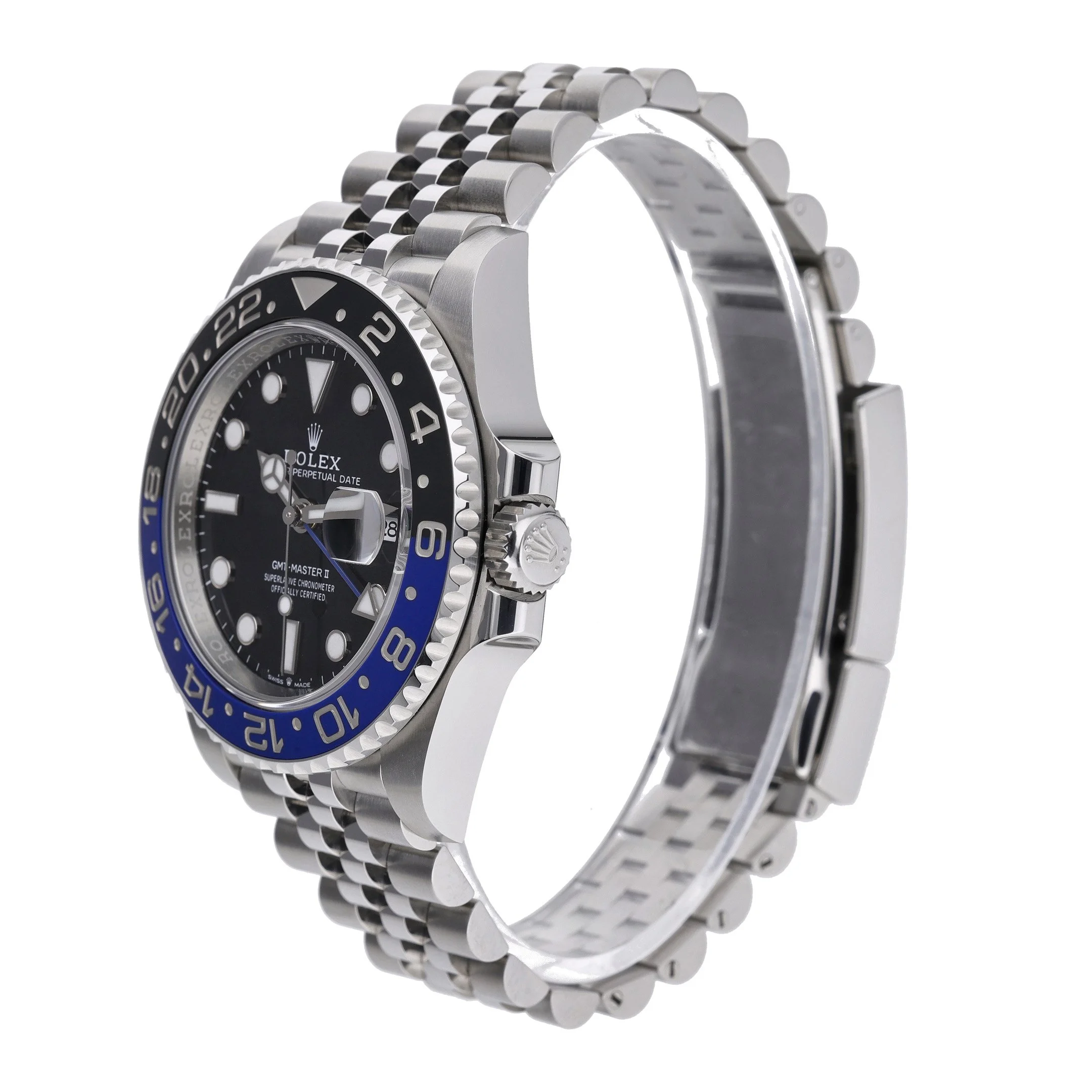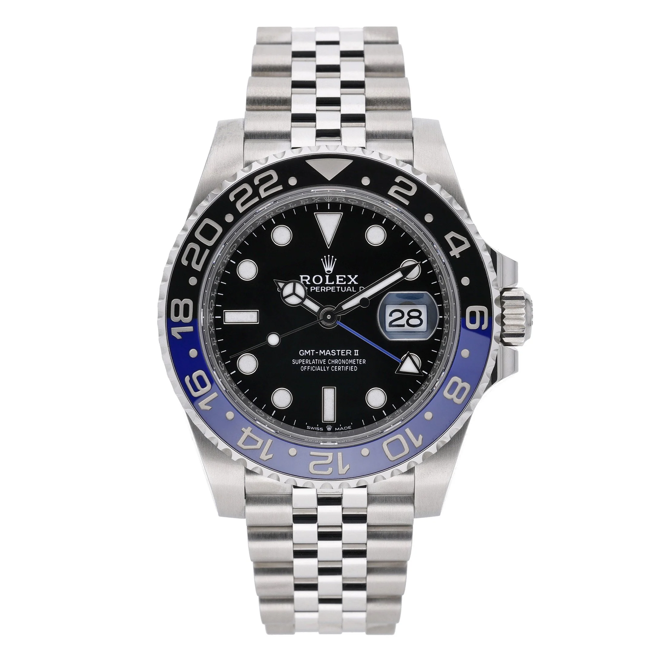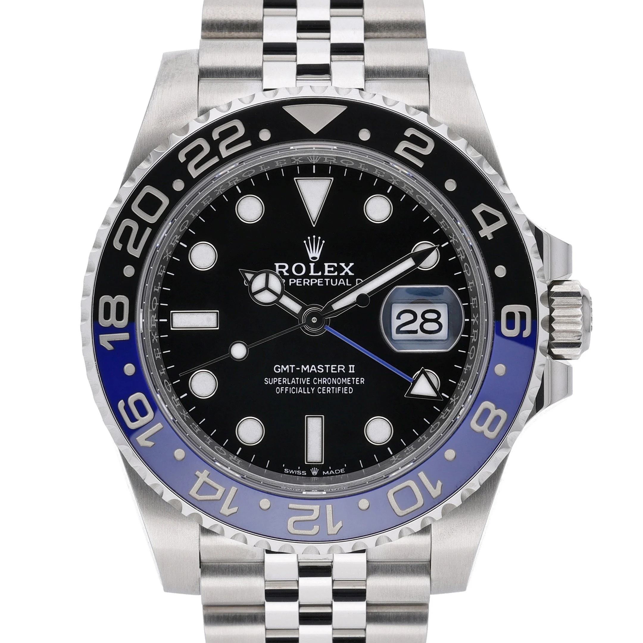 Rolex GMT-Master II 126710BLNR “Batgirl” in excellent condition, featuring a 40mm Oystersteel case and a black dial beneath scratch-resistant sapphire crystal. The bidirectional rotatable bezel showcases the model’s signature black-and-blue GMT scale, while the Jubilee bracelet in Oystersteel secures with an Oysterlock clasp. Powered by an automatic movement and water resistant to 100M, this 2024 piece balances everyday durability with refined travel-ready functionality. Supplied complete with Rolex box, original papers, and white tag. Covered by a 5-year manufacturer’s warranty running from the 2024 date of manufacture. BQ Ref: 53144. Prompt Delivery and a 14 Day Return Policy for peace of mind.