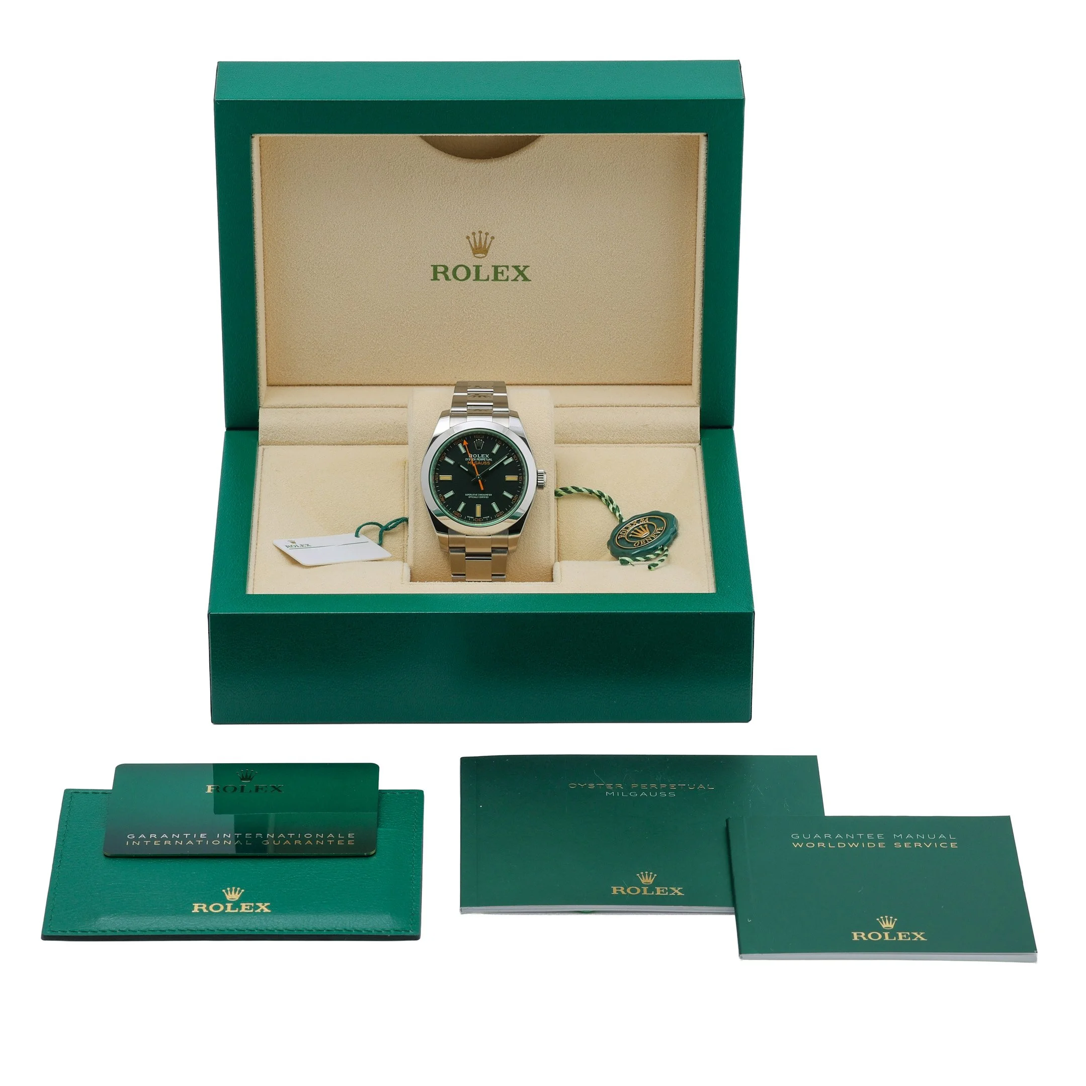 Discover the Rolex Milgauss 116400GV (BQ Ref 52509), a 40mm Oystersteel timepiece in excellent condition. It features a striking blue baton dial beneath sapphire crystal, a domed bezel, and the robust Oyster bracelet with Oysterclasp. Powered by an automatic movement and water resistant to 100M, this 2022 example delivers reliable performance with timeless Rolex craftsmanship. Supplied complete with original Rolex box, papers, and white tag, it is backed by our 2 Year Warranty. Enjoy the reassurance of our 14 Day Return Policy and the convenience of Prompt Delivery.
