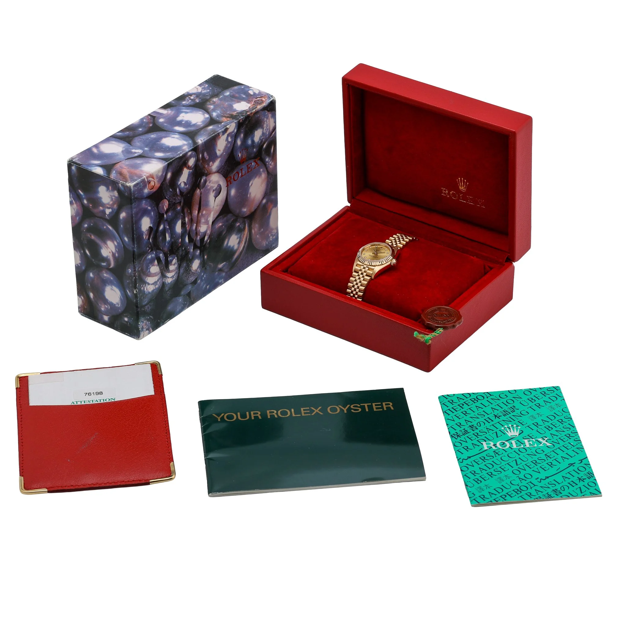 Elevate your collection with this ladies’ Rolex Oyster Perpetual (Model 76198), presented in excellent condition and crafted entirely from 18ct yellow gold. The 24mm case with fluted bezel and scratch-resistant sapphire crystal frames a luxurious champagne dial set with diamond hour markers, while the automatic movement ensures reliable, effortless timekeeping. A matching 18ct yellow gold Jubilee bracelet with Oysterclasp delivers enduring comfort and classic Rolex refinement. Water resistant to 100M, this 2001 example blends everyday versatility with timeless elegance. Supplied with original box and papers, BQ Ref 52609, and covered by a 2-year warranty. Enjoy next day delivery and a 14-day return policy for complete peace of mind.