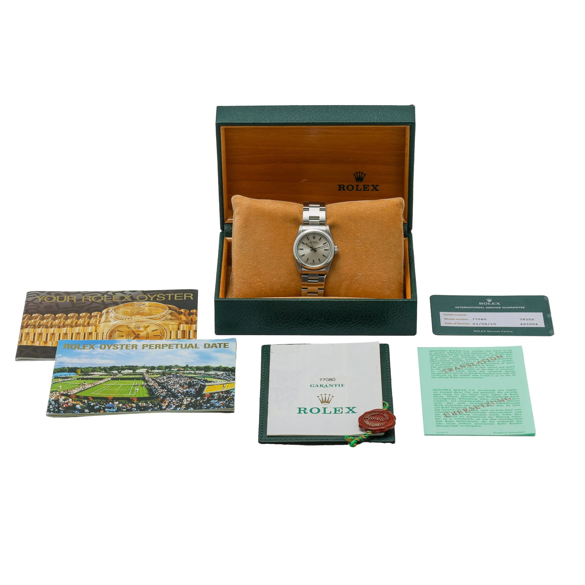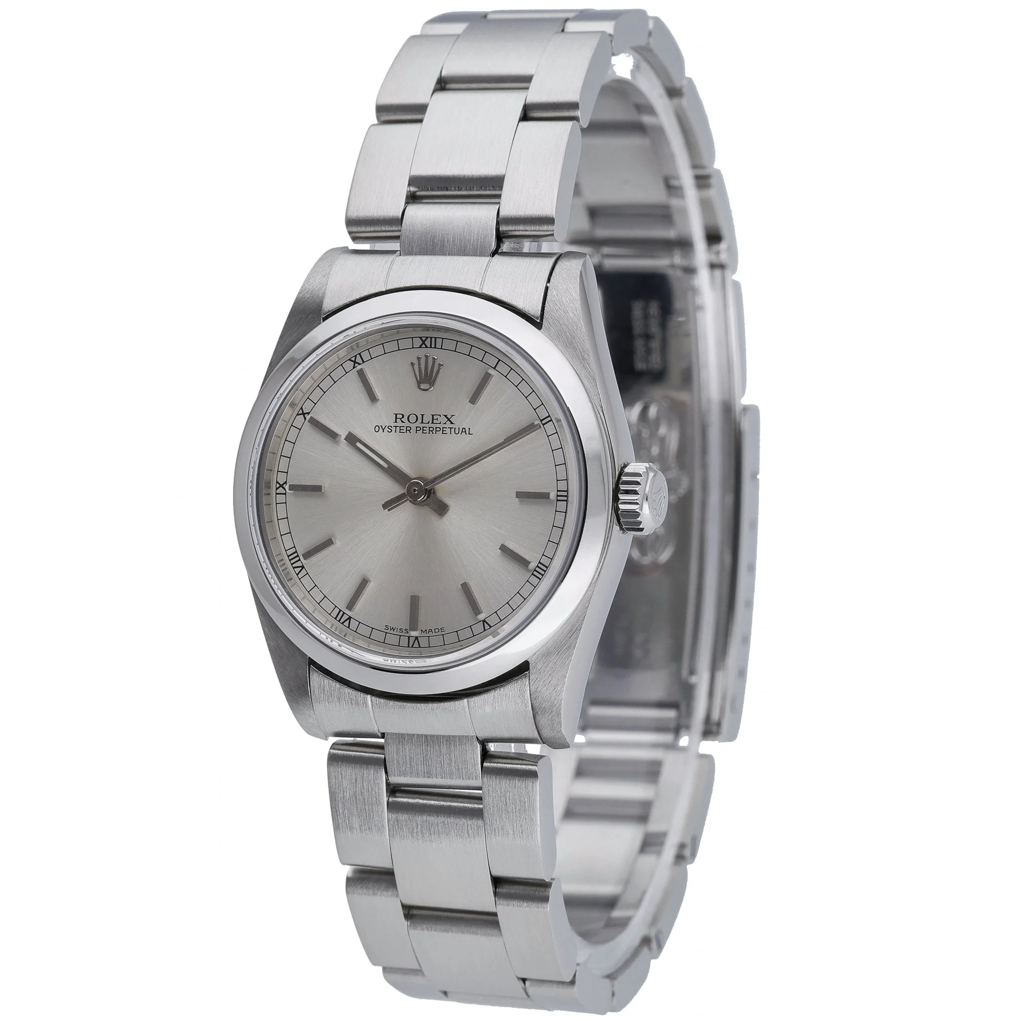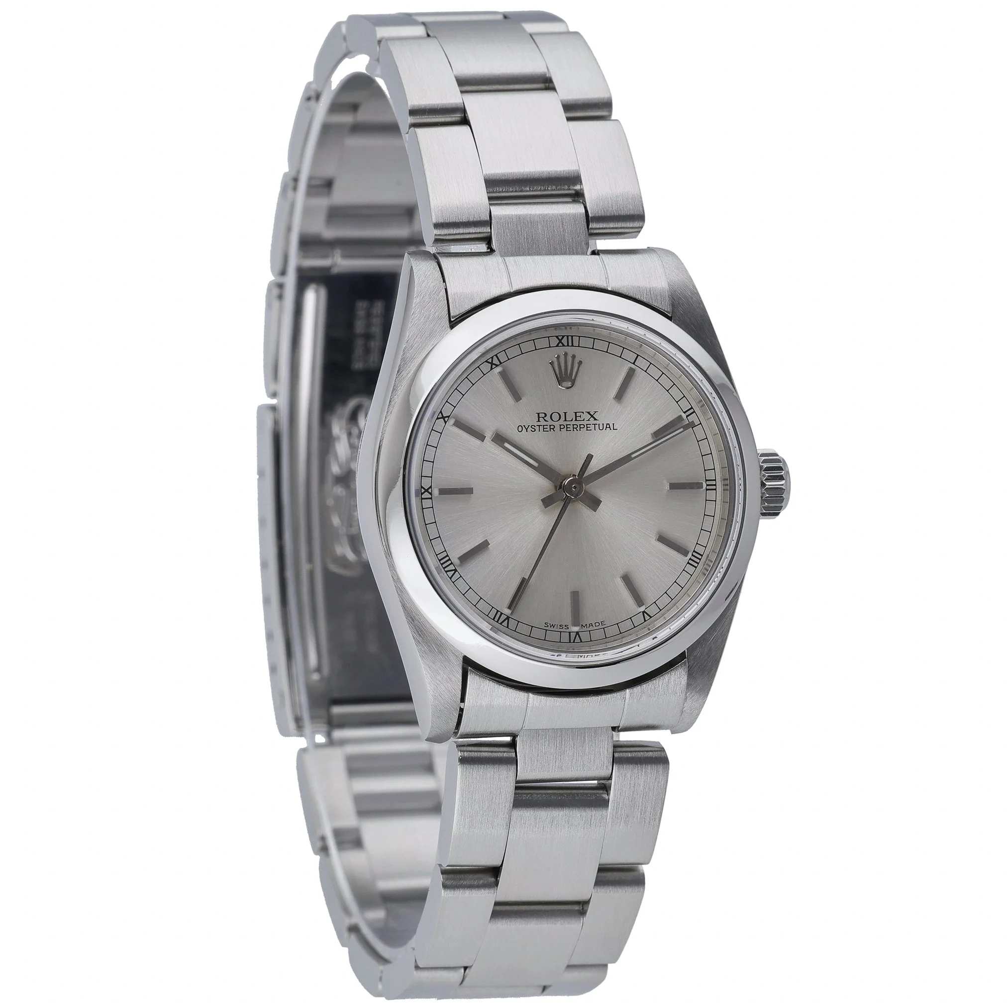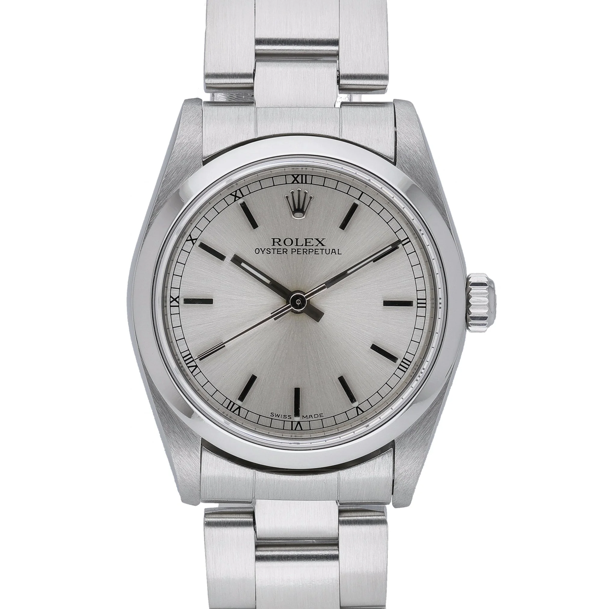The Rolex Oyster Perpetual (Ref. 77080) is a timeless 31mm midsize model crafted in robust Oystersteel with a domed bezel, silver baton dial, and scratch-resistant sapphire crystal. Powered by an automatic movement and water resistant to 100 metres, it balances everyday reliability with classic Rolex elegance. This 1998 example is in excellent condition and features the iconic Oyster bracelet with Oysterclasp for secure, comfortable wear. Supplied with its original box and papers, BQ Ref 51759 is an ideal choice for those seeking understated sophistication and enduring quality. Enjoy added peace of mind with our 2 Year Warranty, 14 Day Return Policy, and Prompt Delivery.