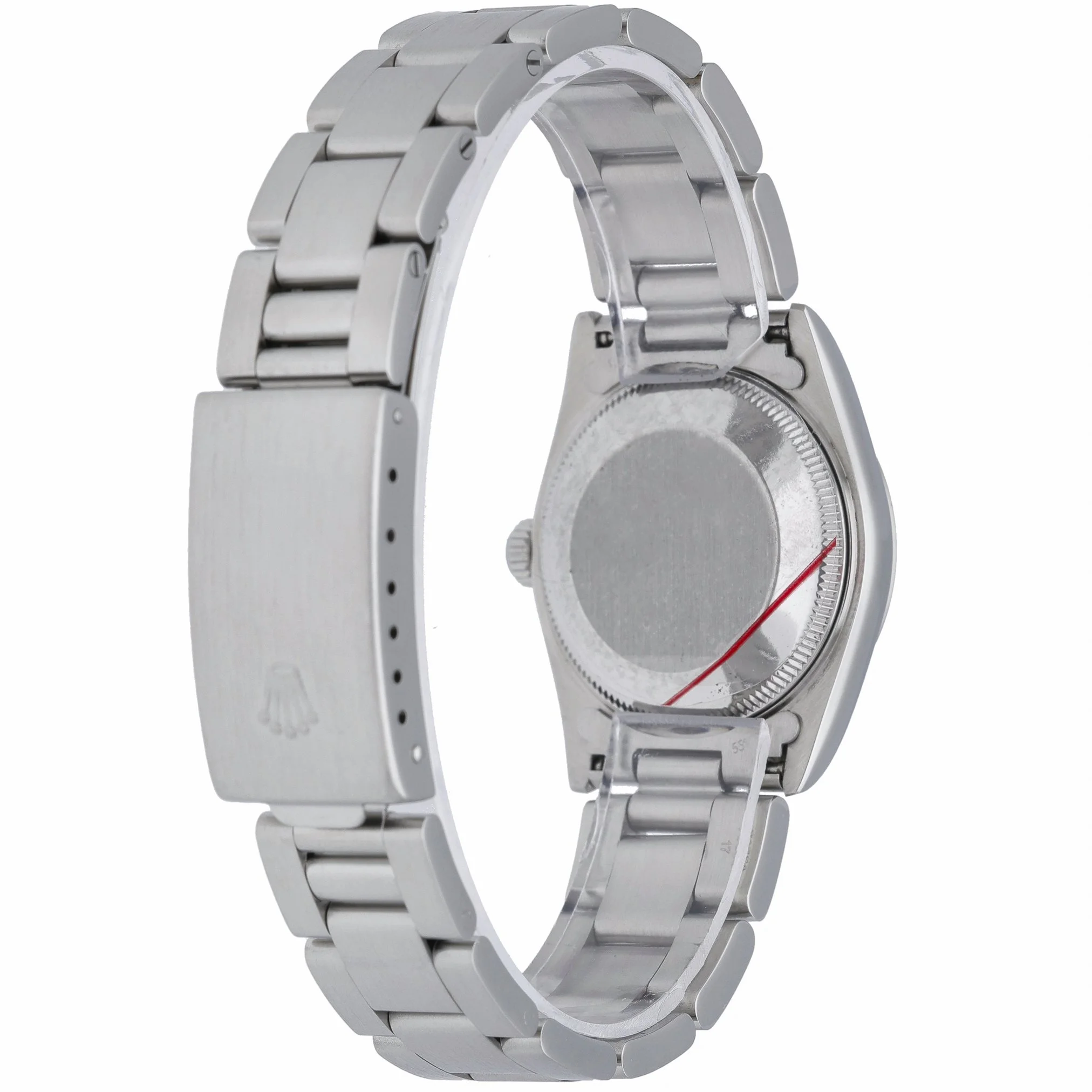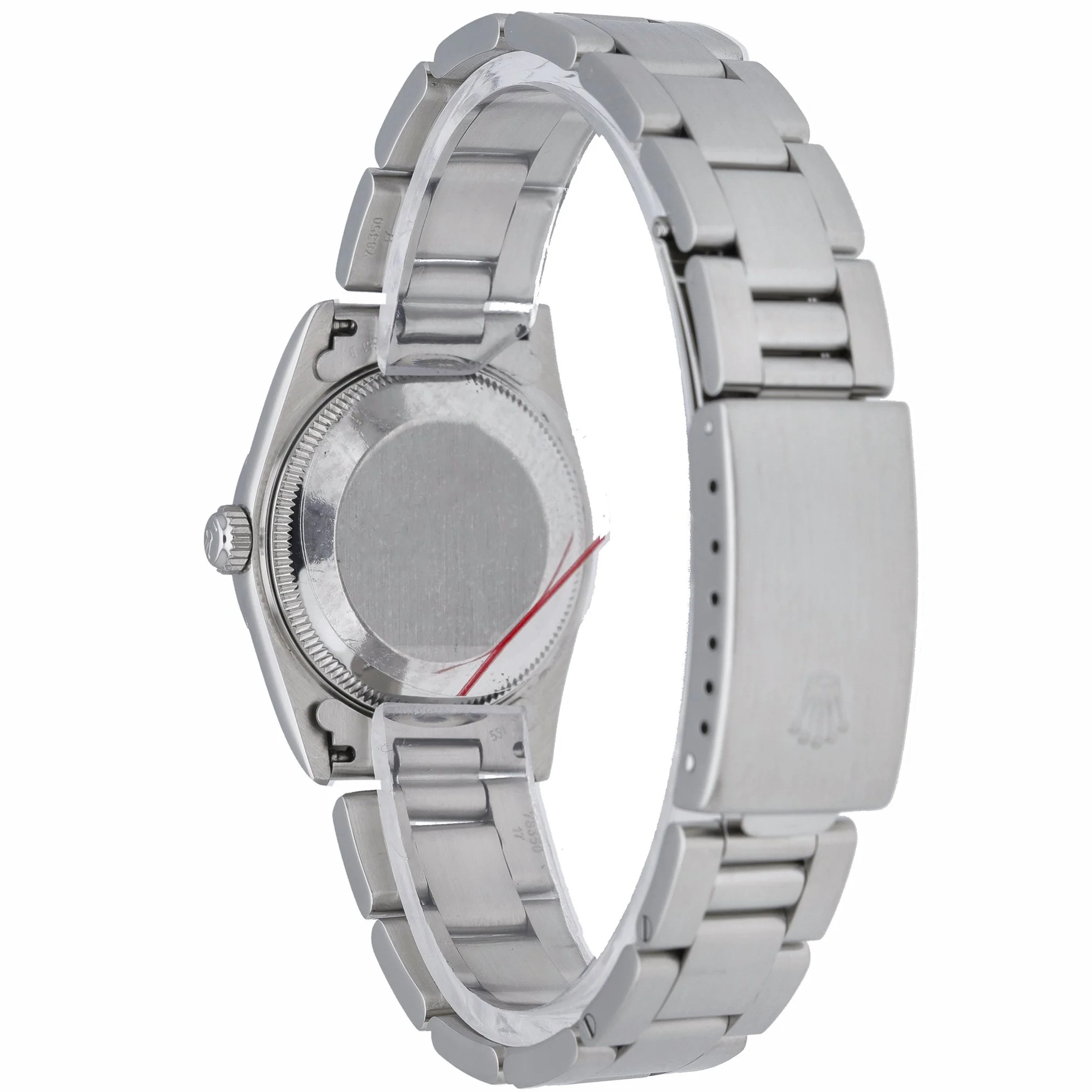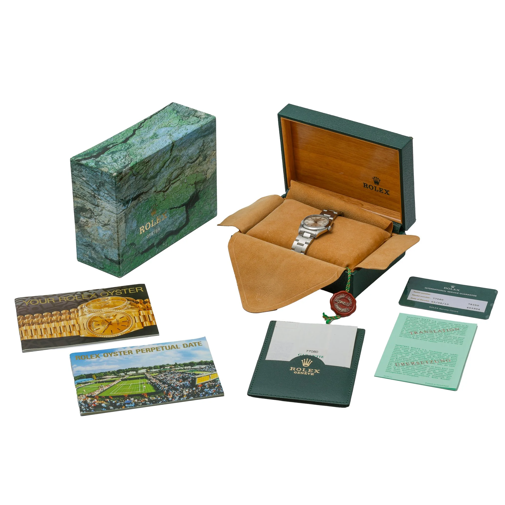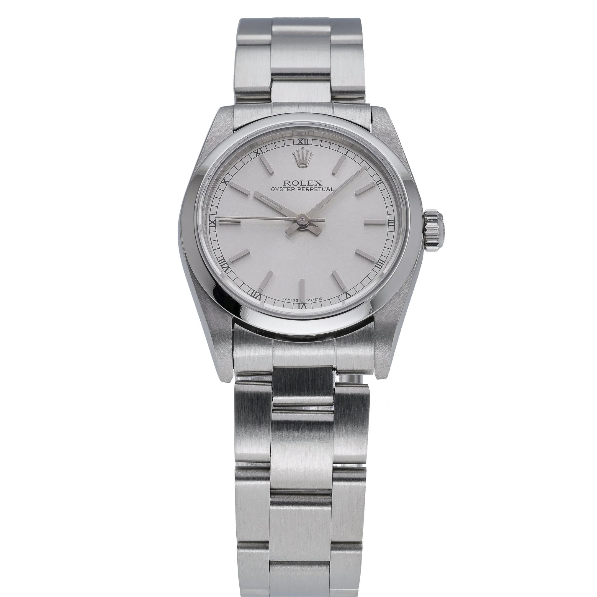 The Rolex Oyster Perpetual (Ref. 77080) is a timeless 31mm midsize model crafted in robust Oystersteel with a domed bezel, silver baton dial, and scratch-resistant sapphire crystal. Powered by an automatic movement and water resistant to 100 metres, it balances everyday reliability with classic Rolex elegance. This 1998 example is in excellent condition and features the iconic Oyster bracelet with Oysterclasp for secure, comfortable wear. Supplied with its original box and papers, BQ Ref 51759 is an ideal choice for those seeking understated sophistication and enduring quality. Enjoy added peace of mind with our 2 Year Warranty, 14 Day Return Policy, and Prompt Delivery.