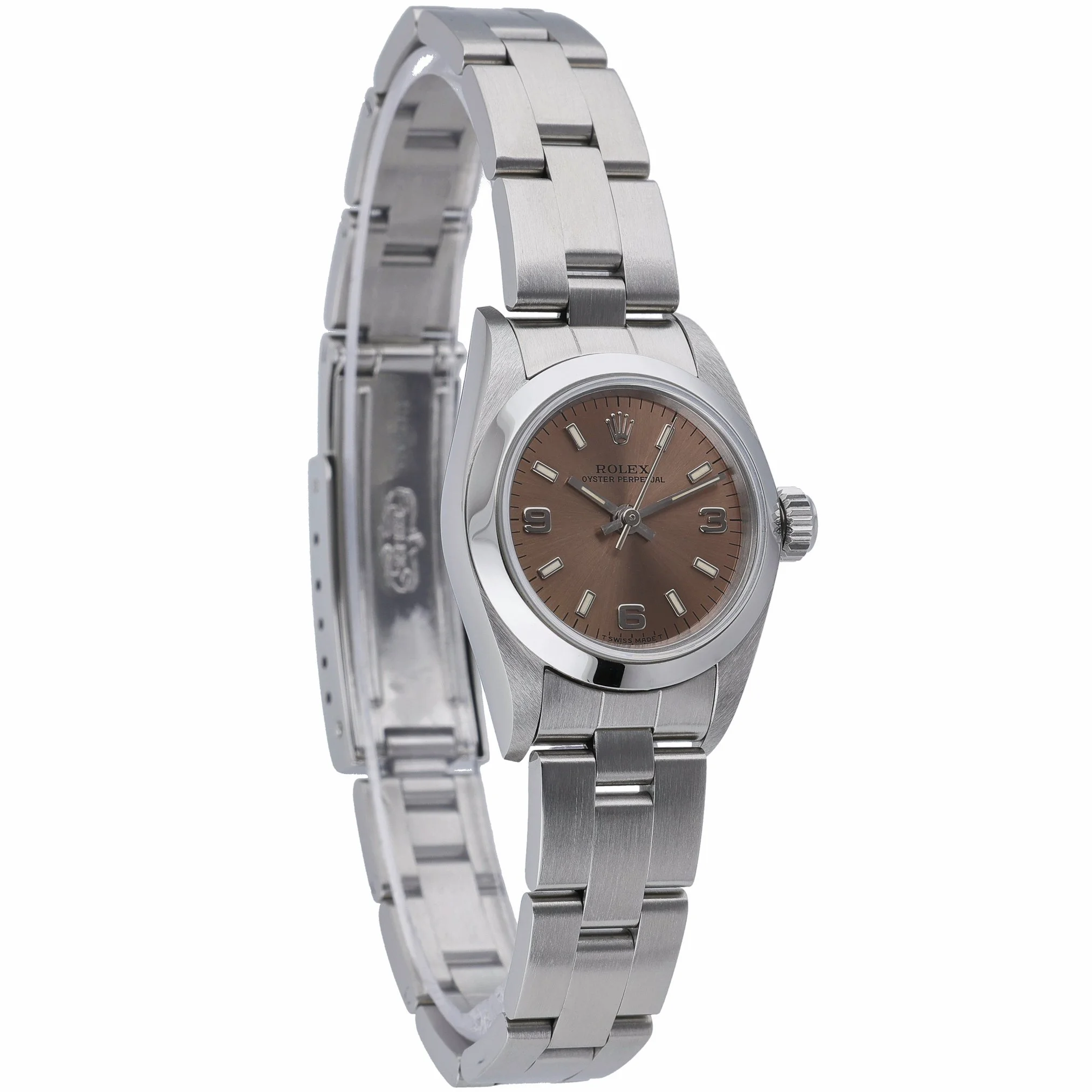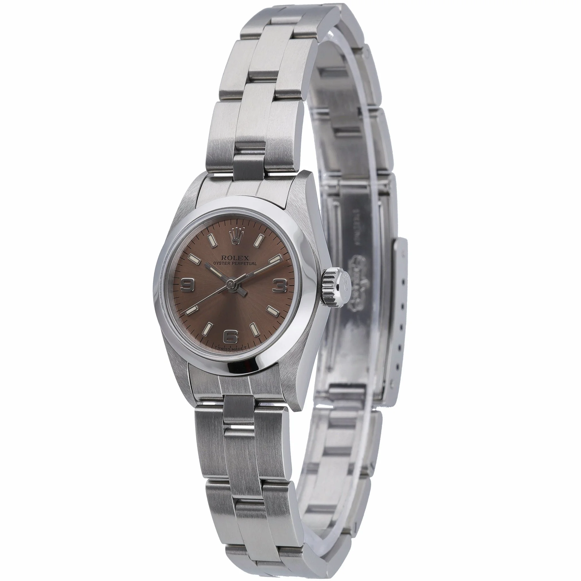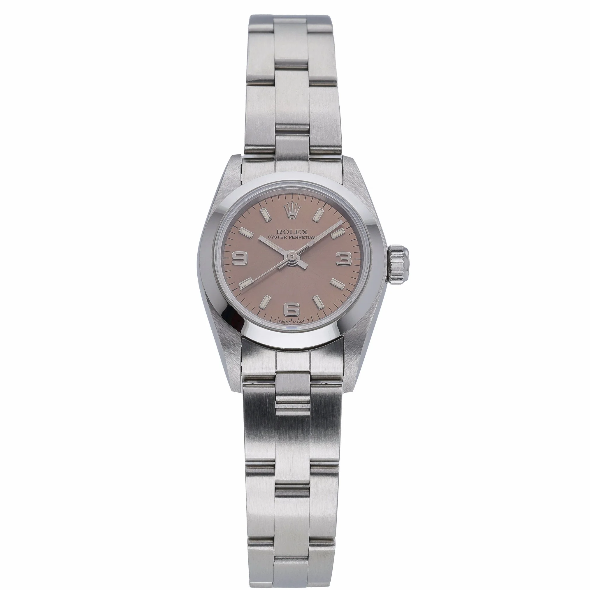 Rolex Oyster Perpetual 26mm (Ref. 67180), a 1996 ladies’ model crafted in robust Oystersteel with a smooth domed bezel and a distinctive salmon Arabic dial. Powered by an automatic movement, it features a sapphire crystal for clarity and durability, 100M water resistance for confident daily wear, and the classic Oyster bracelet with Oysterclasp for secure comfort. Presented in excellent condition, this watch is supplied with its original box and papers for added provenance. Enjoy peace of mind with our 2 Year Warranty, Prompt Delivery, and a 14 Day Return Policy. BQ Ref: 53258.