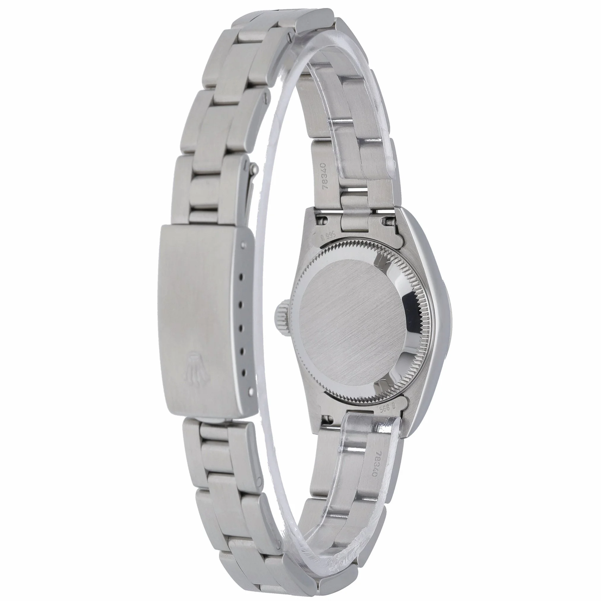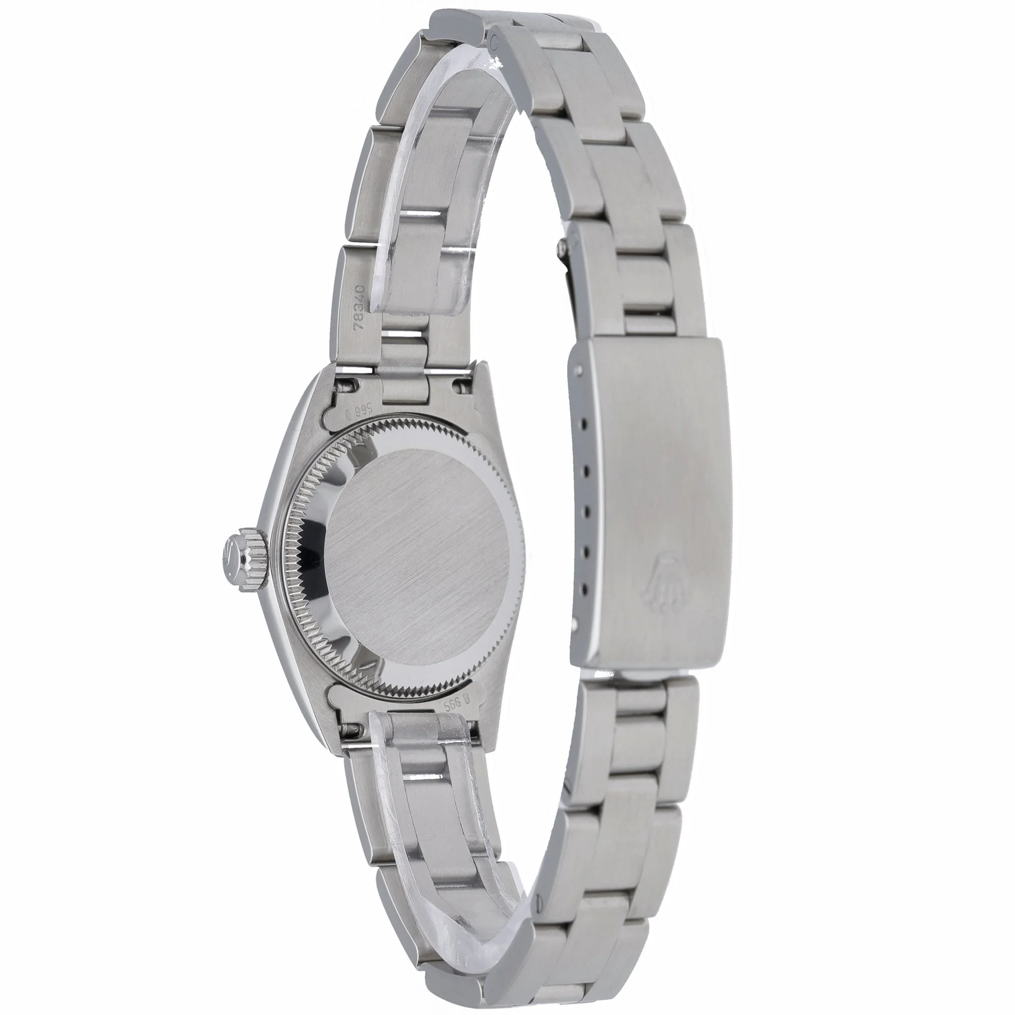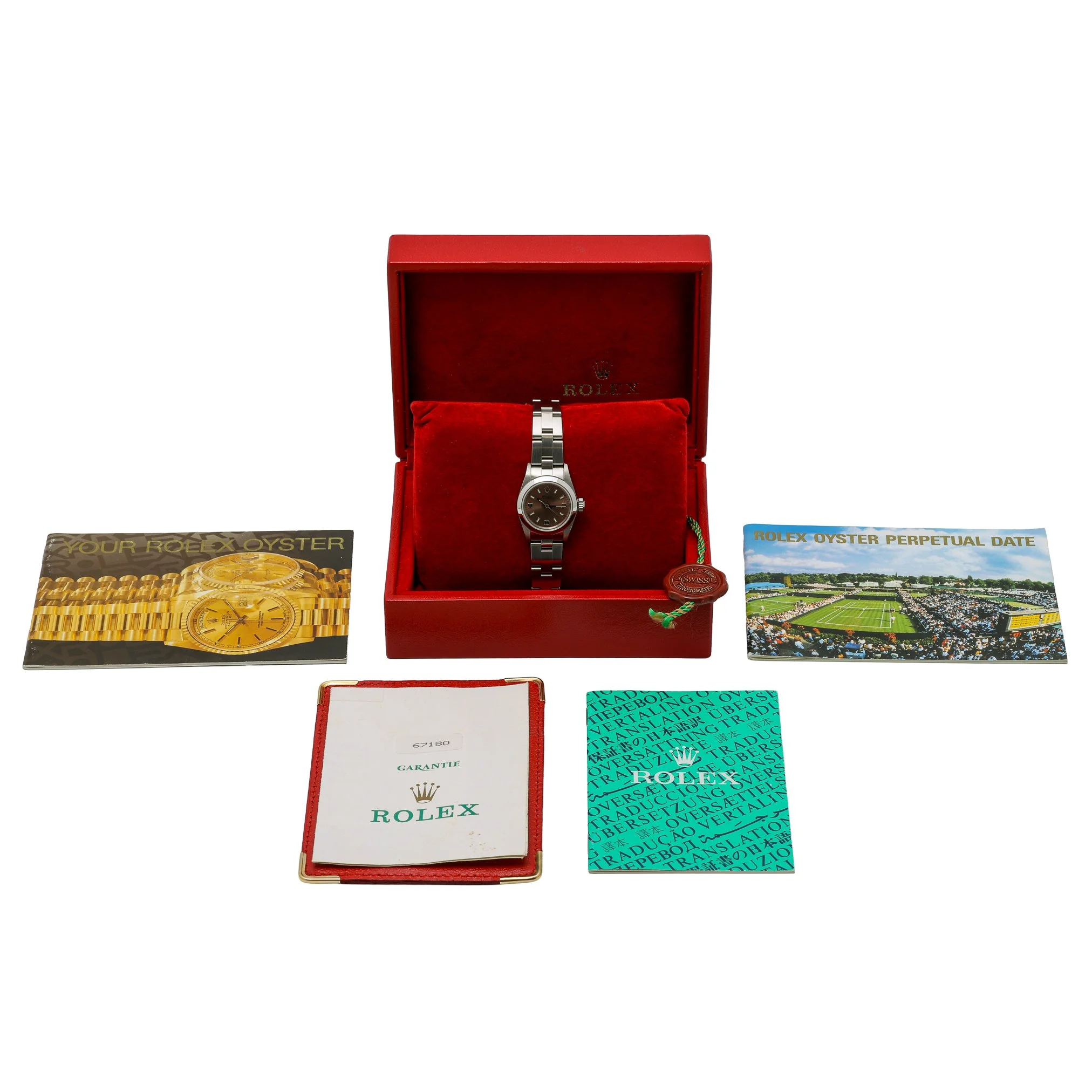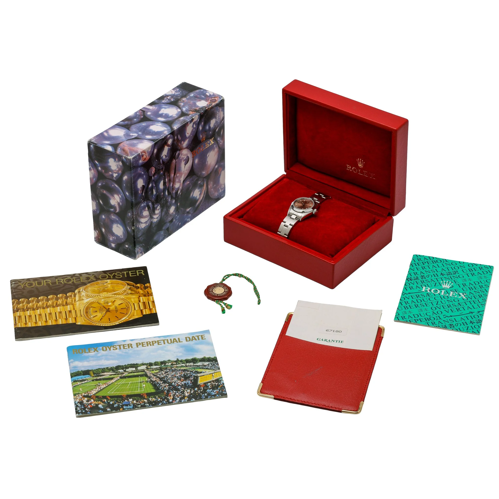 Rolex Oyster Perpetual 26mm (Ref. 67180), a 1996 ladies’ model crafted in robust Oystersteel with a smooth domed bezel and a distinctive salmon Arabic dial. Powered by an automatic movement, it features a sapphire crystal for clarity and durability, 100M water resistance for confident daily wear, and the classic Oyster bracelet with Oysterclasp for secure comfort. Presented in excellent condition, this watch is supplied with its original box and papers for added provenance. Enjoy peace of mind with our 2 Year Warranty, Prompt Delivery, and a 14 Day Return Policy. BQ Ref: 53258.