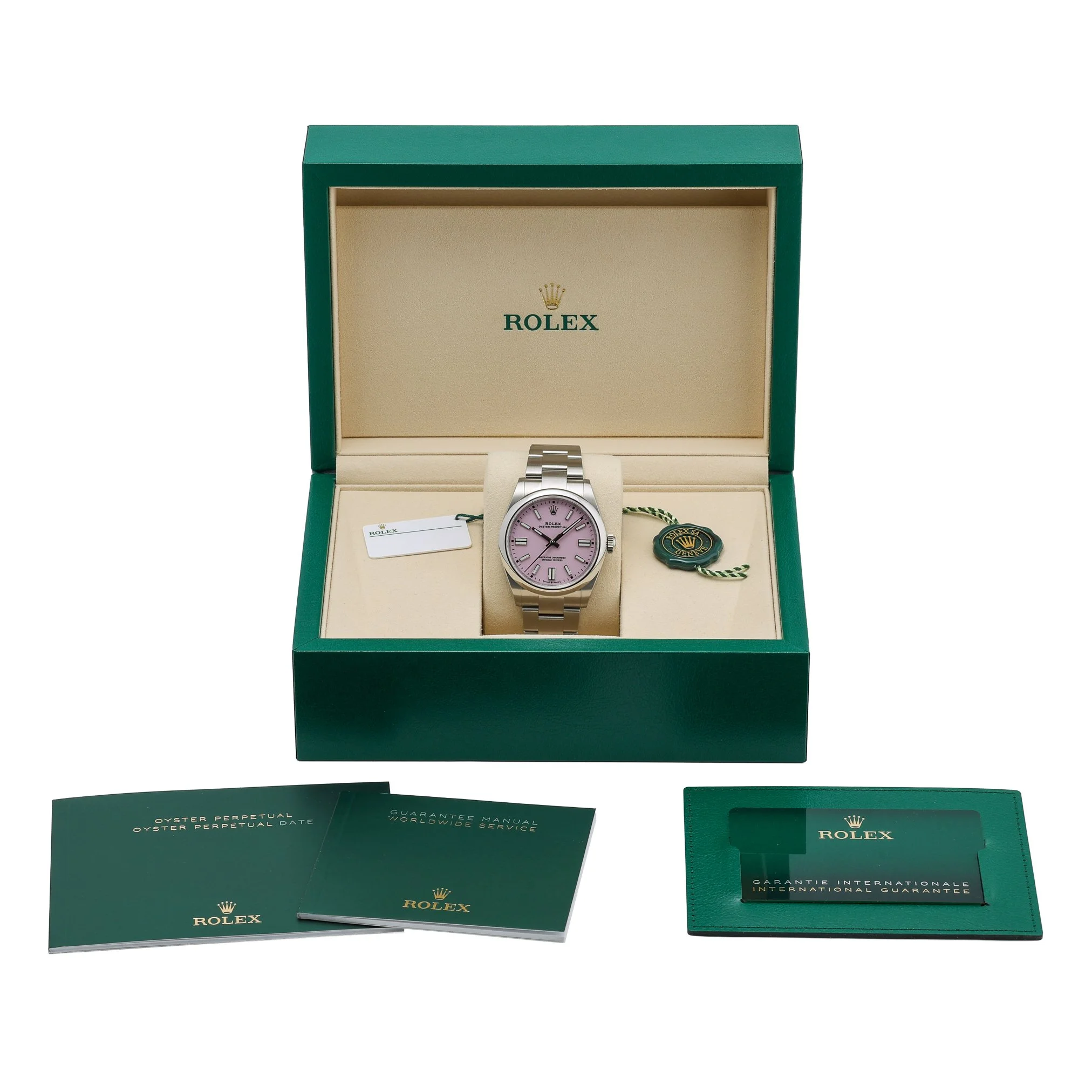 Presenting the Rolex Oyster Perpetual 41 (ref. 134300), a new/unworn 2026 model in robust Oystersteel with a striking pink dial. This 41mm timepiece pairs everyday versatility with Rolex precision, featuring a domed bezel, plain dial layout, and scratch‑resistant sapphire crystal. The automatic movement is complemented by the iconic Oyster bracelet and secure Oysterclasp, while 100M water resistance ensures confident wear in any setting. Supplied complete with Rolex box, original papers, and white tag (BQ Ref: 52885). Backed by a 5-year manufacturer’s warranty that runs from the date of manufacture, plus our 14-day return policy and next day delivery for your convenience.
