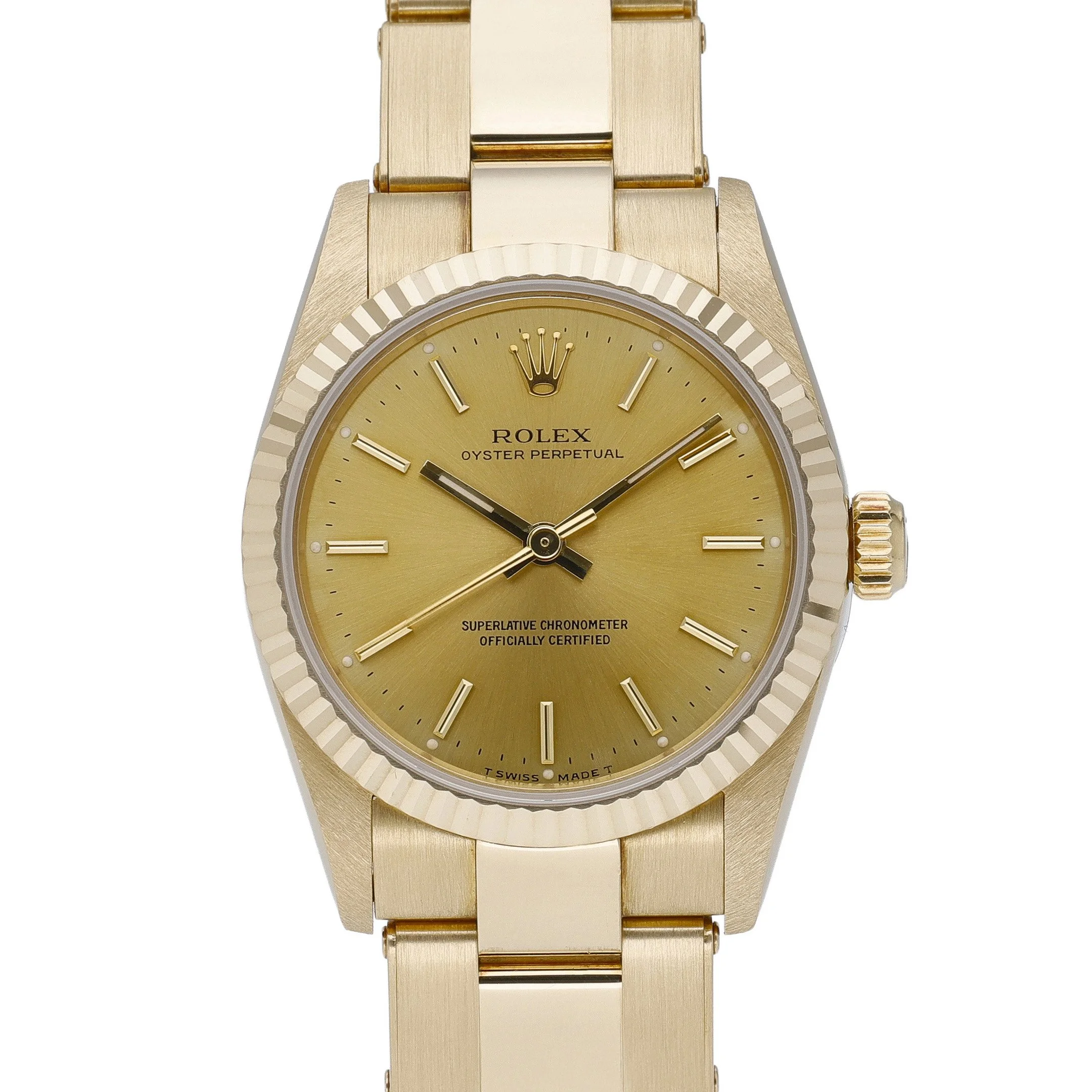 Timeless and refined, this Rolex Oyster Perpetual Ref. 67518 (BQ Ref 53008) is a 31mm gents model from 1990 in excellent condition. Crafted entirely in 18ct yellow gold, it features a classic fluted bezel, matching Oyster bracelet with folding clasp, and a warm champagne baton dial protected by scratch‑resistant sapphire crystal. Powered by Rolex’s reliable automatic movement and water resistant to 100M, it balances everyday versatility with unmistakable prestige. Supplied with its original box and papers, this piece includes our 2 Year Warranty, a 14 Day Return Policy, and Prompt Delivery for your convenience. A distinguished choice for collectors and enthusiasts seeking enduring style and heritage.