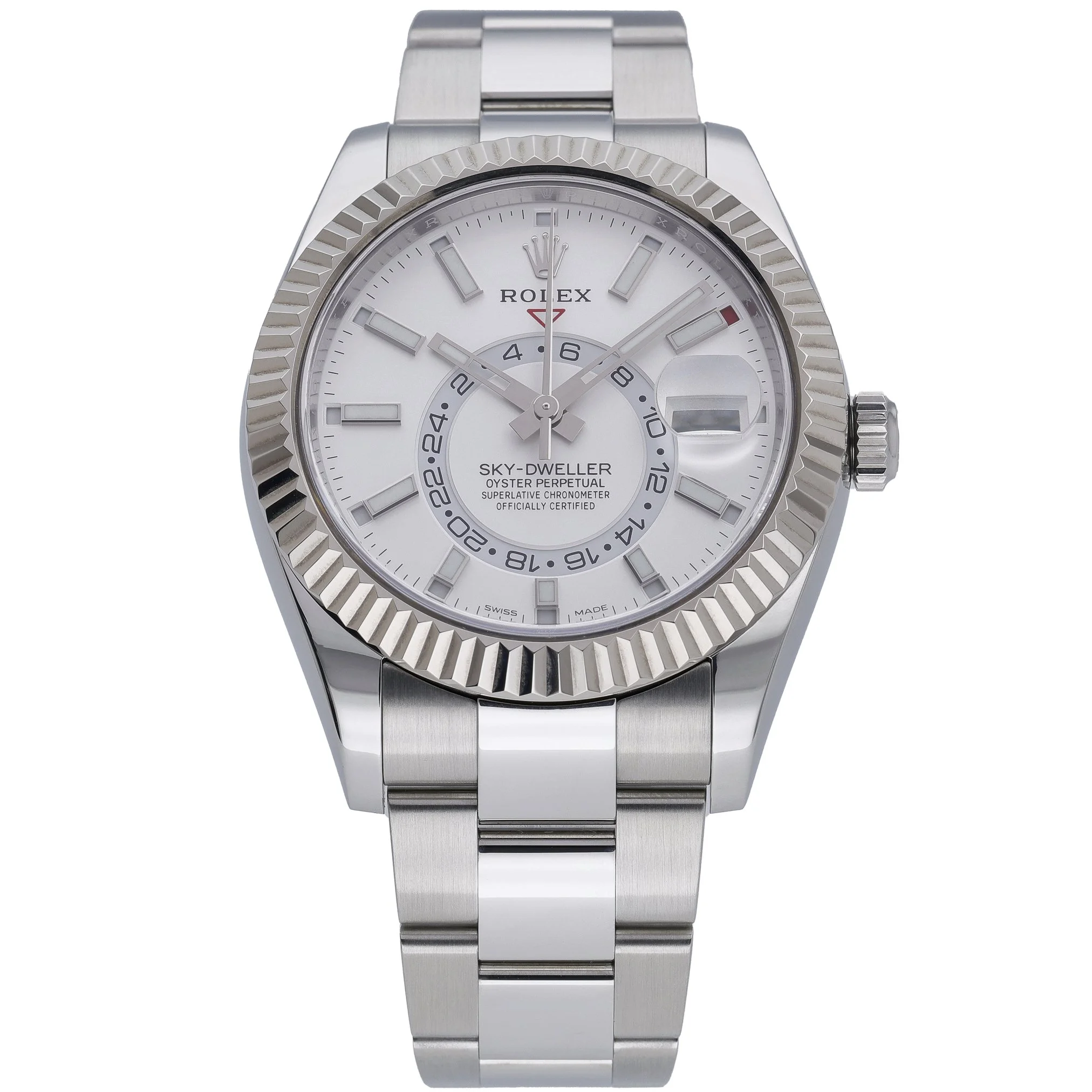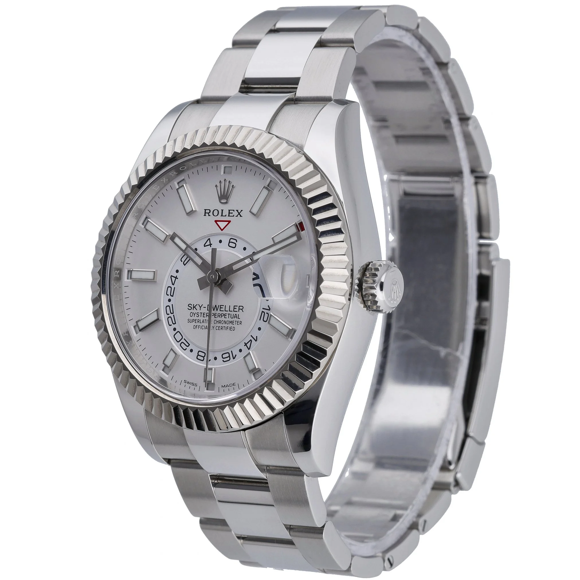 Rolex Sky-Dweller 326934, BQ Ref 52795. A refined 42mm companion for the global traveler, crafted in steel with a white gold fluted bezel and presented on the robust Oystersteel Oyster bracelet with Oysterclasp. The crisp white dial integrates the Sky-Dweller’s signature annual calendar and dual time functionality, powered by a precise automatic movement, and protected by scratch‑resistant sapphire crystal. Water resistant to 100m, this 2018 example is in excellent condition and comes complete with its box, original papers, and white tag. Supplied with a 2 Year Warranty, plus the reassurance of our 14 Day Return Policy and Prompt Delivery. A sophisticated blend of utility and prestige from Rolex’s most advanced classic travel watch.