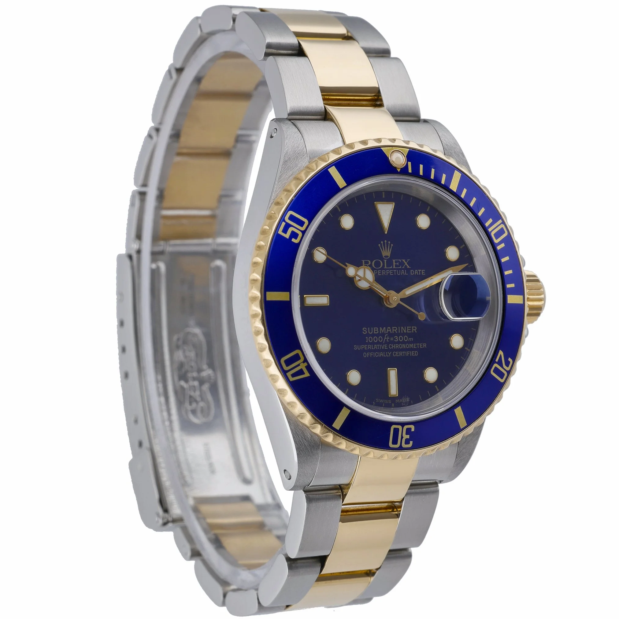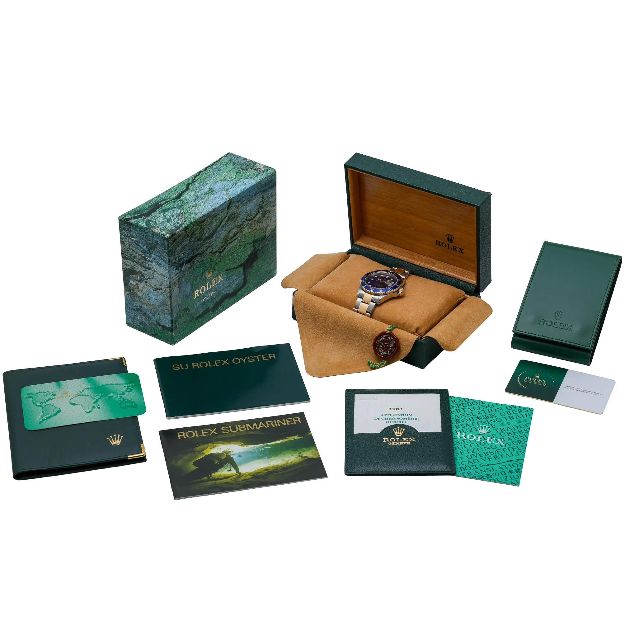 Experience the enduring appeal of the Rolex Submariner 16613LB, a two-tone classic in excellent condition. This 40mm model pairs steel and yellow gold with a striking blue dial, protected by sapphire crystal and framed by a unidirectional rotatable bezel. Powered by an automatic movement and water resistant to 300M, it’s engineered for reliability from sea to city. The watch is fitted with the iconic Oyster bracelet and secure Oysterlock clasp for confident daily wear. Year of manufacture: 2002. Supplied with original box, papers, and green tag. Offered with a 2 Year Warranty, 14 Day Return Policy, and Prompt Delivery. BQ Ref: 53029.